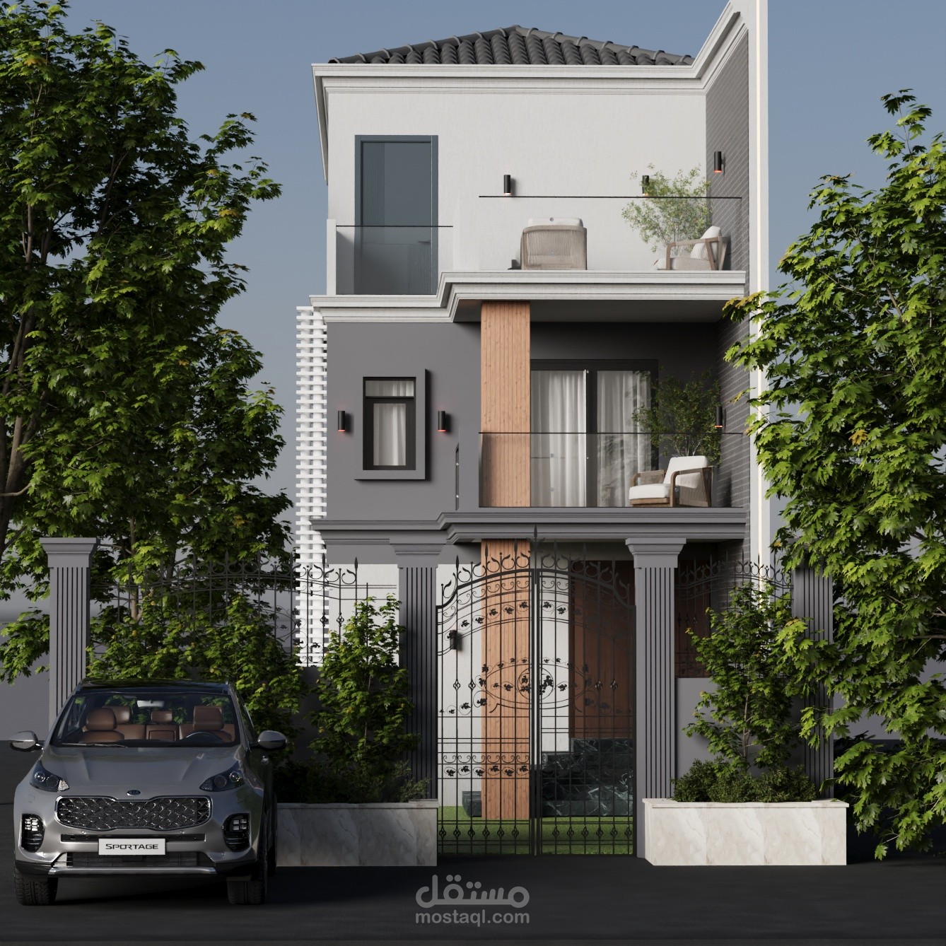 تكتمل جمالية الواجهة بالإضاءة الخفية الليلية التي تُبرز تفاصيل التصميم وتمنح الفيلا حضورًا راقيًا يلفت الأنظار.