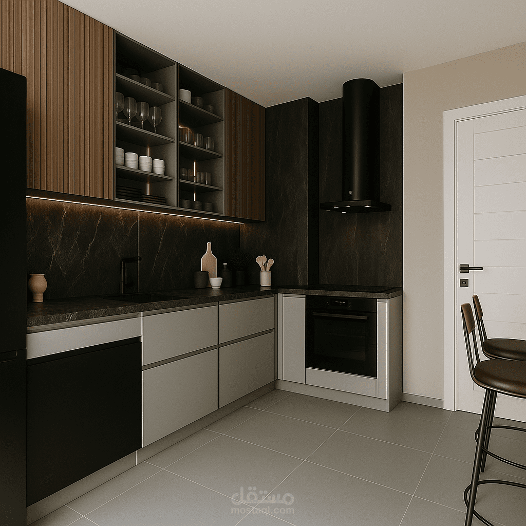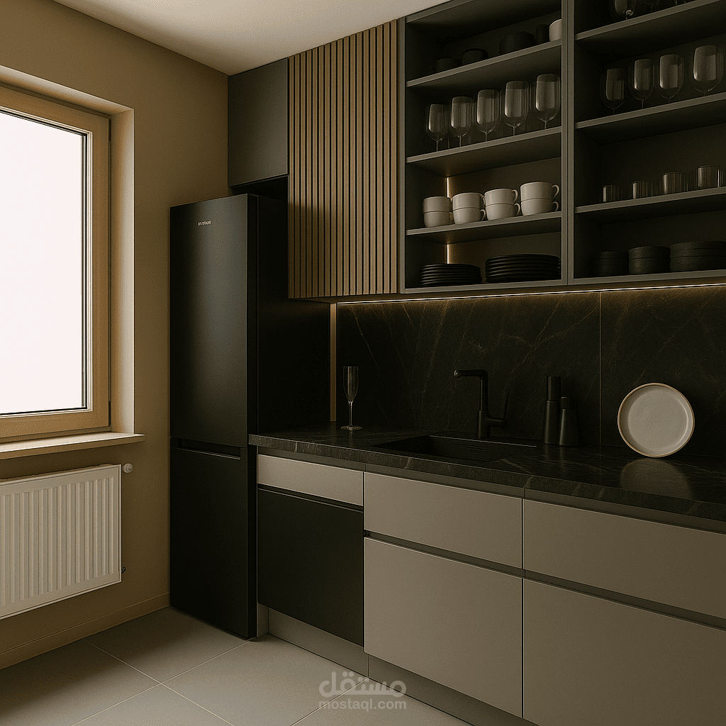 تصميم مطبخ عصري يتميز بتوازن بصري أنيق بين الألوان الدافئة والخامات الفاخرة. تم اعتماد لوحة ألوان ترابية محايدة تجمع بين درجات البيج، الأسود، والخشب الطبيعي، ما يعزز من الإحساس بالدفء والراحة ضمن المساحة.