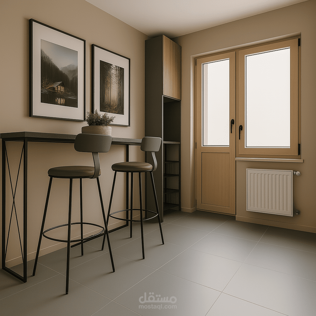 الفراغ مليء بالتفاصيل المدروسة بعناية – من توزيع الإكسسوارات إلى اختيار الصور الجدارية، وكل عنصر يخدم البساطة والأناقة ويعزز من هوية المساحة كمطبخ عملي وعصري في آنٍ معًا.