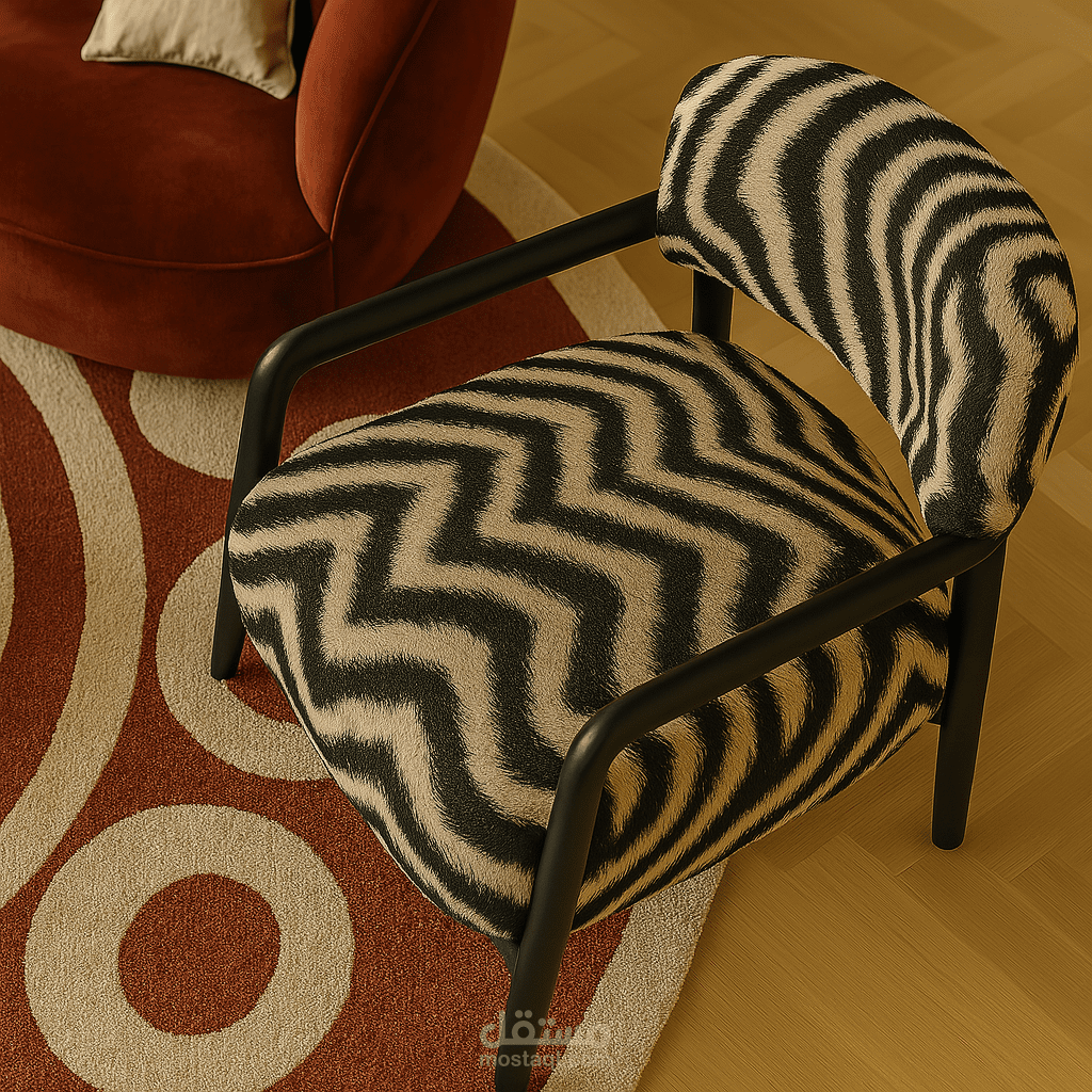 الكرسيان الجانبيان بأقمشة تحمل نقشة الزيبرا والألوان المحايدة يضيفان تنوعًا ملمسيًا وجاذبية، في حين أن الإضاءة الدافئة، سواء من الأباجورات الكروية أو الإضاءة المخفية في السقف، تعزز الإحساس بالراحة والاحتواء.