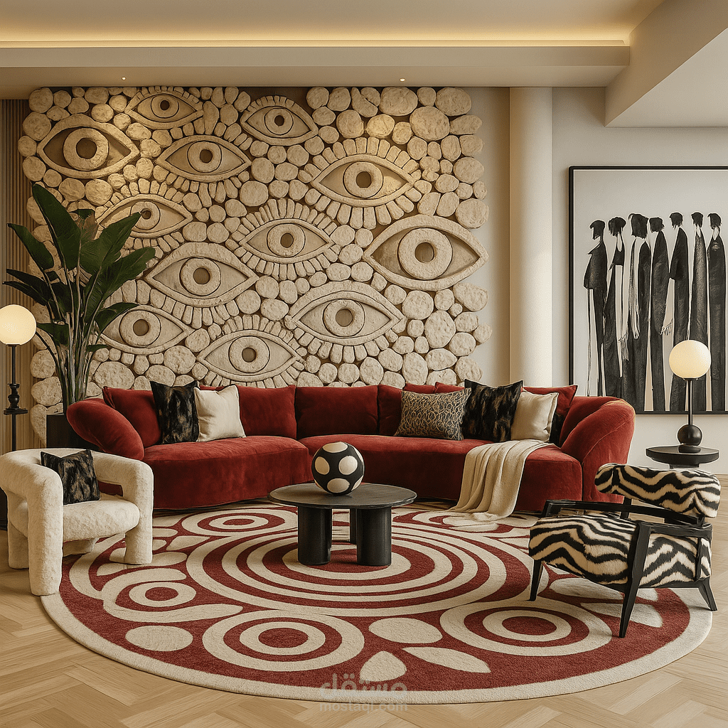 تصميم داخلي لغرفة معيشة يدمج الفن، الجرأة، والراحة ضمن مساحة سريالية معاصرة.