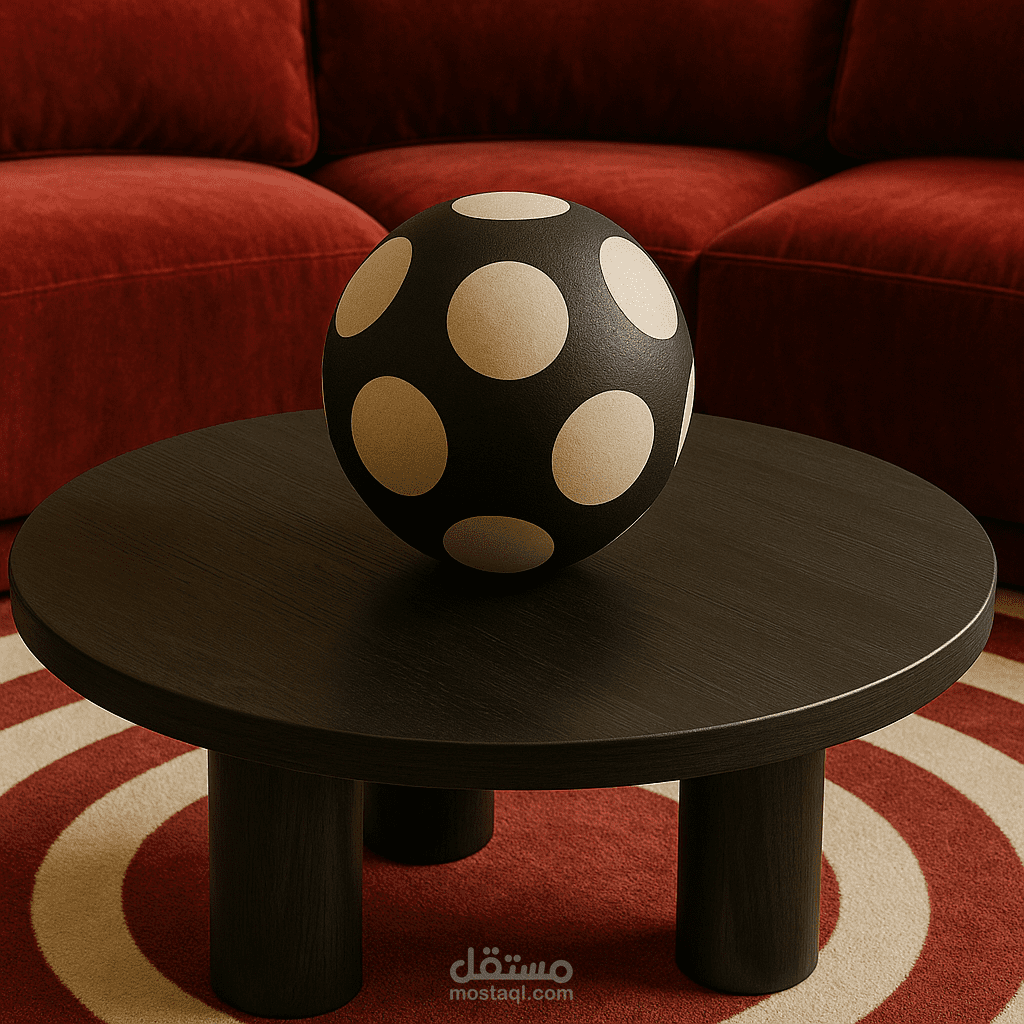 تتوسط الغرفة كنبة مخملية بتدرجات الأحمر الداكن (العنّابي) على شكل حرف L، تشكّل محور الانسجام البصري في المكان. الأرضية مغطاة بسجادة دائرية ذات نمط بصري جريء بألوان الكريمي والأحمر، يتناغم مع شكل الطاولة المستديرة والكرة الفنية الموضوعة فوقها، ما يضيف لمسة تجريدية أنيقة.