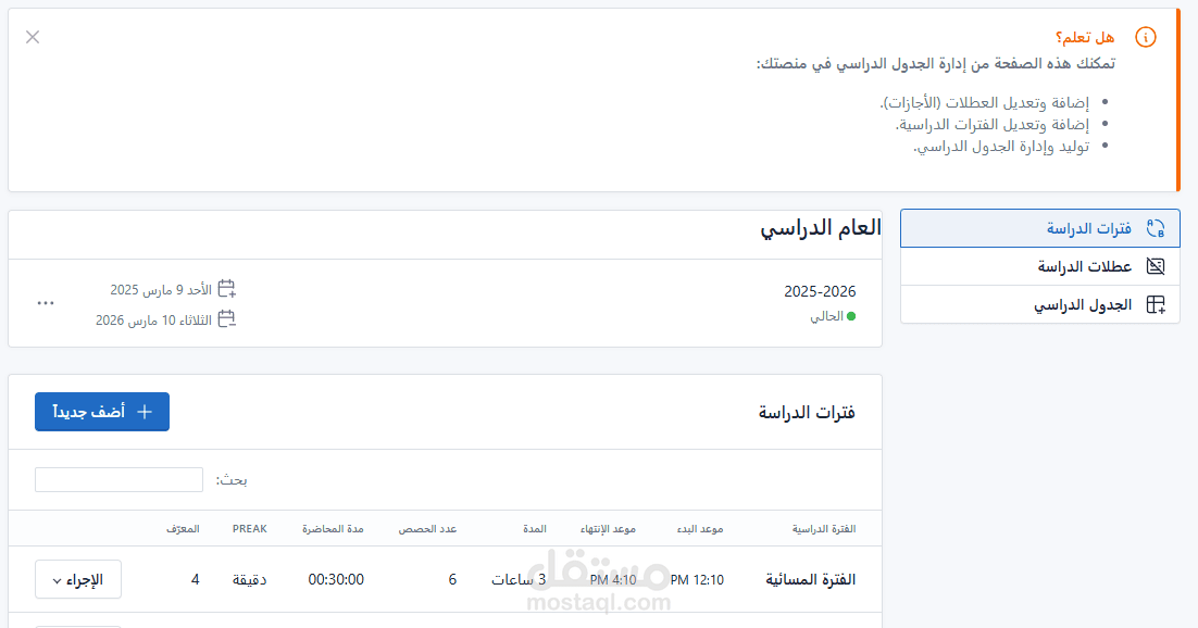 الصورة المرفقة توضح واجهة إدارة السنوات الدراسية داخل النظام، مع إمكانية: