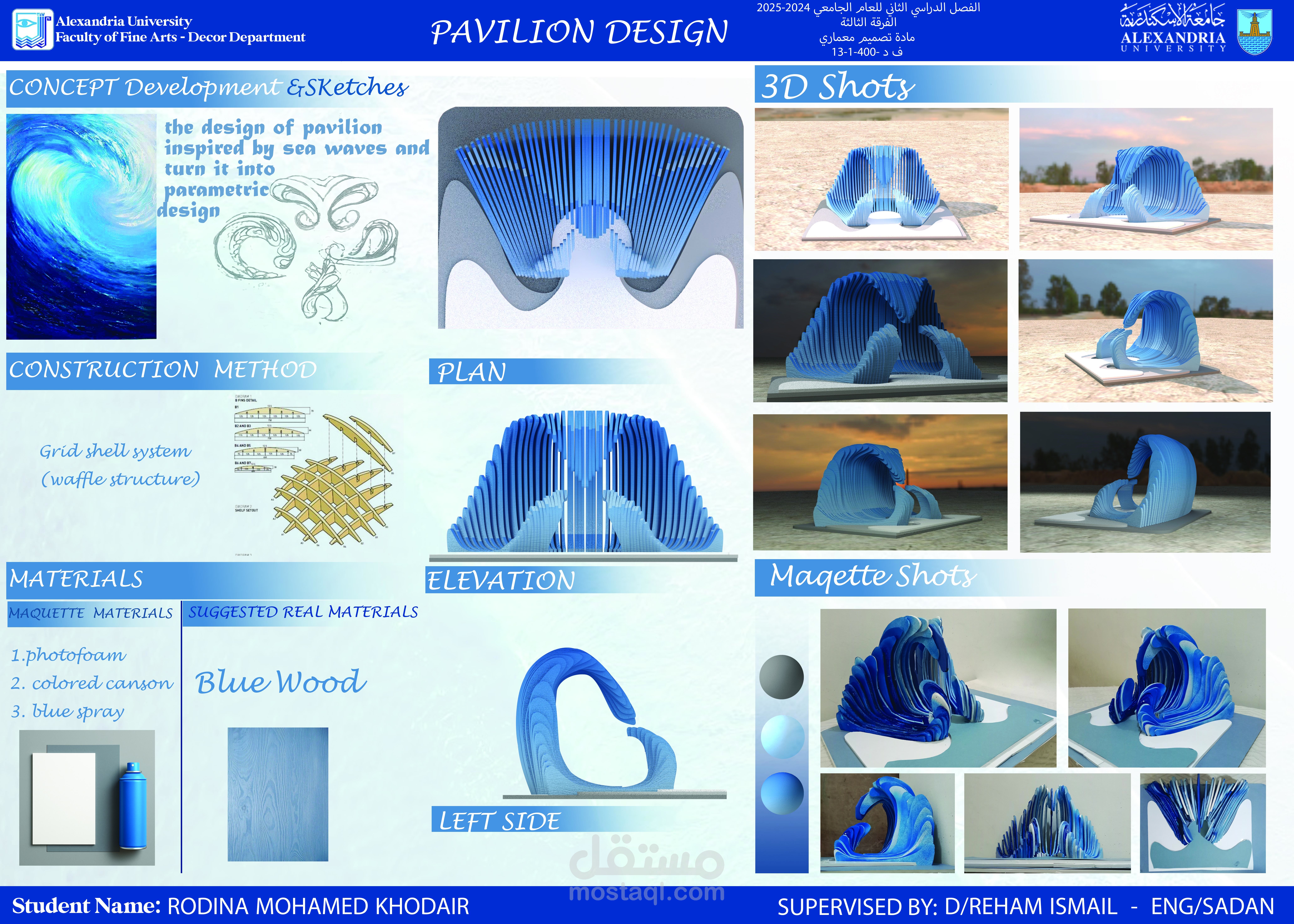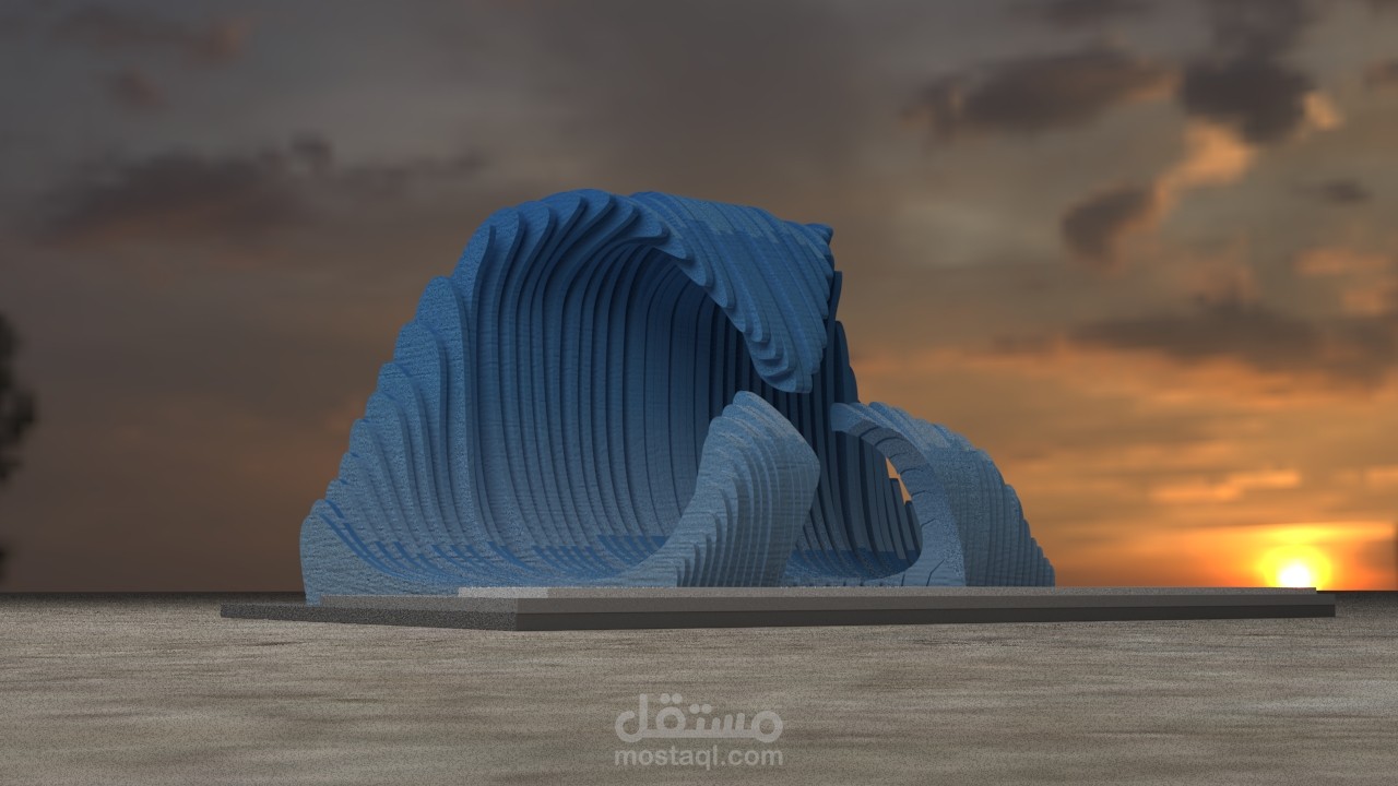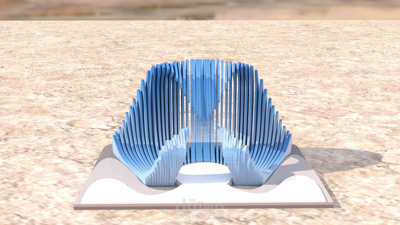 بافيليون (جناح خفيف) يستخدم كمظلة خارجية للسائريين مستوحى من امواج البحر و تحويلها لتصميم بارامتريك يجسد حركة الموجة و محاكتها لتمثل التغطية