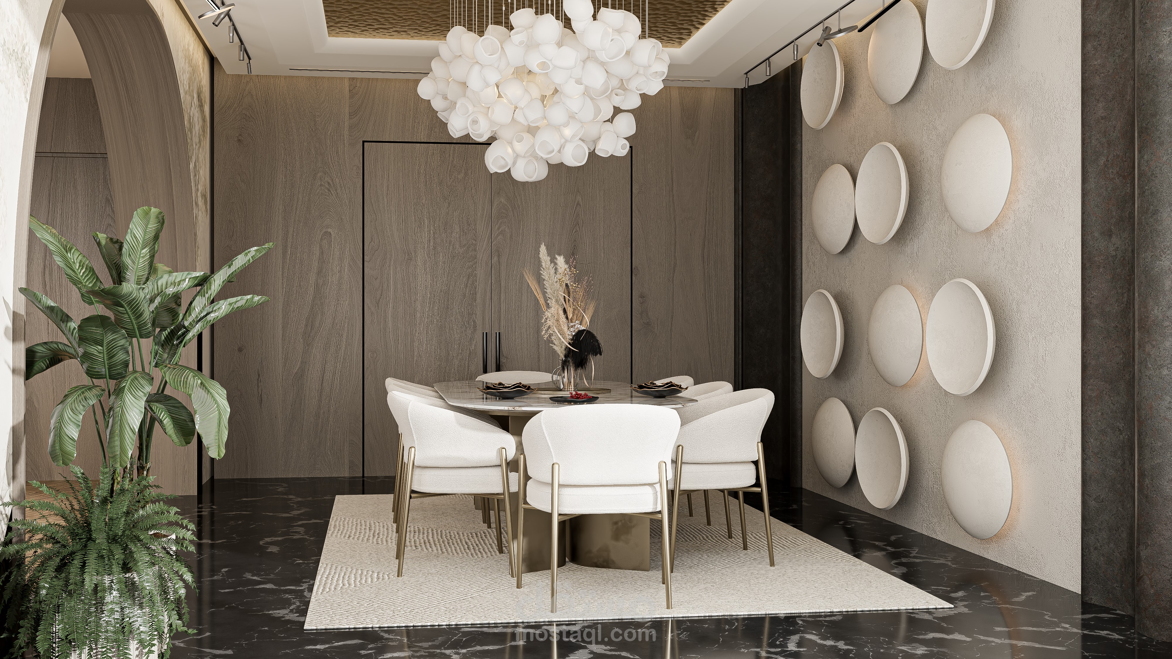 في منطقة الطعام، تتوسط طاولة بيضاوية بسطح رخامي وأرجل نحاسية المساحة، لتمنحها طابعًا فاخرًا، وتحيط بها كراسي بيضاء بتنجيد عصري توفّر توازنًا بين التباين والراحة.