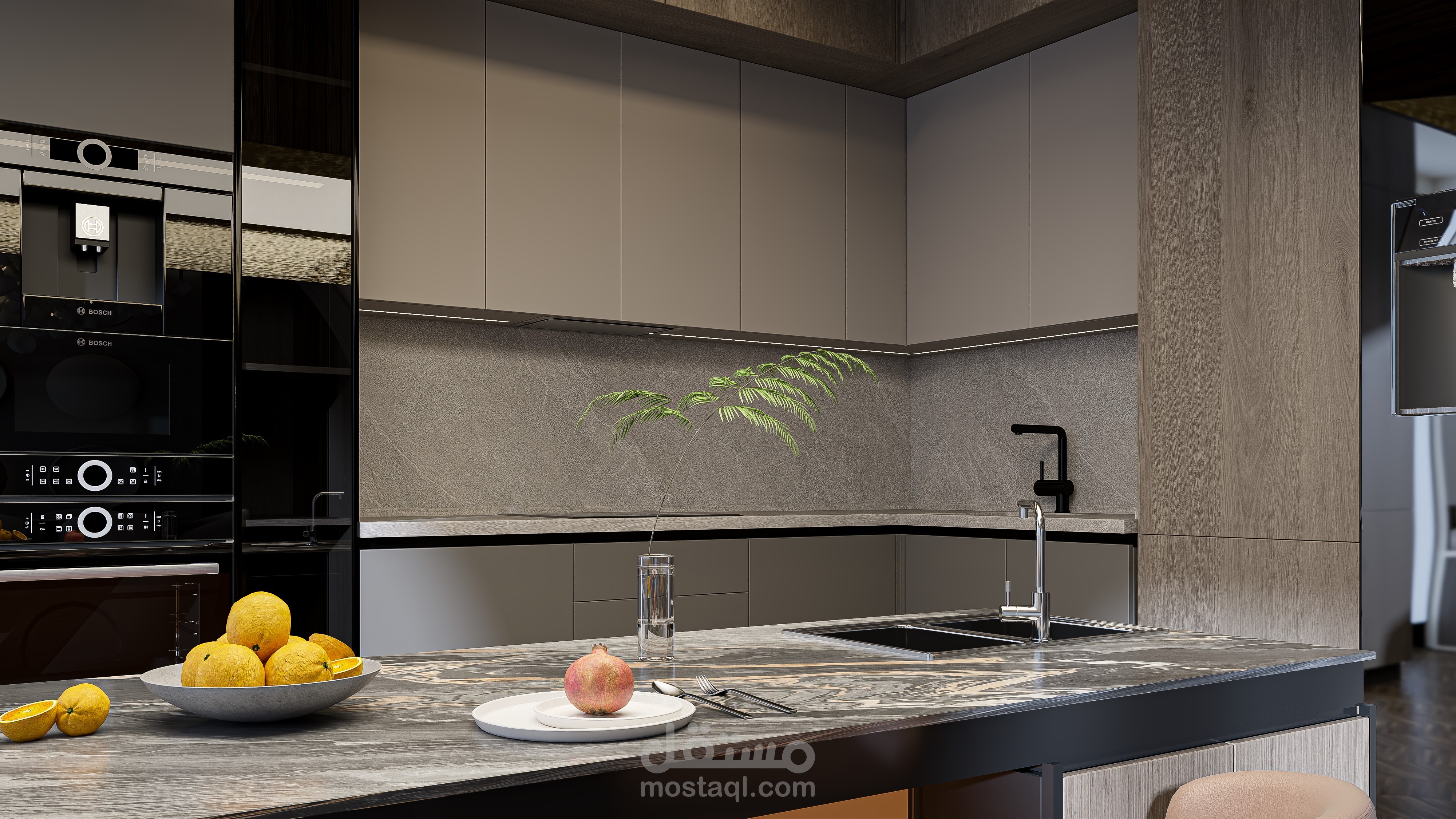 جزيرة المطبخ تأتي بتشطيب معدني غير لامع، وتحتها إضاءة خافتة بلون الكهرمان الشفاف، ما يضفي توهجًا دافئًا يحدد حدود المنطقة برُقي. في الأعلى، تضيف الخزائن المصنوعة من قشرة الخشب الغنيّة دفئًا وتباينًا جميلًا مع وحدات الجدران ذات اللون المطفي المحايد.