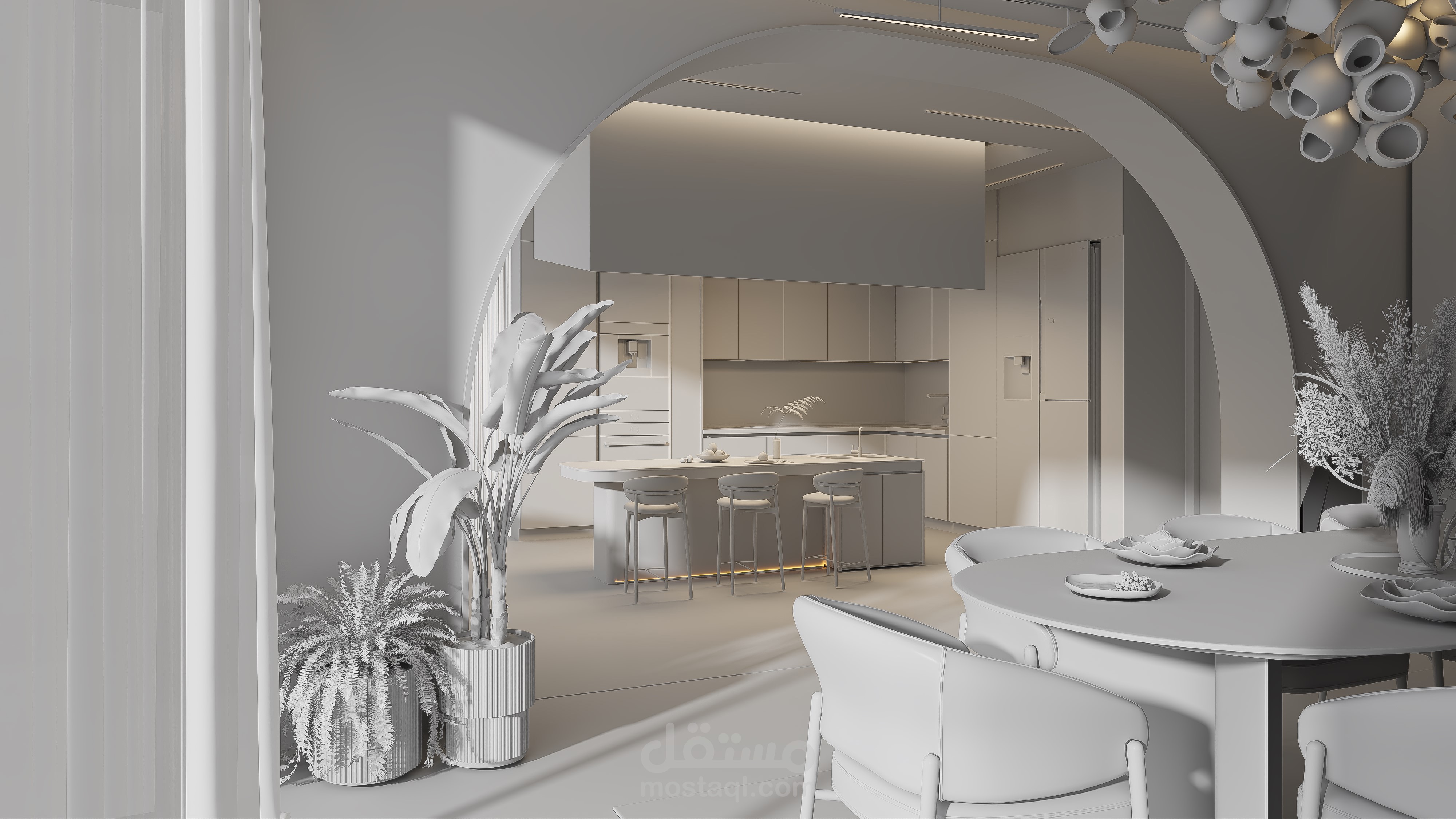 هذه المساحة تمثل مزيجًا متناغمًا من الأناقة العصرية والوظيفة العملية، حيث يندمج المطبخ ومنطقة الطعام بسلاسة تحت طابع تصميمي موحّد يميل إلى البساطة الراقية.