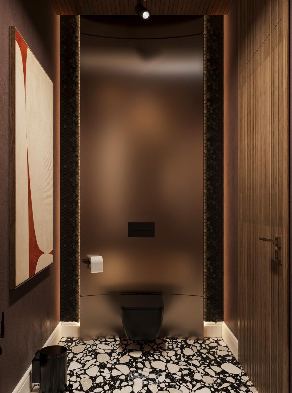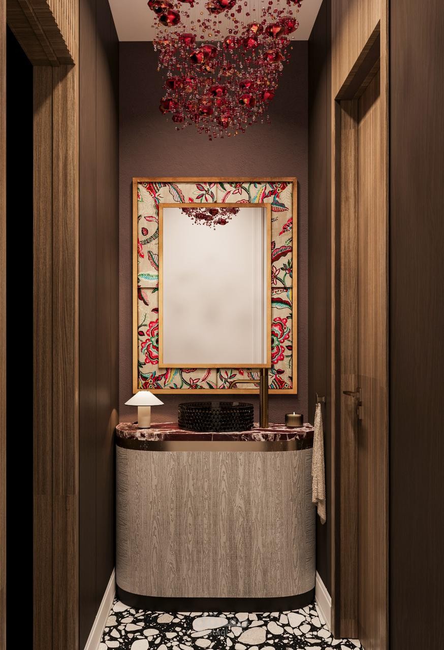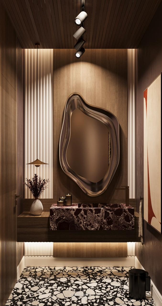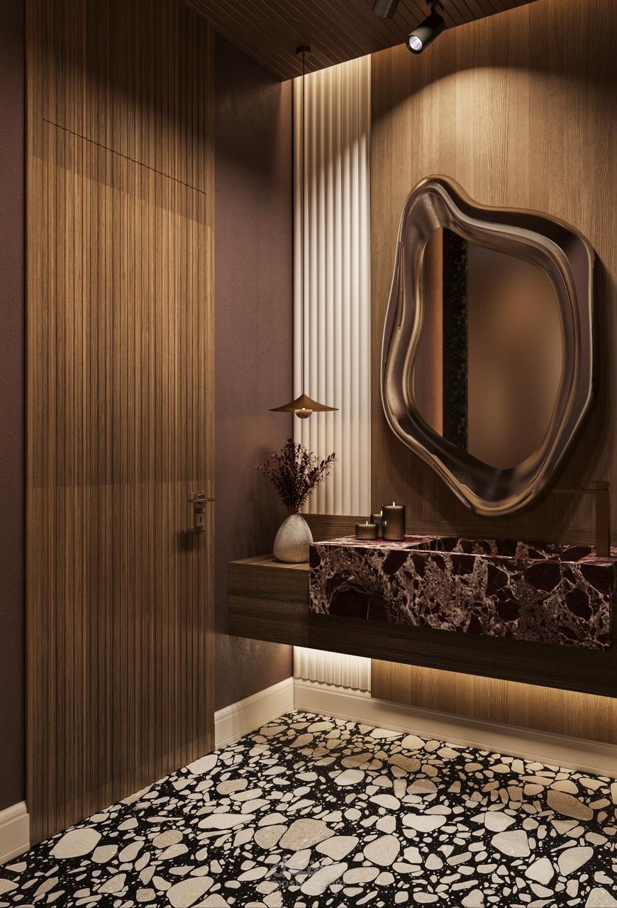 يُجسّد هذا التصميم الداخلي تحفة فنية تجمع بين الحداثة والانسيابية في أدق تفاصيلها. يمتاز الحمّام بمرآة عضوية الشكل تضيف بعدًا فنيًا مميزًا، ينعكس بروعته على جدار خشبي دافئ يضفي إحساسًا بالأناقة والسكينة.