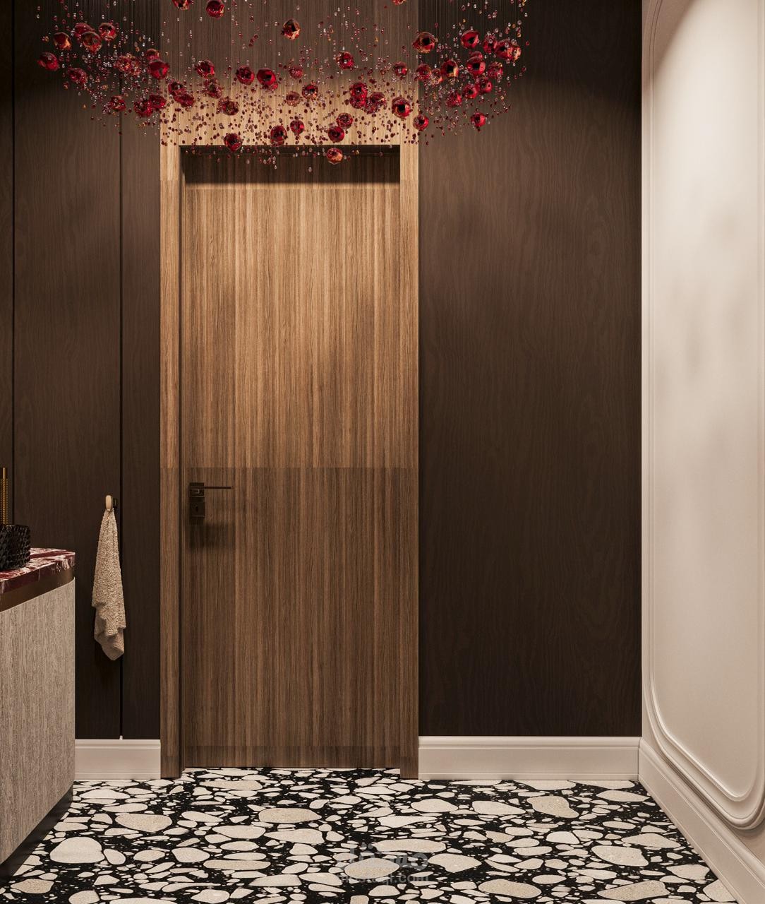 ويأتي الحوض الرخامي بلونه العميق ونقوشه المتناغمة ليكون نقطة ارتكاز بصرية راقية، بينما يُضفي الضوء الخافت المخفي خلف العناصر المعمارية جوًا هادئًا ومترفًا. الأرضية بتصميمها الجريء والمفعم بالحياة تخلق تباينًا ساحرًا مع بقية عناصر الغرفة، مما يمنح المكان طابعًا فريدًا يليق بالذوق الرفيع.