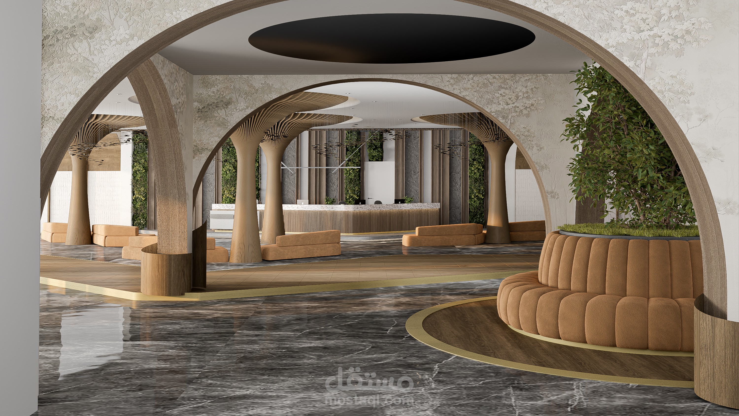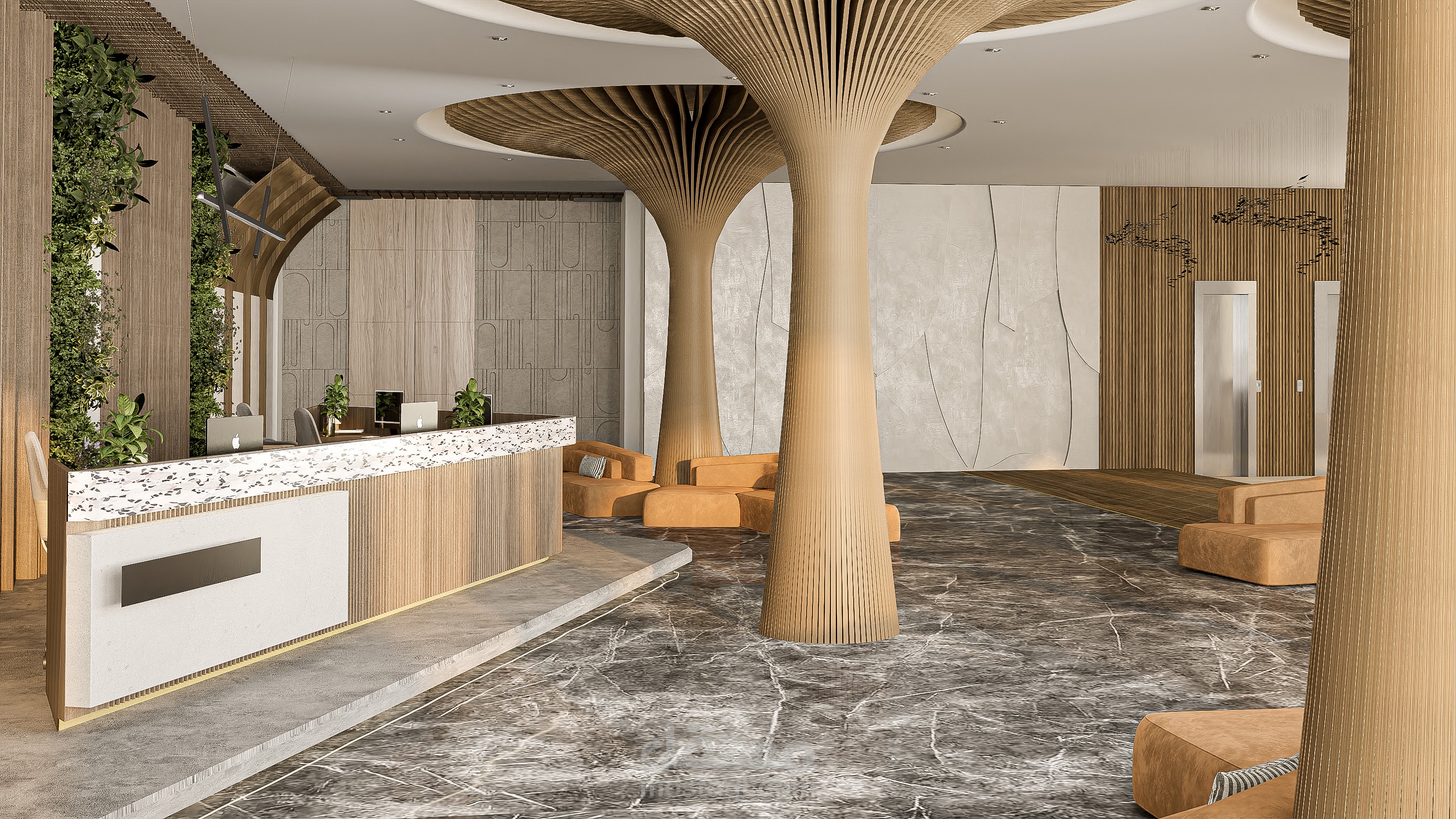 The material palette includes glossy marble flooring, natural wood structures with organic curves, warm-toned leather upholstery, and vertical greenery, all working together to bring a refined and refreshing spatial experience.