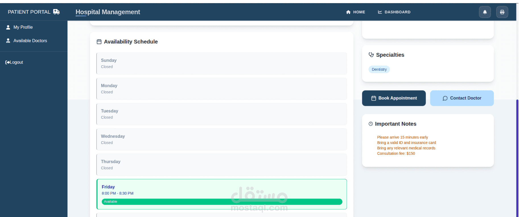 هذا الموقع هو اداره لمستشفي يوجد بيه العديد من الاطباء بالتخصصات المختلفه ويستطيع المرضي التسجيل ورؤيه المواعيد المتاحه لكل طبيب وايا التسجيل معهم وقبل الميعاد يتم تنبيه المريض عن طريق الاشعارات بان الميعاد مع الطبيب اقترب وايضا يستطيع الطبيب ان يقبل او يرفض المواعيد