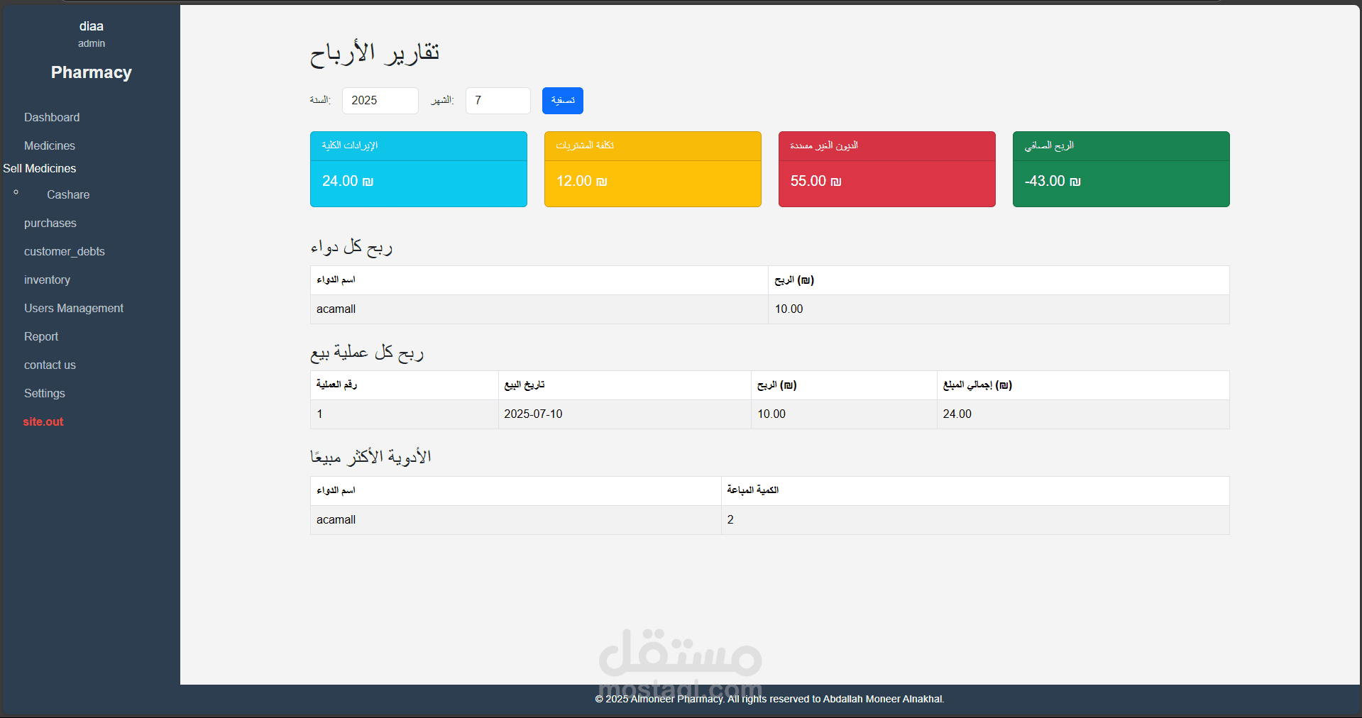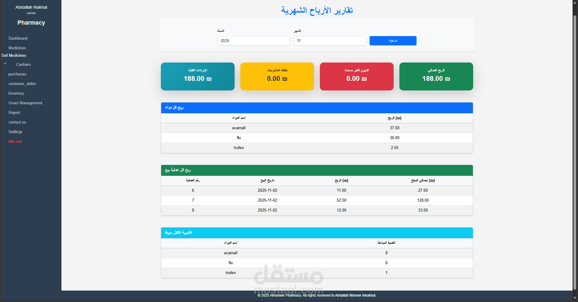 تقارير يومية، شهرية وسنوية للأرباح، تحليل الربح حسب الدواء أو المستخدم، أفضل الأدوية مبيعًا.