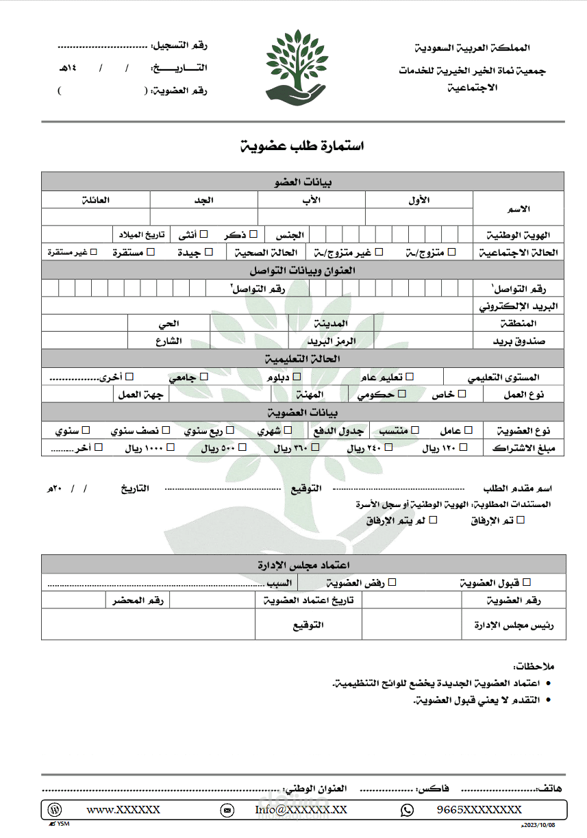 •محتوى النموذج: يشمل الاسم، رقم الهوية، تاريخ الميلاد، العنوان، وسيلة التواصل، توقيع العضو، وغيرها من الحقول.
