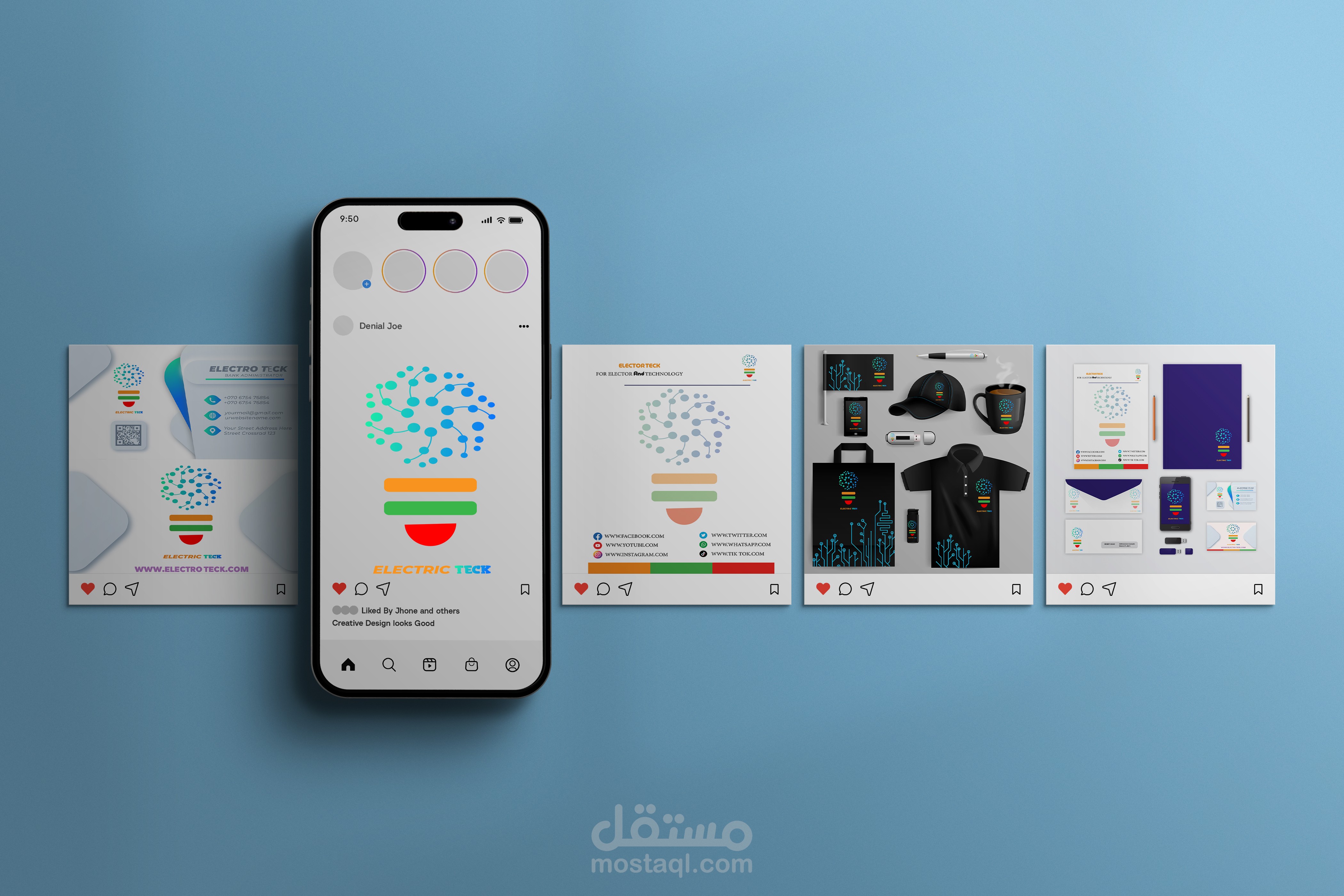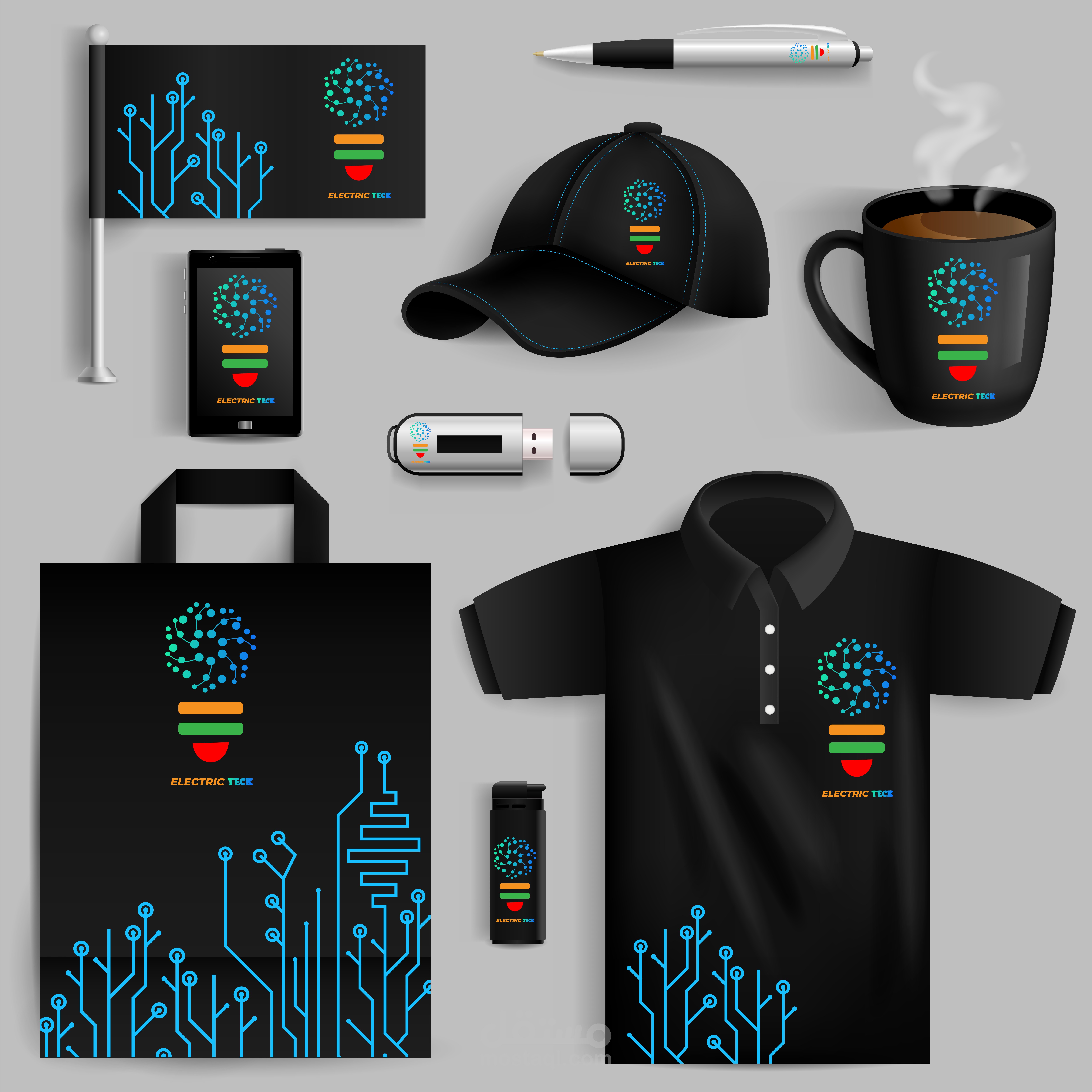 تم تصميم شعار إبداعي لمشروع تقني يُعبّر عن الابتكار والطاقة الذكية، وتم تطبيق الهوية البصرية على مجموعة من العناصر (قبعة، كوب، قميص، حقيبة، USB، وغيرها) لعرض تصور واقعي للعلامة التجارية.