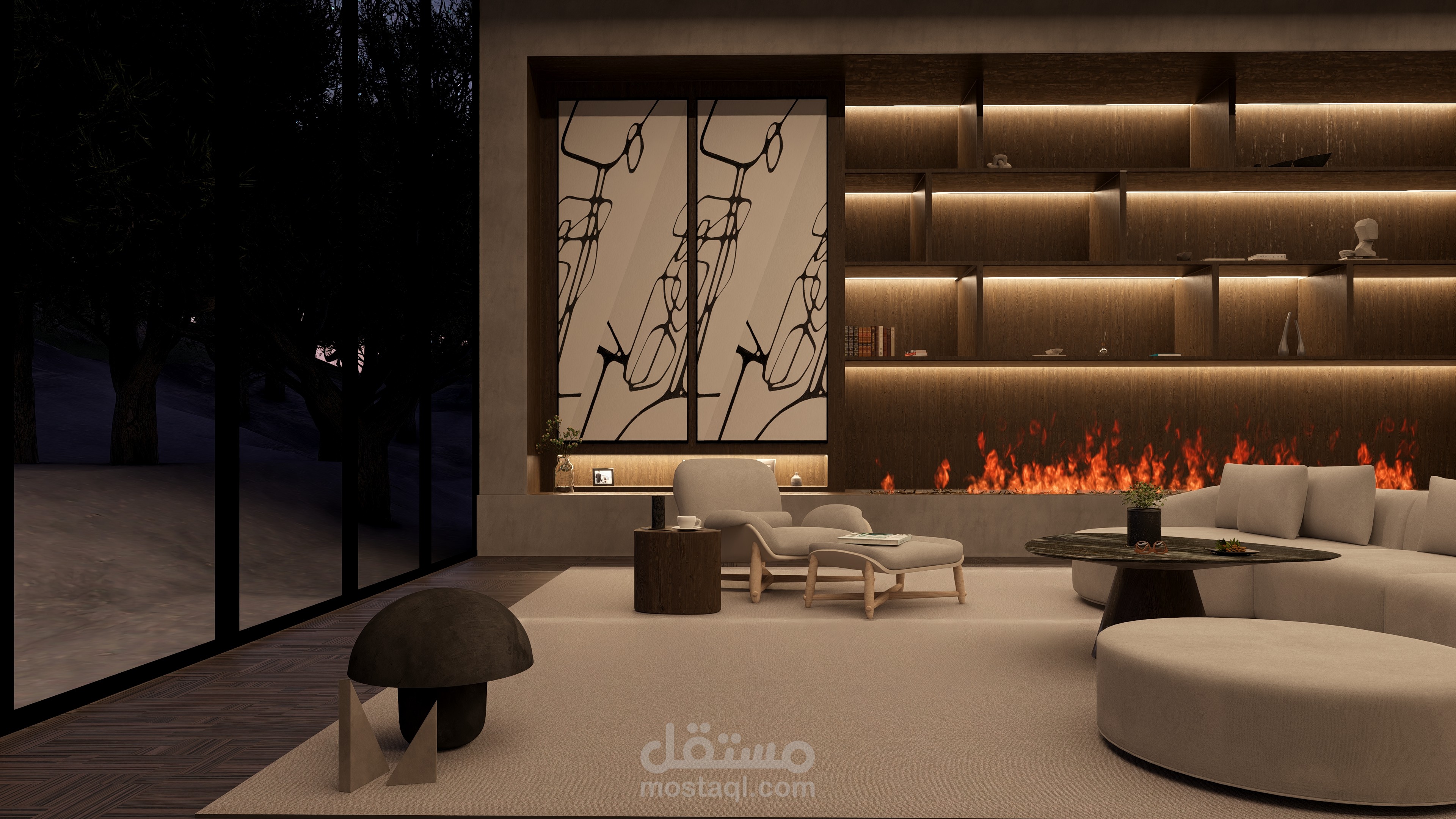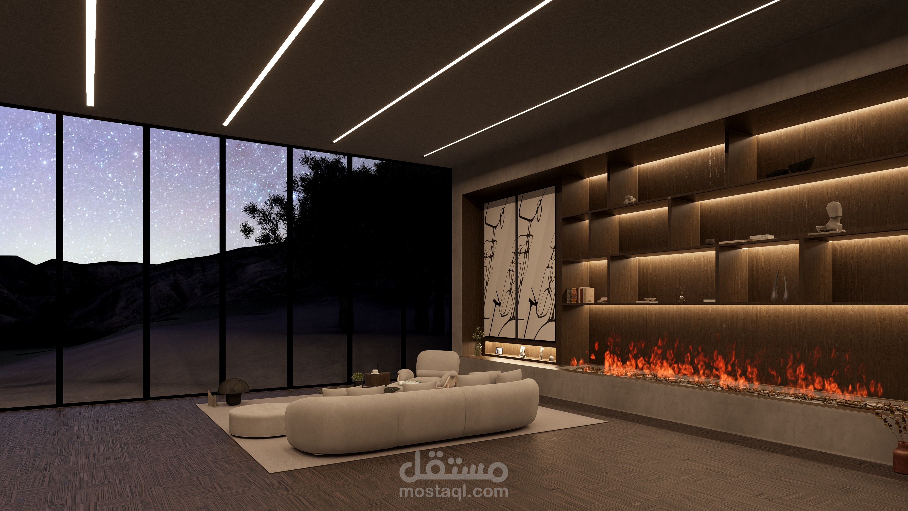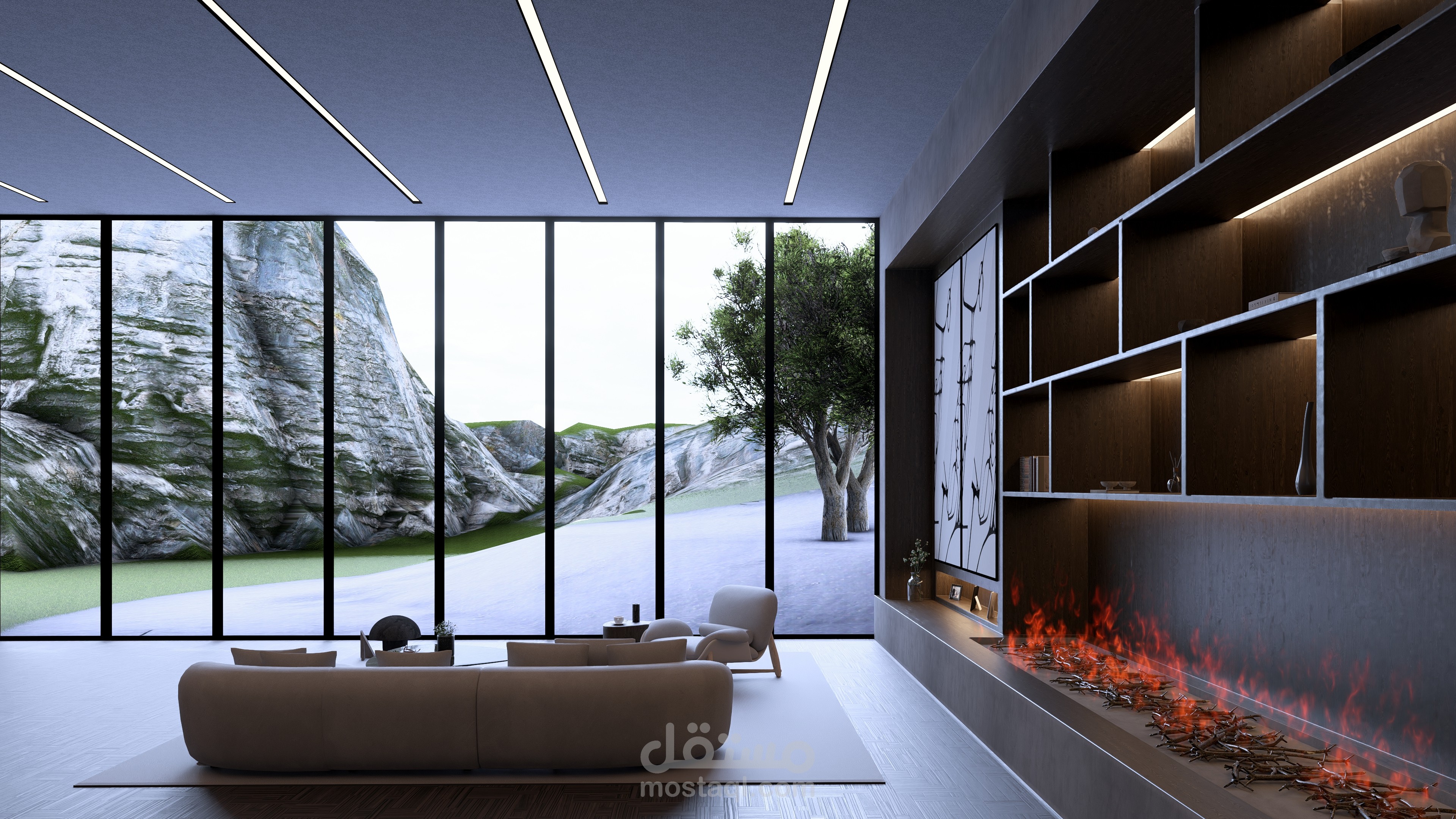 صالة معيشة مودرن مطلة على الجبال بألوان هادئة و خامات من الطبيعة.