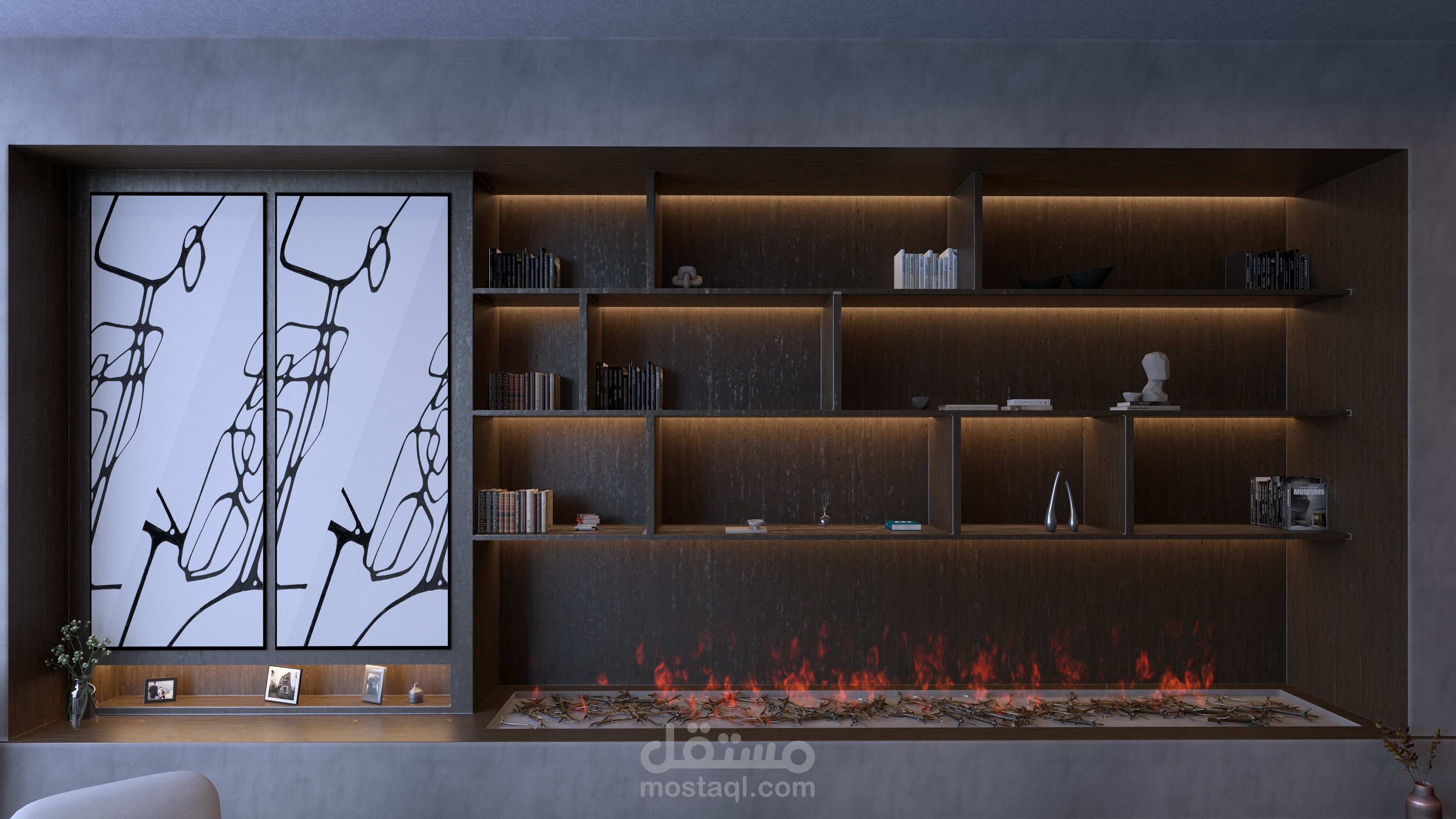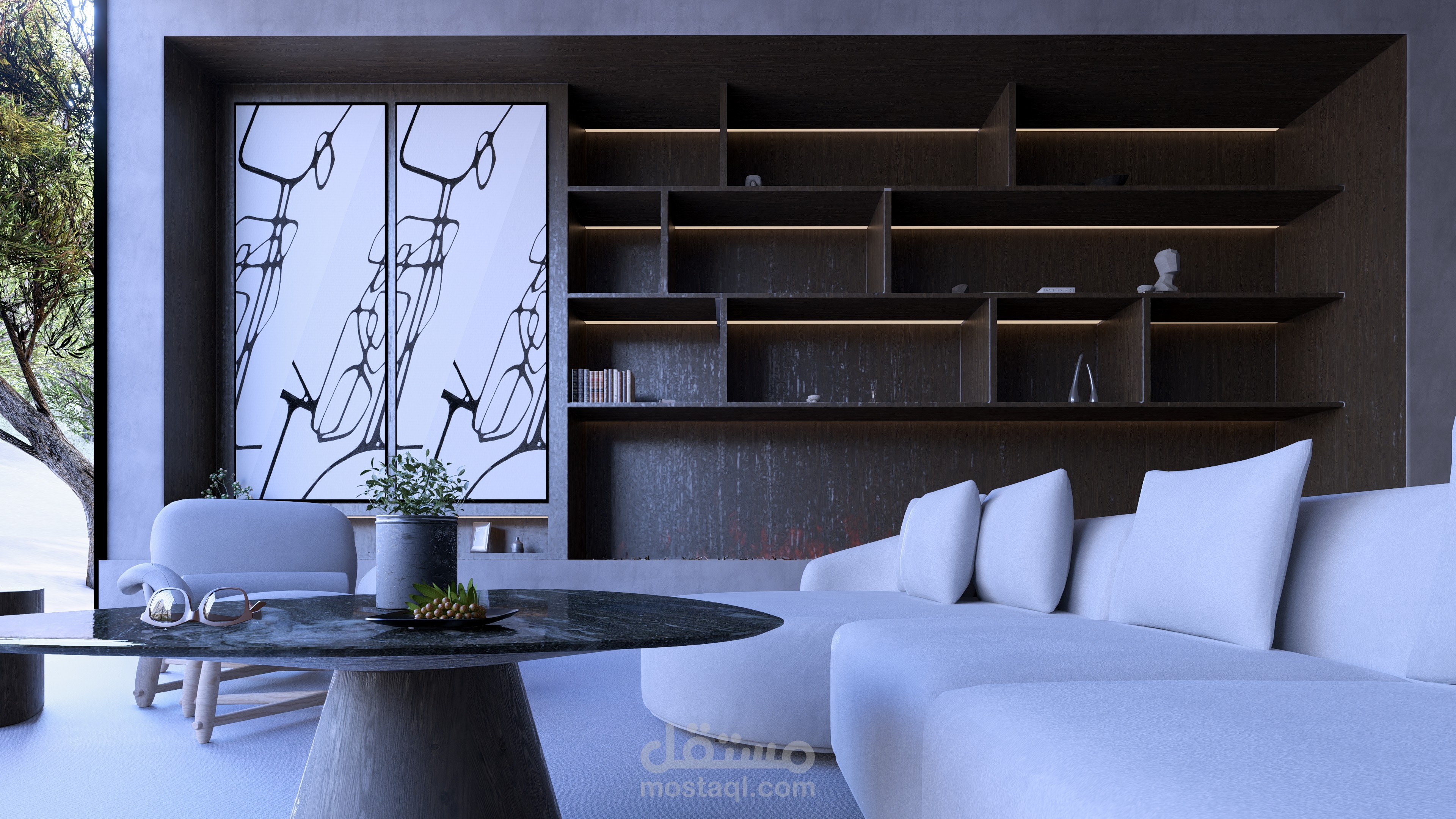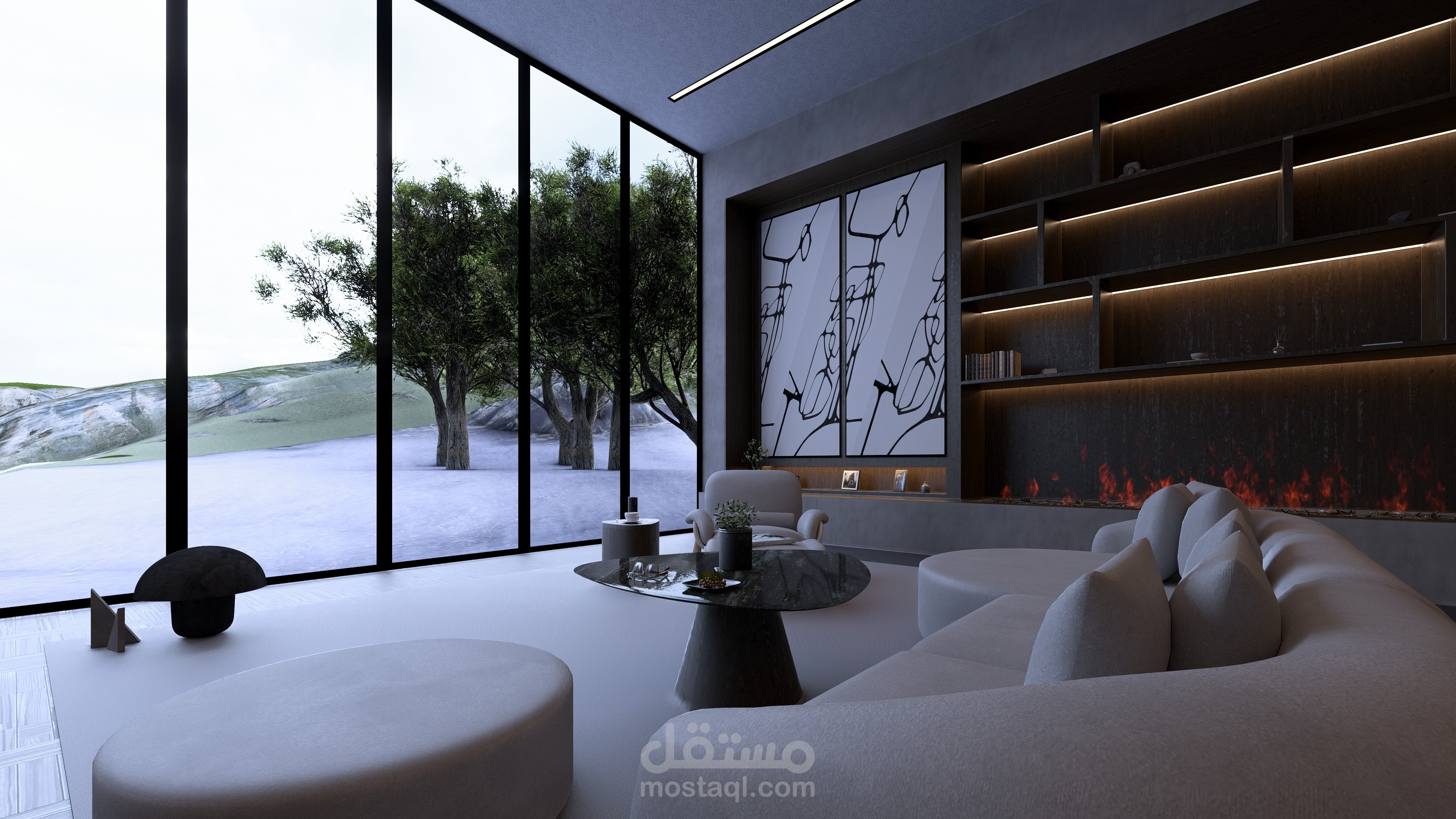 صالة معيشة مودرن مطلة على الجبال بألوان هادئة و خامات من الطبيعة.