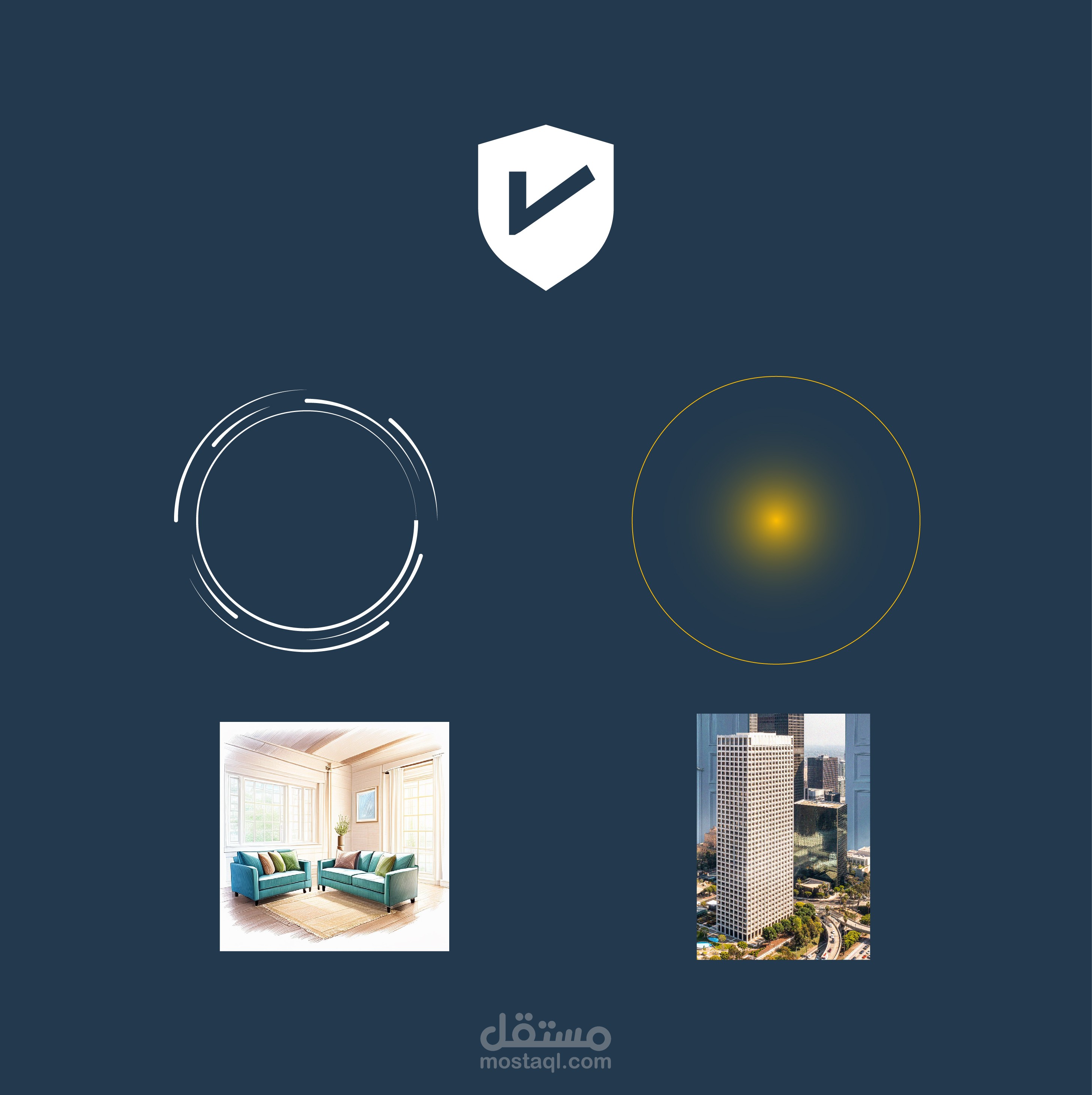 اعتمدت في هذا التصميم على دمج فكرة الأمان العقاري مع صورة الحياة اليومية، من خلال استخدام رمز الدرع Shield ودمج صورة الأبراج بداخله مع علامة التحقق