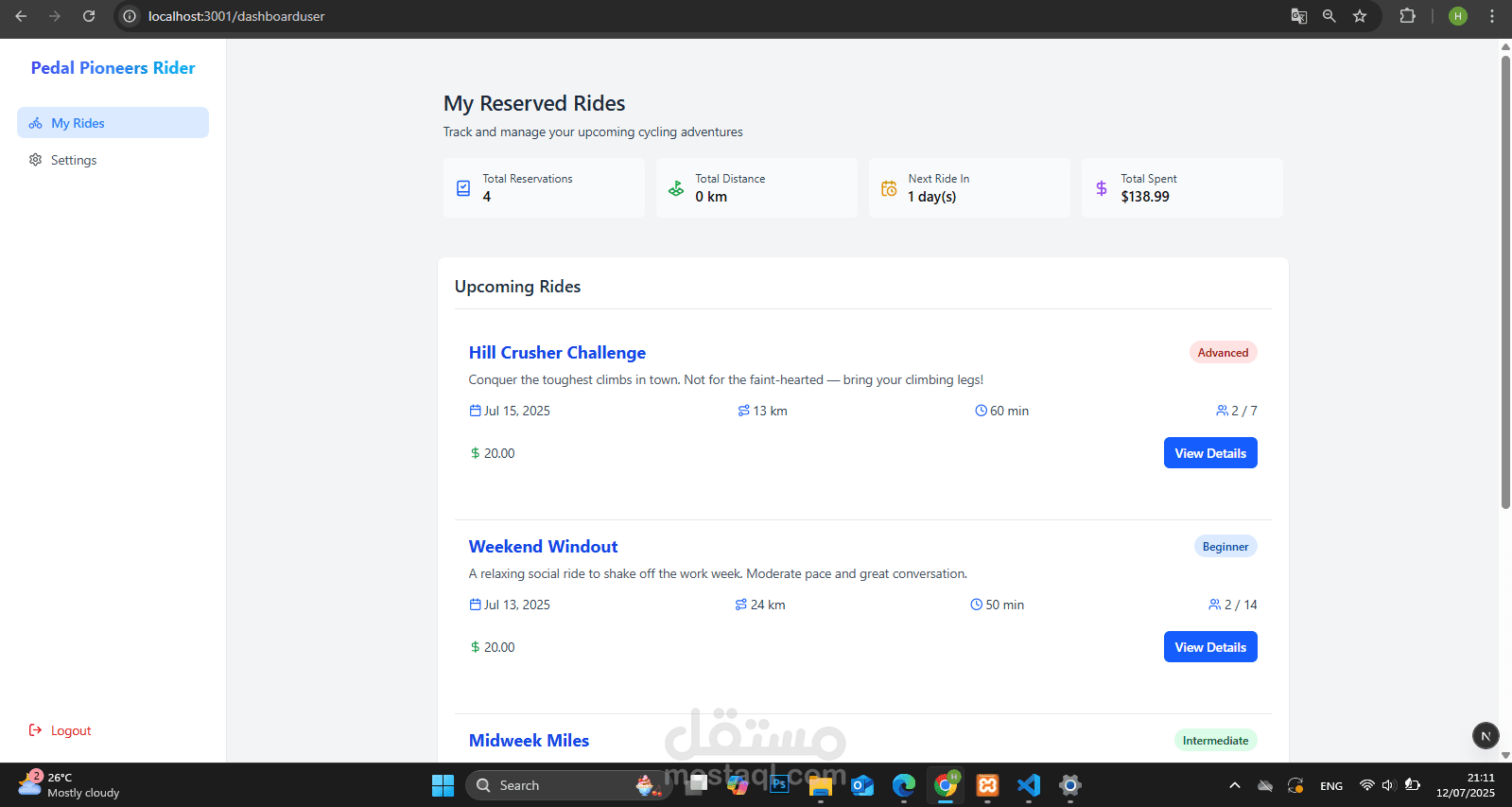 The rider can manage his reservations from his dashboard. He can cancel them, book more places on a ride, and view analytics showing the total amount spent on rides and the total distance ridden (from past rides).