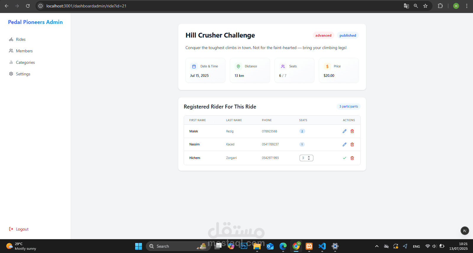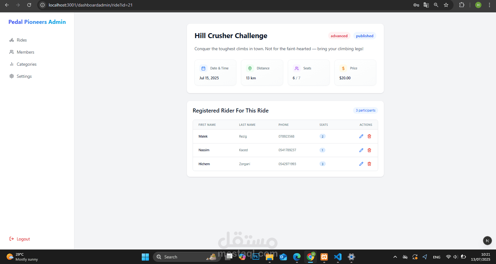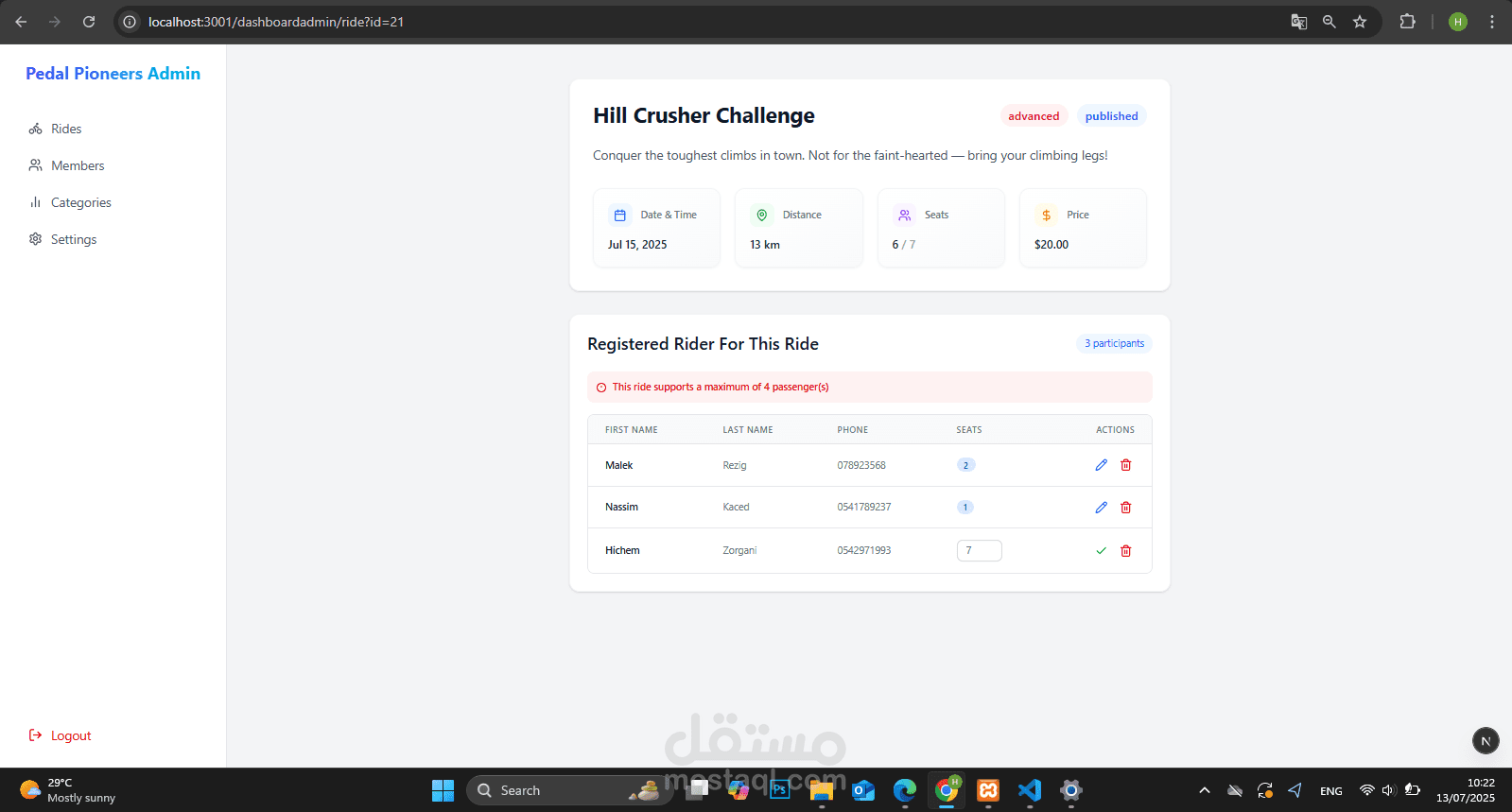 The admin can see all the riders who have joined a ride from the admin panel. He also has full ride management, with analytics such as revenue.