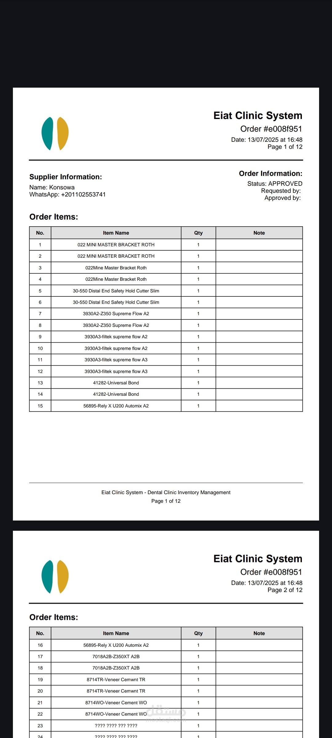 نظام EIAT Dental Clinic System هو تطبيق مخصص لإدارة عمليات عيادات الأسنان، يهدف إلى تسهيل التواصل بين العيادة والموردين، وتنظيم عمليات الطلبات والمخزون، مع صلاحيات مختلفة لكل دور داخل العيادة.
