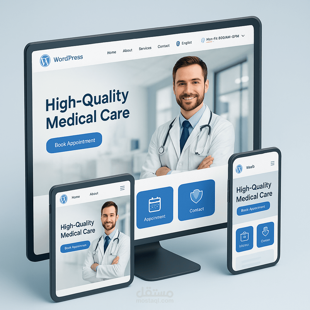 تُظهر الصورة عرضًا ثلاثي الأبعاد أنيقًا لتصميم واجهة موقع إلكتروني لعيادة طبية عصرية مبني على WordPress. يظهر الموقع بشكل متجاوب على 3 أجهزة: حاسوب مكتبي، تابلت، وهاتف ذكي، مع خلفية ناعمة باللون الأزرق الفاتح توحي بالهدوء والثقة.