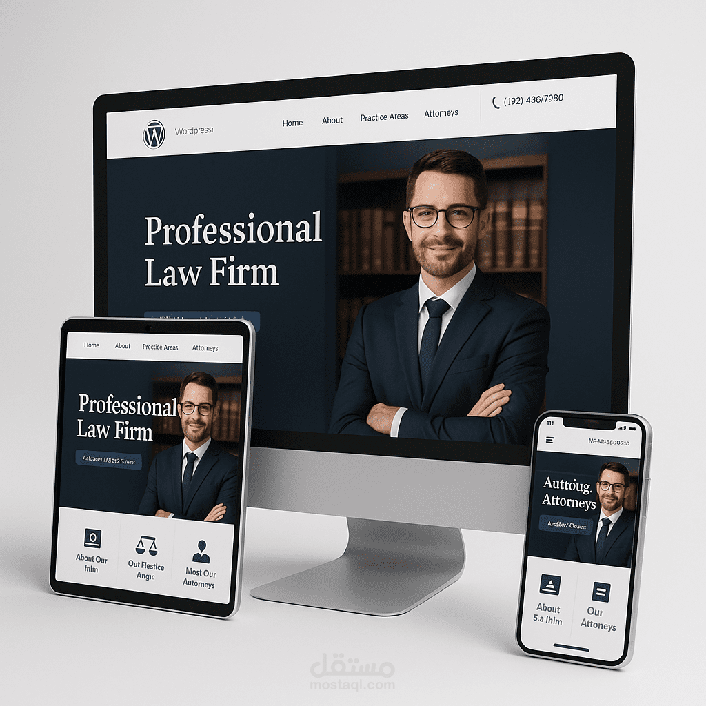 تصميم ثلاثي الأبعاد واقعي لموقع إلكتروني مخصص لمكتب محاماة، يُعرض بشكل متجاوب على جميع الأجهزة (كمبيوتر، تابلت، هاتف)، مع واجهة احترافية بألوان أنيقة (كحلي – أبيض – رمادي) تعكس الجدية والثقة.