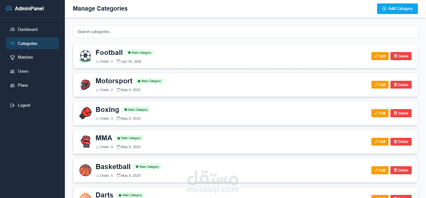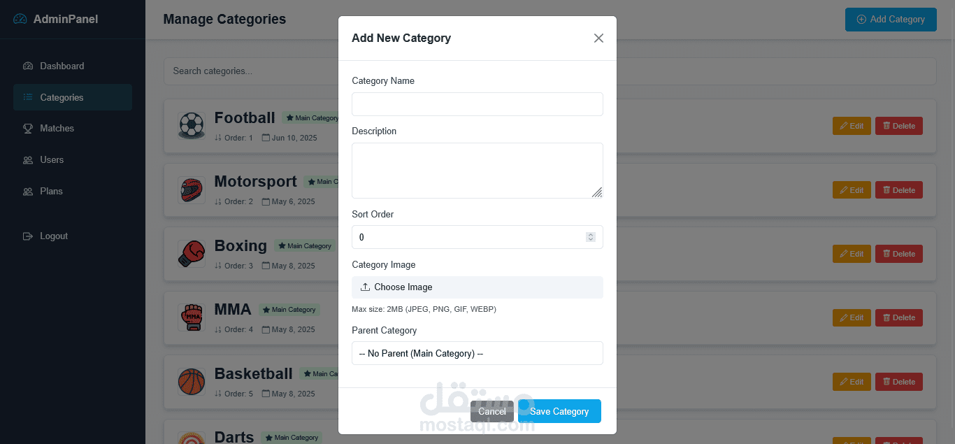 إضافة التصنيفات (رئيسية وفرعية) والمباريات.
