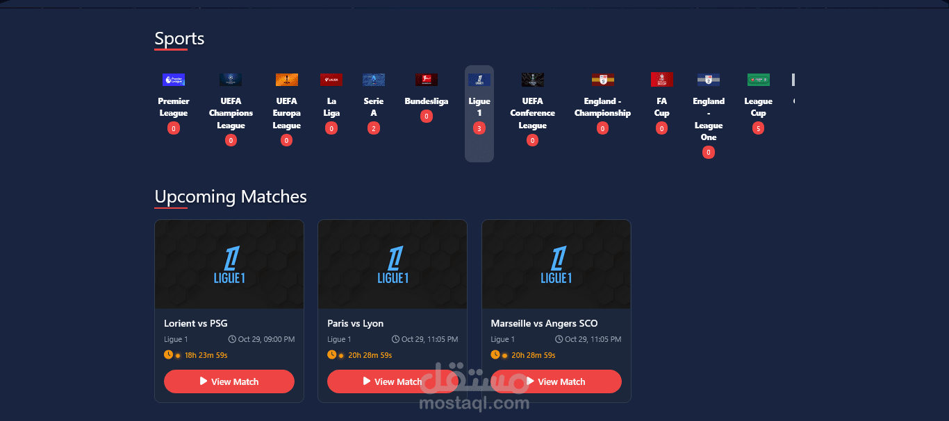 بث مباشر: نظام فعال لعرض روابط البث المباشر للمباريات الجارية مع عرض حالة المباراة (قادمة / مباشرة الآن / انتهت).