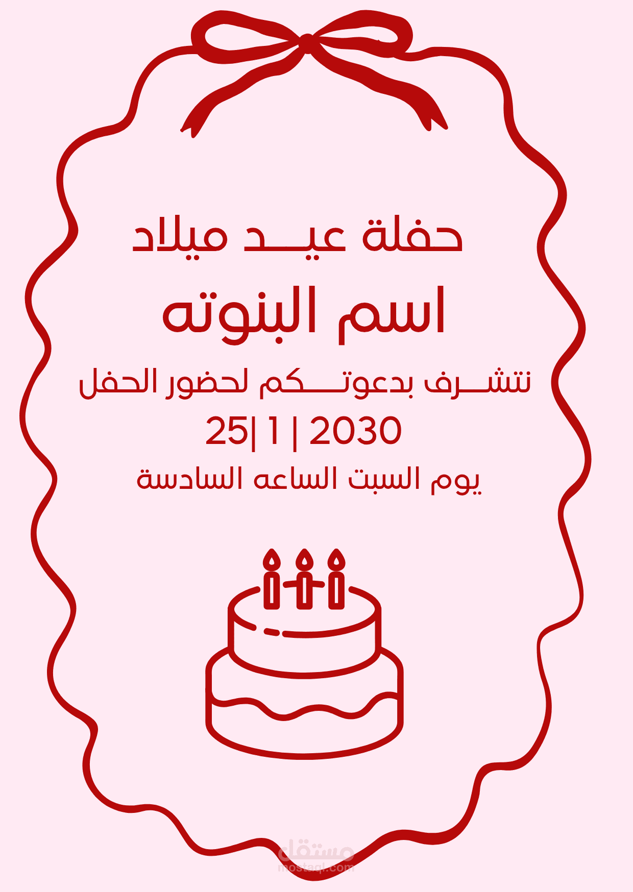 تم استخدام تنسيق بسيط وجذاب مناسب للأطفال مع كتابة اسم صاحب عيد الميلاد وتاريخ الحفل ومكانه بشكل واضح.
