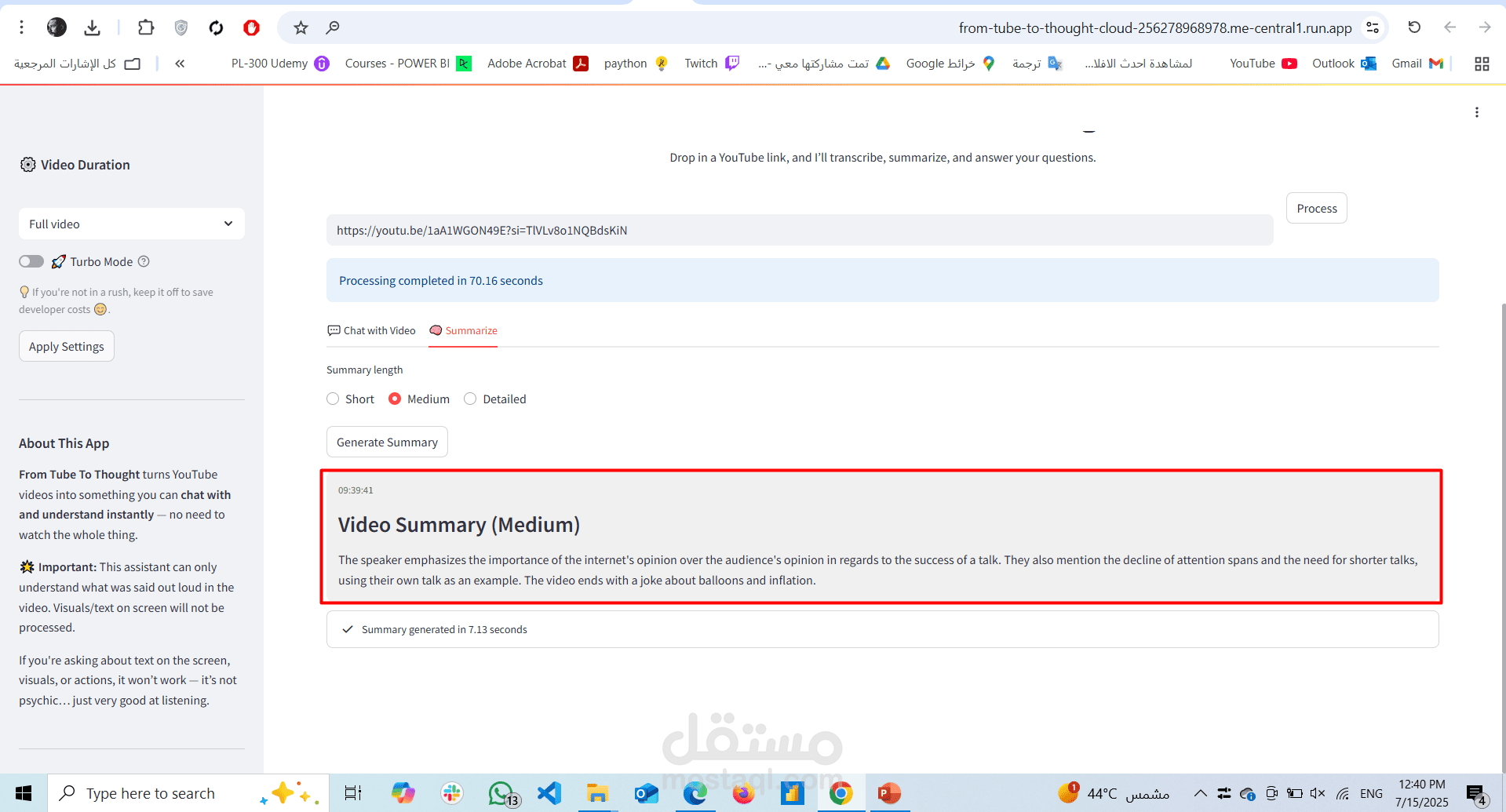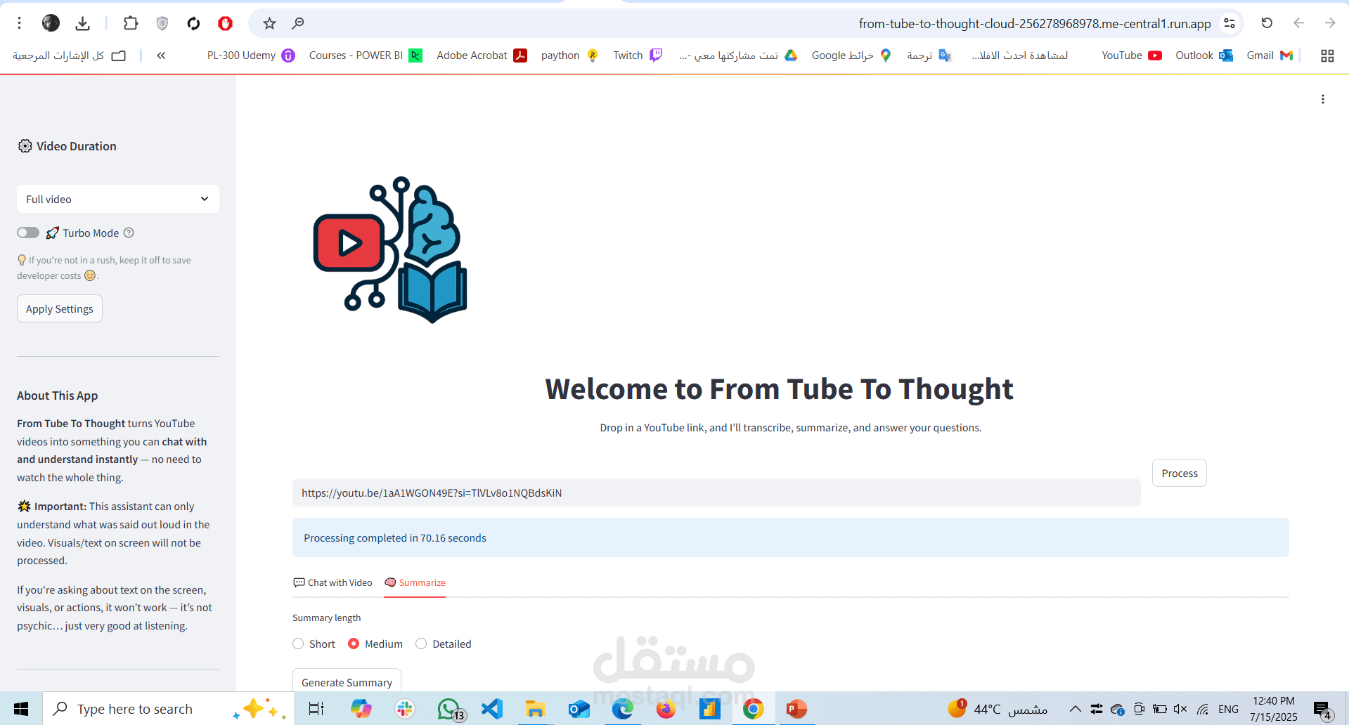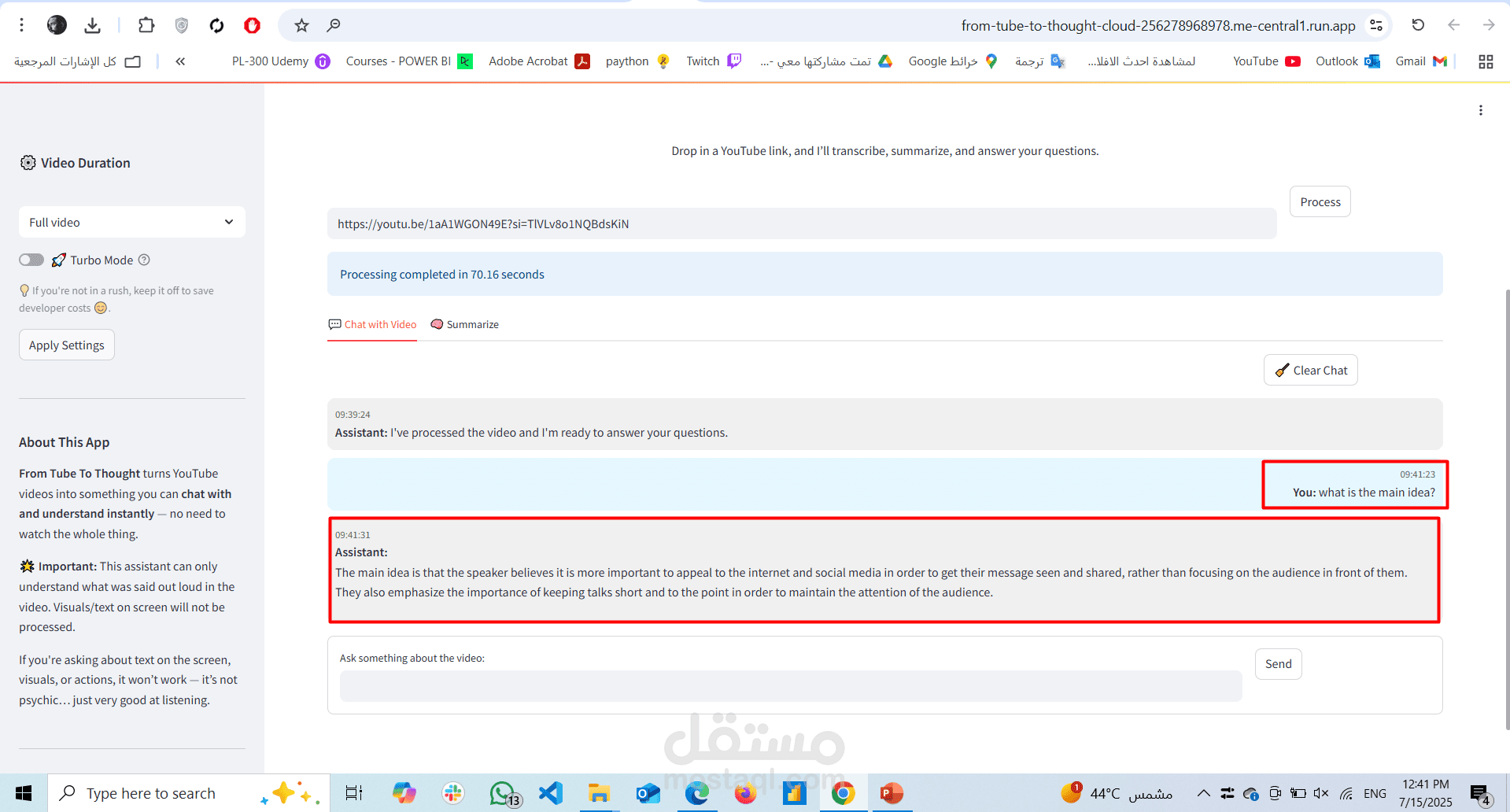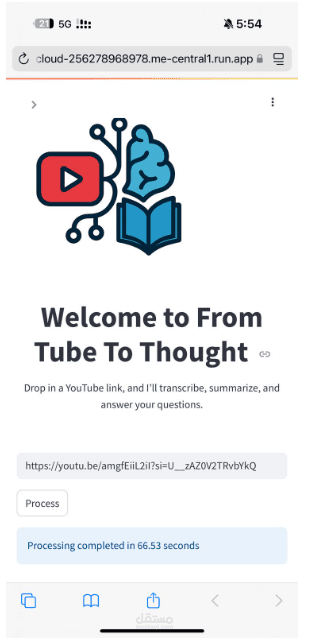 From-Tube-to-Thought is a multimodal AI-powered YouTube assistant that uses advanced Natural Language Processing (NLP) and speech-to-text technology to help users interact with video content conversationally. The system enables users to ask questions, extract key insights, and generate summaries directly from YouTube videos—transforming passive viewing into an intelligent, searchable experience.