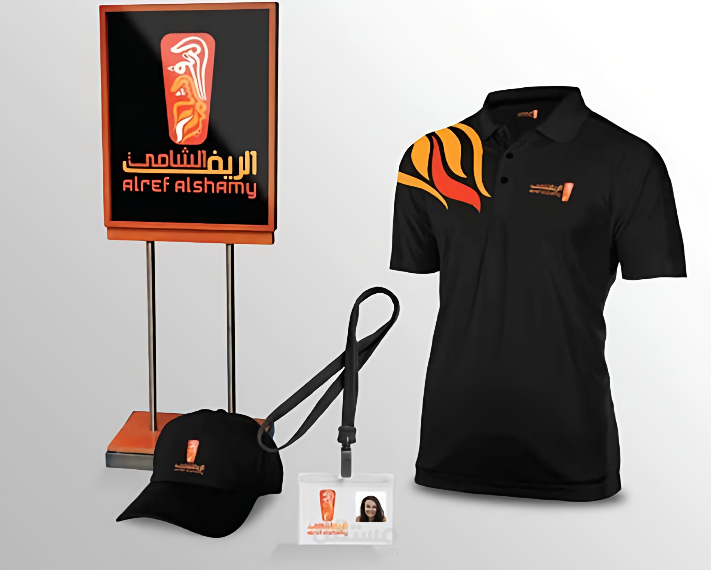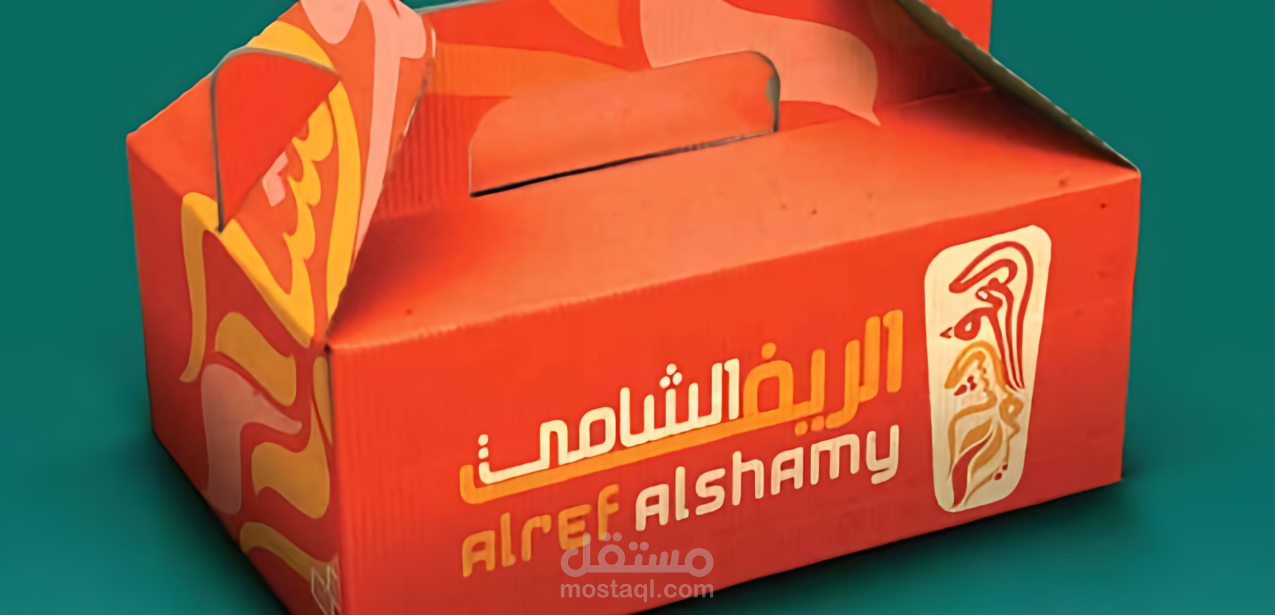 الشعار الخاص بـ "Alref Alshamy" يعكس هوية تجارية مميزة بأسلوب عربي تقليدي. يتميز الشعار بلونين رئيسيين: الأحمر الغني الذي يغطي الخلفية والنص، والأصفر الذي يبرز الحواف والتفاصيل. الرمز العلوي يحمل خطًا عربيًا مزخرفًا يشبه الزخارف الإسلامية، مما يعطي إحساسًا بالتراث والأصالة. اسم "الرف الشامي" مكتوب بخط عربي أنيق مع ترجمته "Alref Alshamy" بالأسفل بخط لاتيني، مما يشير إلى استهداف جمهور محلي وعالمي. التصميم ثلاثي الأبعاد مع إضاءة خافتة يضيف لمسة عصرية، بينما الخلفية الزجاجية تعكس بيئة داخلية دافئة، ربما لمطعم أو مقهى.