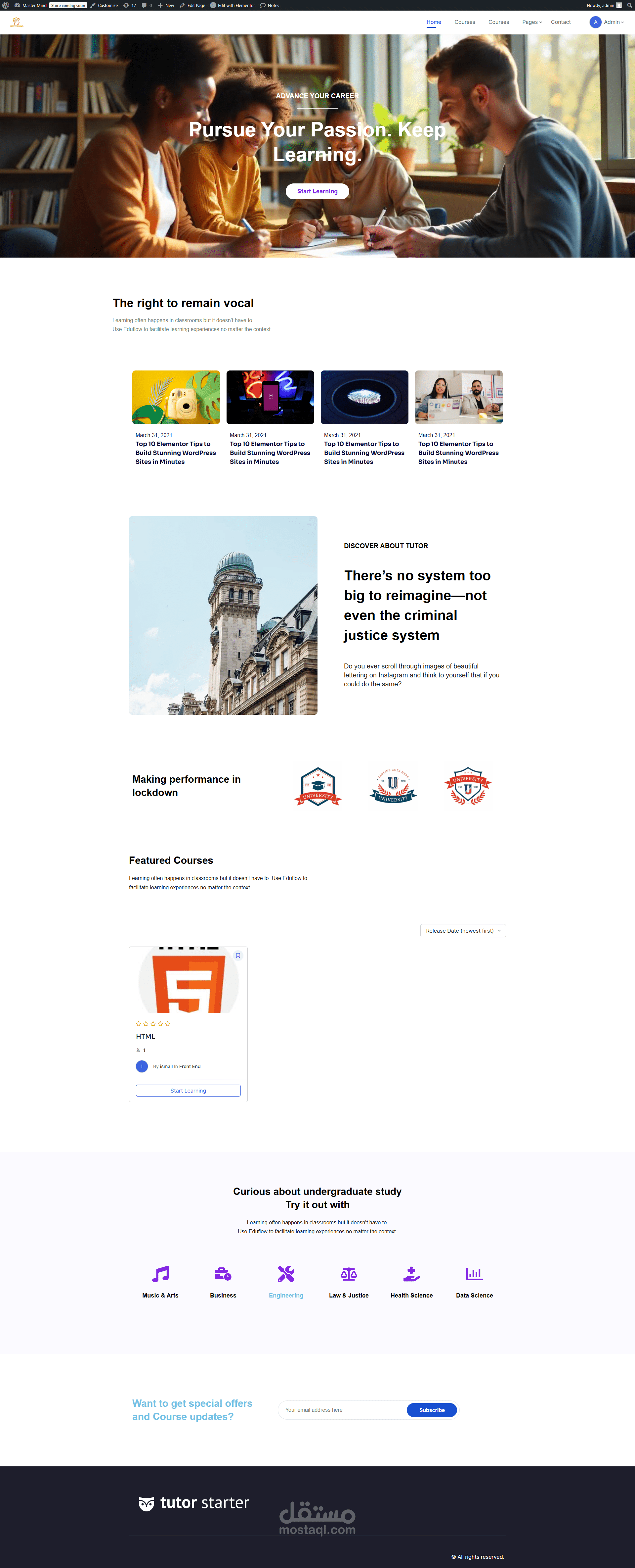 قمت بتنفيذ منصة تعليمية متكاملة باستخدام ووردبريس، بالاعتماد على قالب Tutor Starter وبلجن Tutor LMS، لتقديم تجربة تعلم احترافية وسلسة للطلاب والمدربين. المنصة مستوحاة من نماذج عالمية مثل Udemy وSkillshare، وتوفر مزايا قوية لتقديم الدورات، إدارة المتعلمين، وتتبع التقدم.
