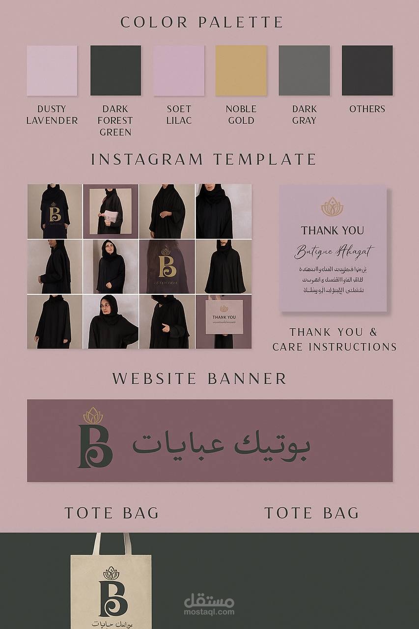 قمت بتصميم هوية بصرية متكاملة لعلامة تجارية نسائية مختصة بالعبايات، بأسلوب أنثوي ناعم وفاخر يعكس ذوق الفئة المستهدفة.