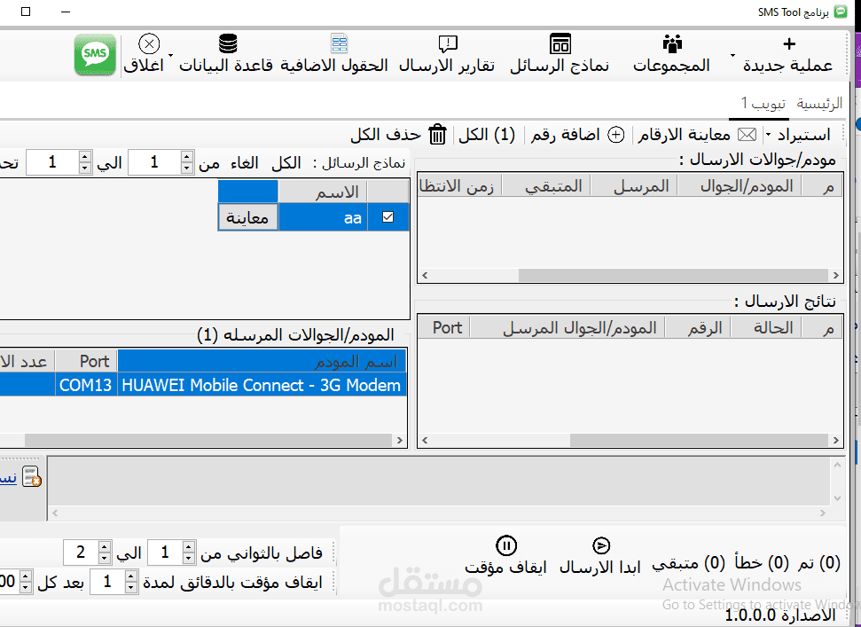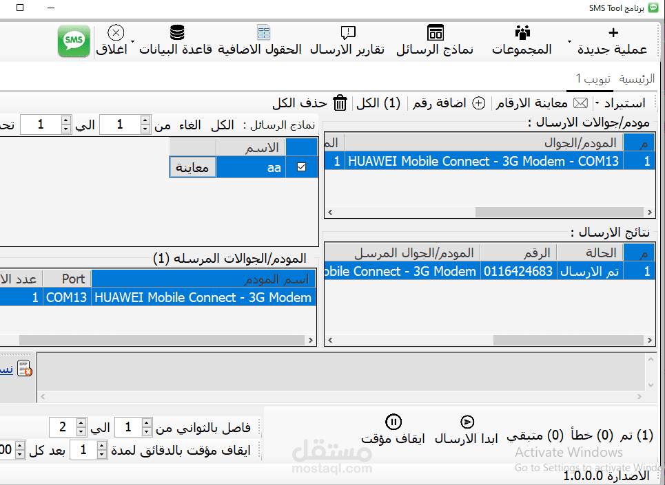2- ارسال عدد لا نهائي من رسائل sms بالاعتماد علي عدد الرسائل التي تسمح الشريحة بارسالها و عدد المودم الموصل بالكمبيوتر ، فمثلا اذا اذا اوصلت 3 مودم و كانت كل شريحة تسمح بارسال 500 رسالة في اليوم الواحد هذا يعني انك تستطيع ارسال 1500 رسالة في اليوم