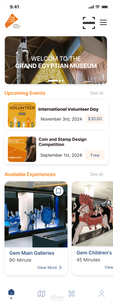 النسخة الأولية (MVP) لتطبيق المتحف المصري الكبير (GEM) مصممة لتقديم تجربة رقمية سلسة وجذابة للزوار أثناء استكشافهم للمتحف. تركز النسخة الأولية على توفير الميزات الأساسية التي تعزز تجربة الزائر مع الحفاظ على واجهة بسيطة وسهلة الاستخدام ومتاحة للجميع.