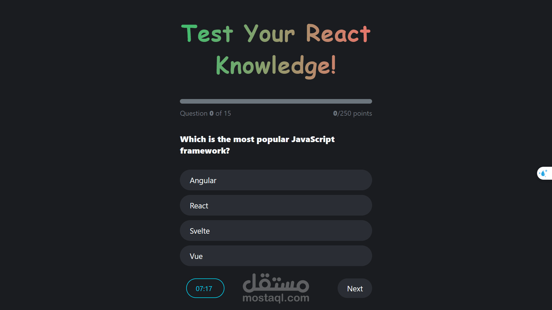 موقع كويز تفاعلي مبني باستخدام React، يُقيّم إجاباتك ويحسب النقاط مع مؤقت تنازلي لكل سؤال ⏱️