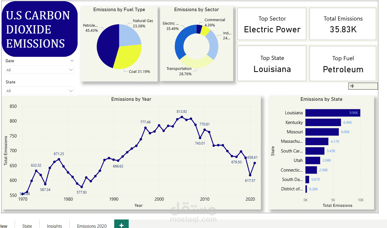 في هذا المشروع قمت بتحليل بيانات انبعاثات ثاني اكيد الكربون ف الولايات المتحدة ف الفترة (1970-2021) .