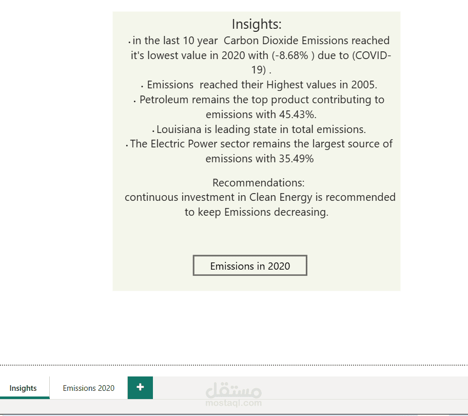معرفة الاداء العام والتحليل الاستكشافي الذى على ضوءه تم استكشاف ان في اخر عشر سنوات سجلت انبعاثات ثاني اكسيد الكربون ادنى نسبة لها (-8.68%) في سنة 2020 نظرا الى كوفيد - 19 الذي سبب انخفاض ف نسبة الانبعاثات خاصة ف قطاع النقل .