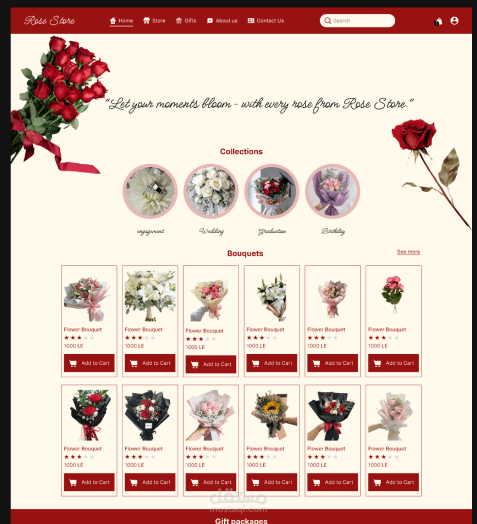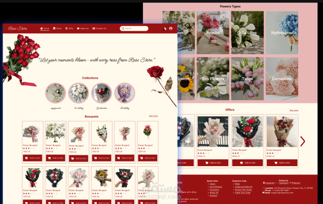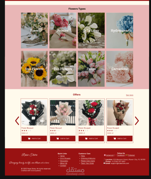 قمت بتصميم صفحة هوم بيدج لمتجر لبيع الزهور وباقات الورودو , بإستخدام برنامج فيجما ,واختيار تصميم جديد ومميز للمتجر مع عناصر بصرية مثل الألوان التي تناسب الزهور