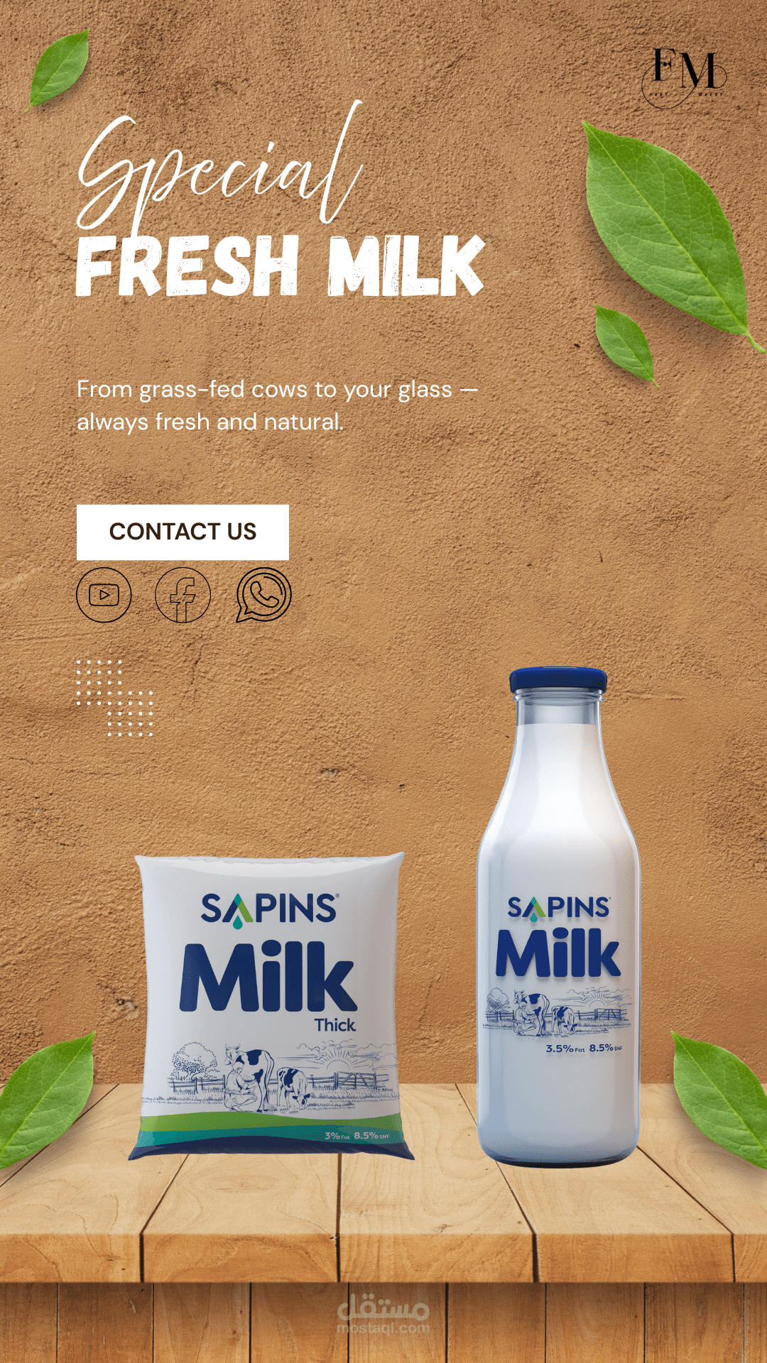 هذا تصميم ترويجي عصري مستوحى من الطبيعة، تم إنشاؤه لمنتج SAPINS Fresh Milk. يعكس التصميم النقاء والانتعاش والجودة العضوية من خلال استخدام ألوان ترابية، وتنسيق نظيف، وصور واقعية للمنتج. كما تبرز خلفية التصميم ووجود الأوراق الخضراء الطابع الطبيعي والاستدامة بشكل غير مباشر، بينما تضيف منصة الخشب لمسة ريفية توحي بمفهوم "من المزرعة إلى المائدة".