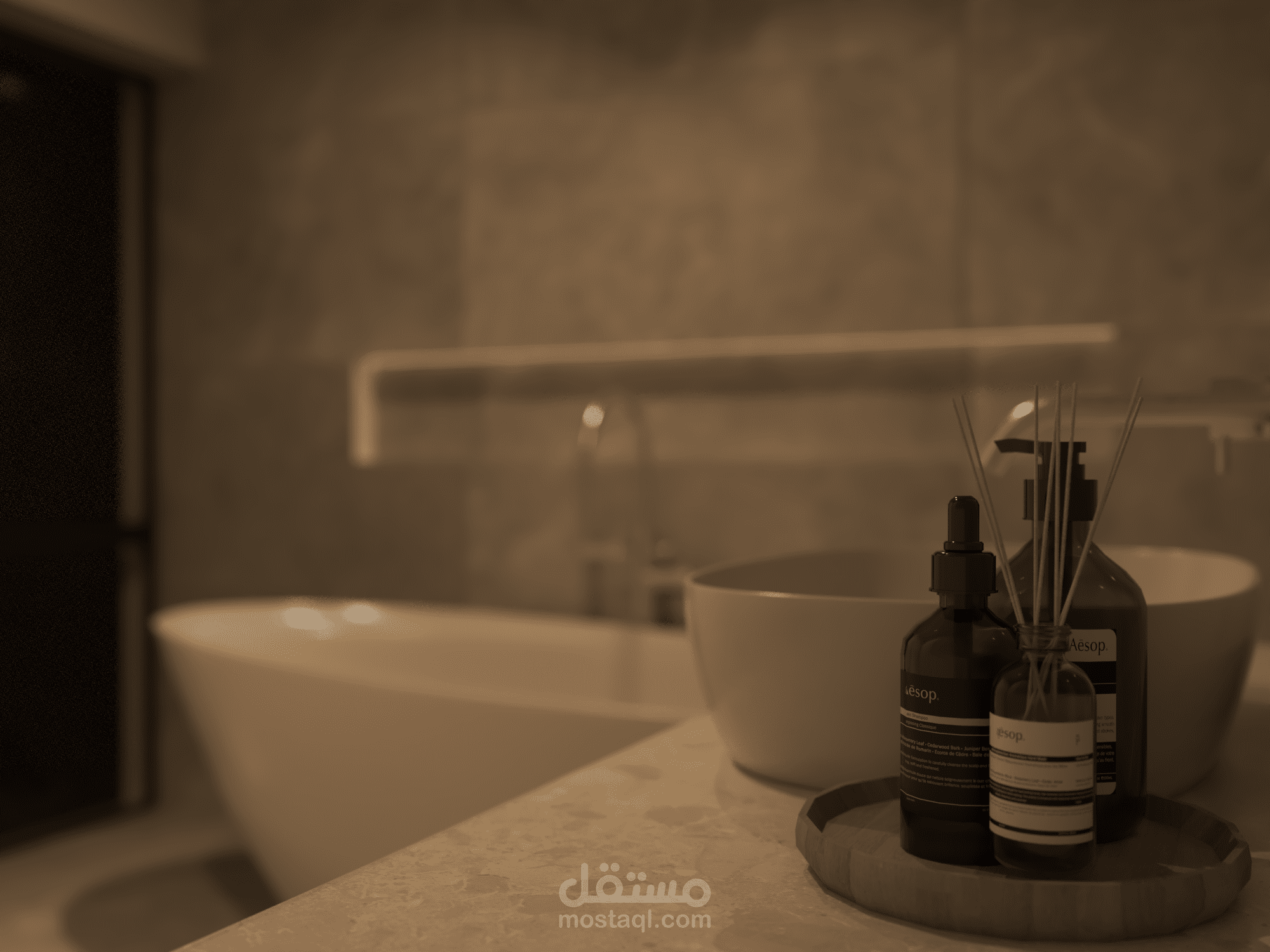 إضاءة متعددة الطبقات، تجمع بين الإضاءة العامة، إضاءة المرآة المركزة، ولمسات إضاءة دافئة تعزز الشعور بالاسترخاء.