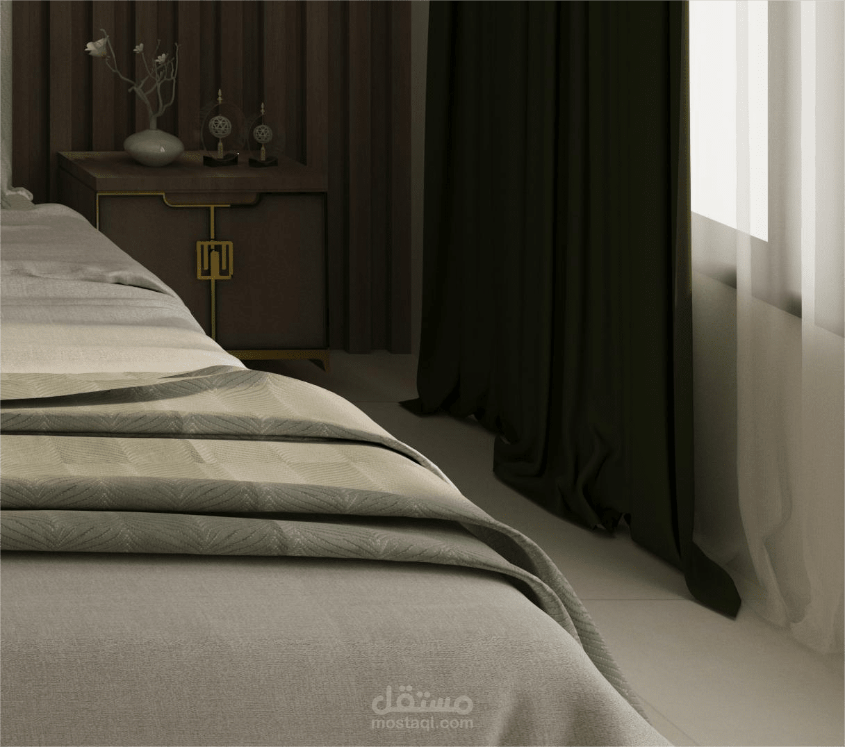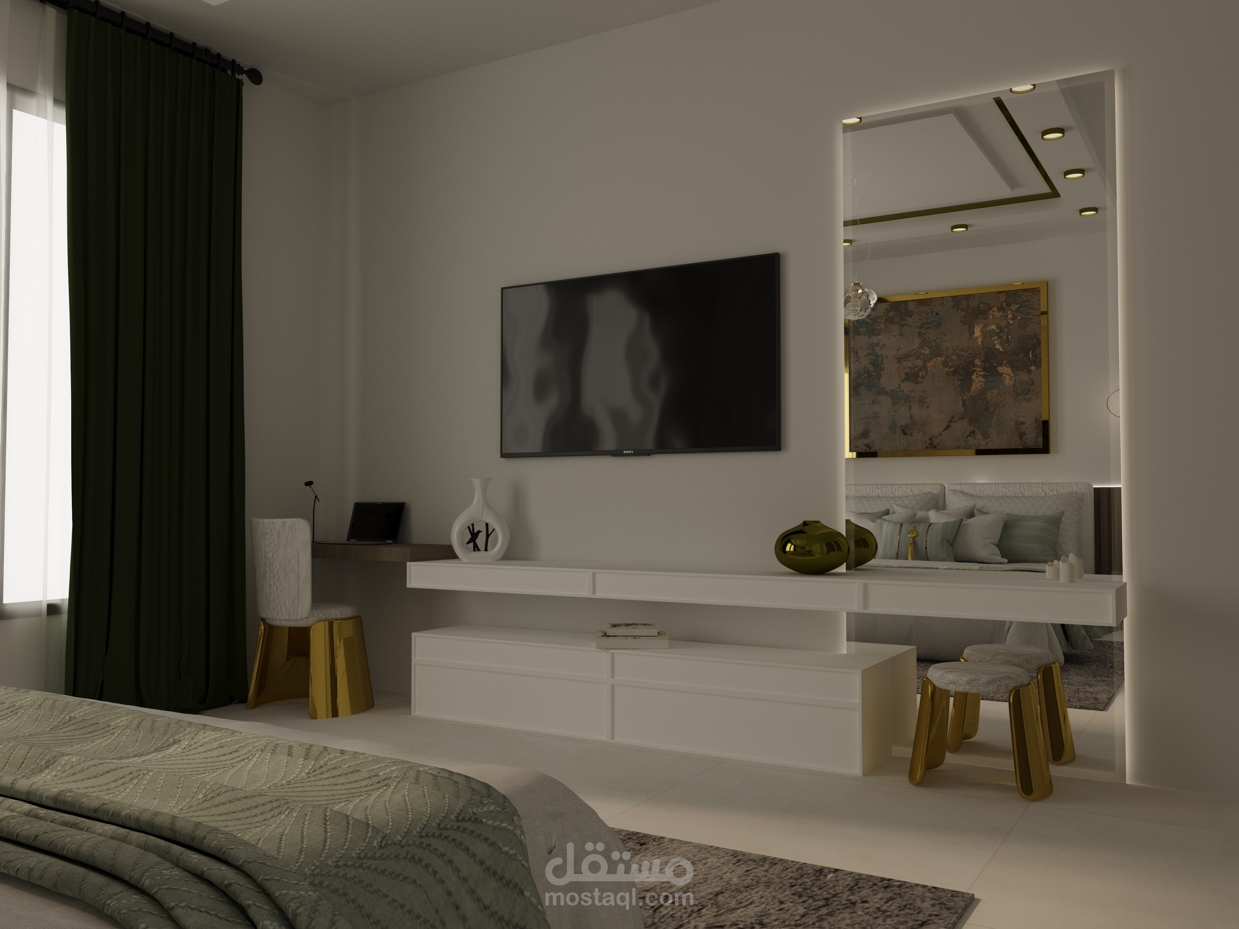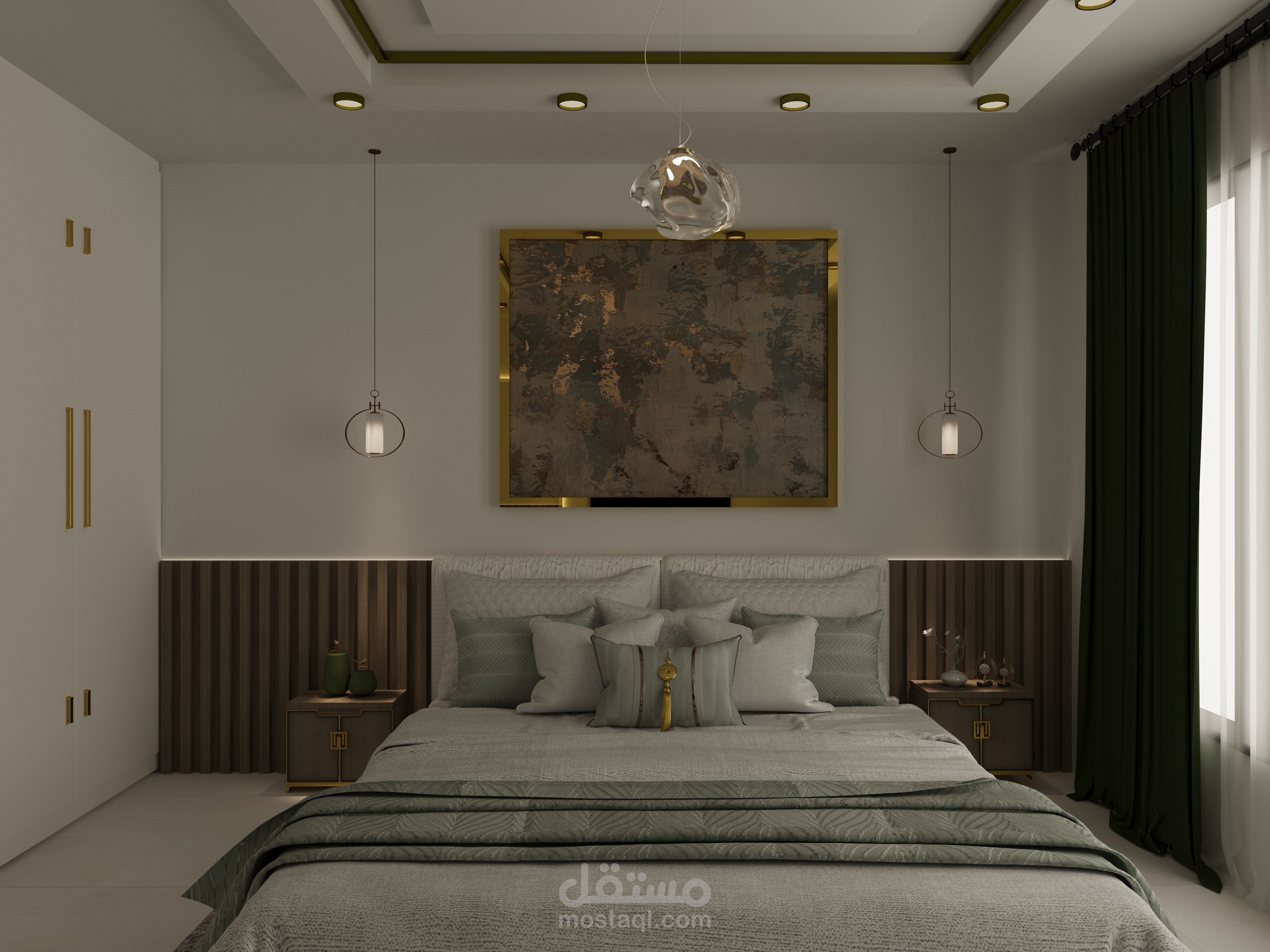 غرفة نوم رئيسية فاخرة بطابع عصري هادئ، حيث يندمج اللون الأخضر الزيتوني مع درجات البيج والرمادي لخلق جو مريح وأنيق.