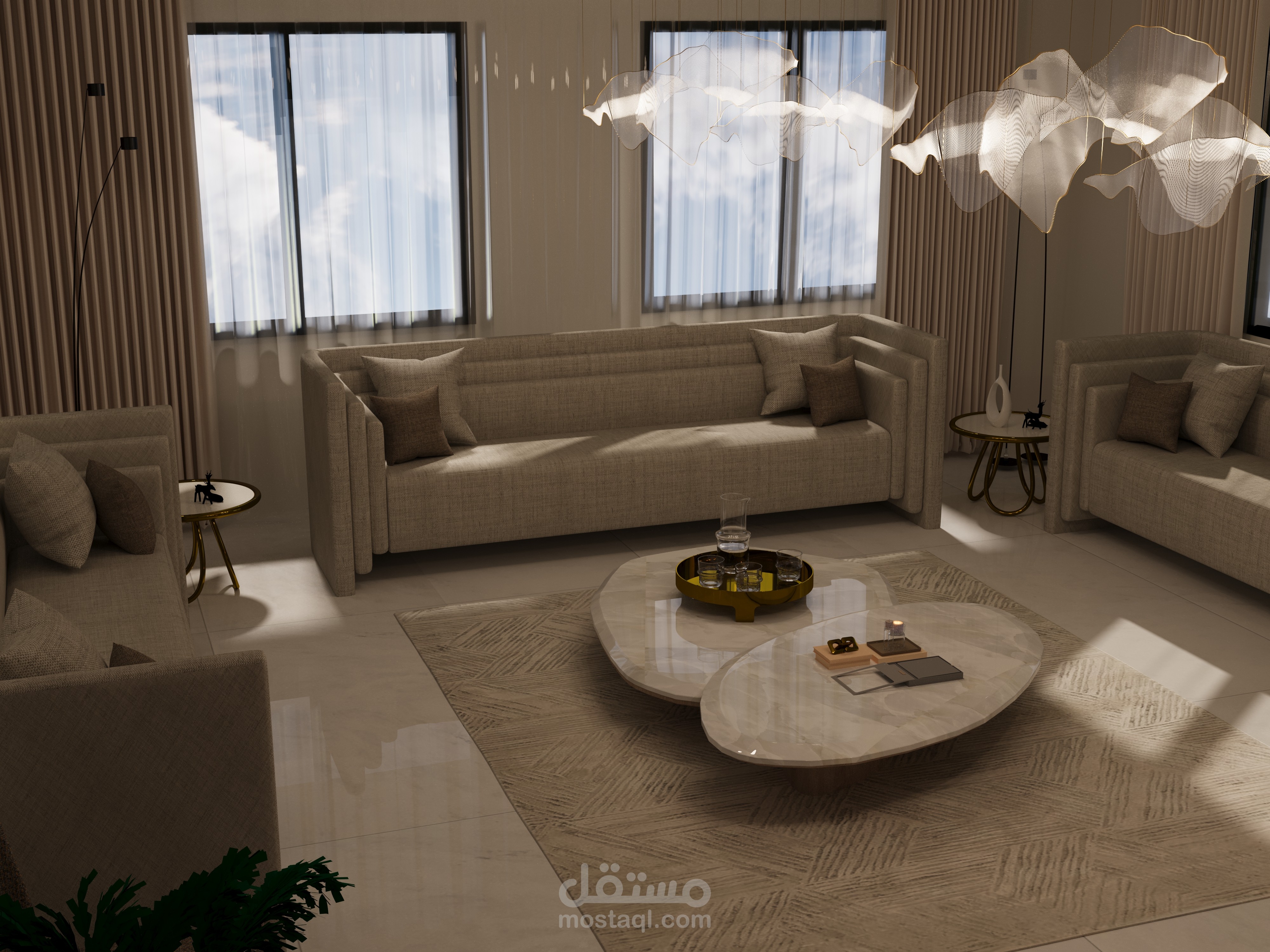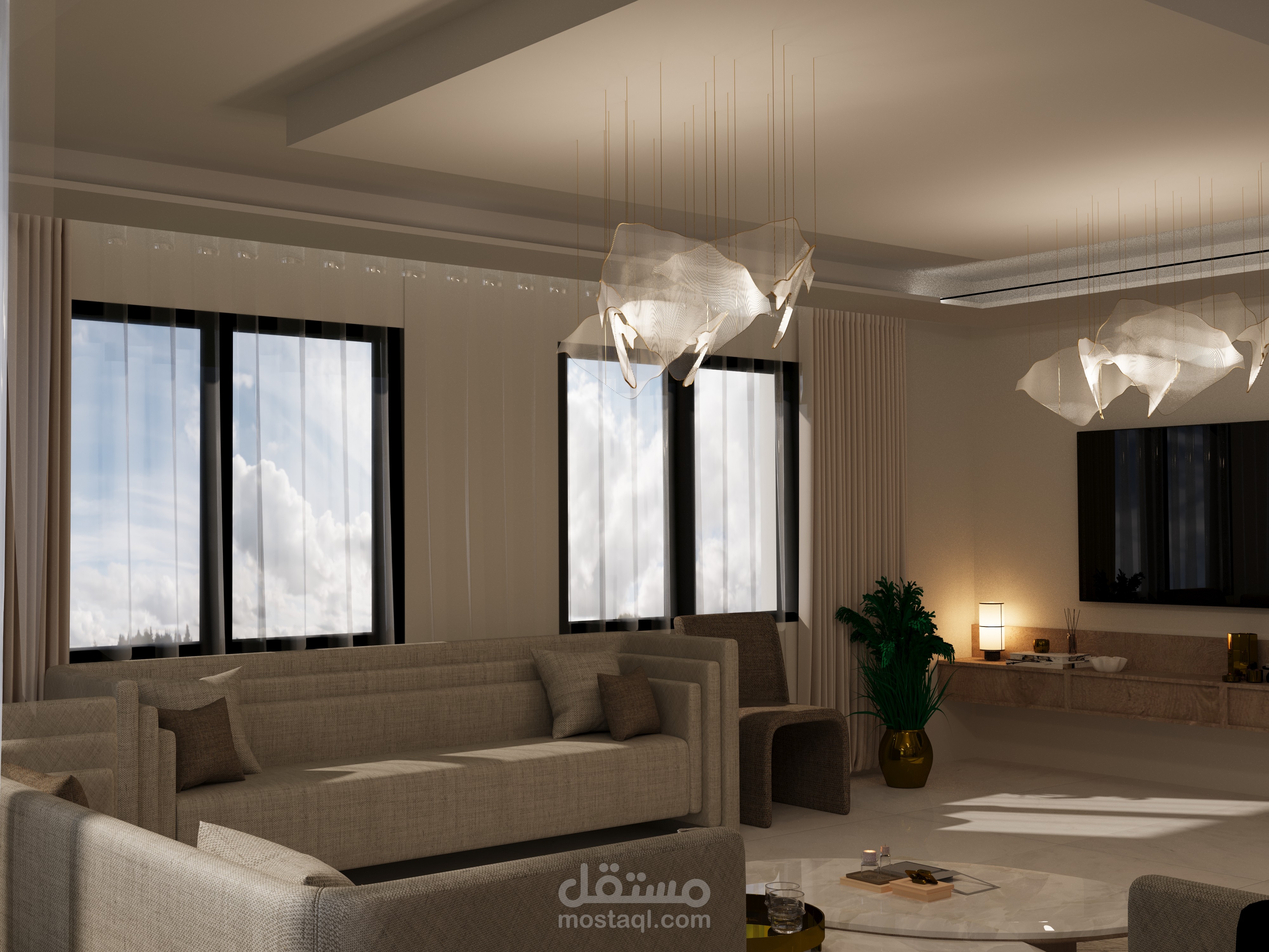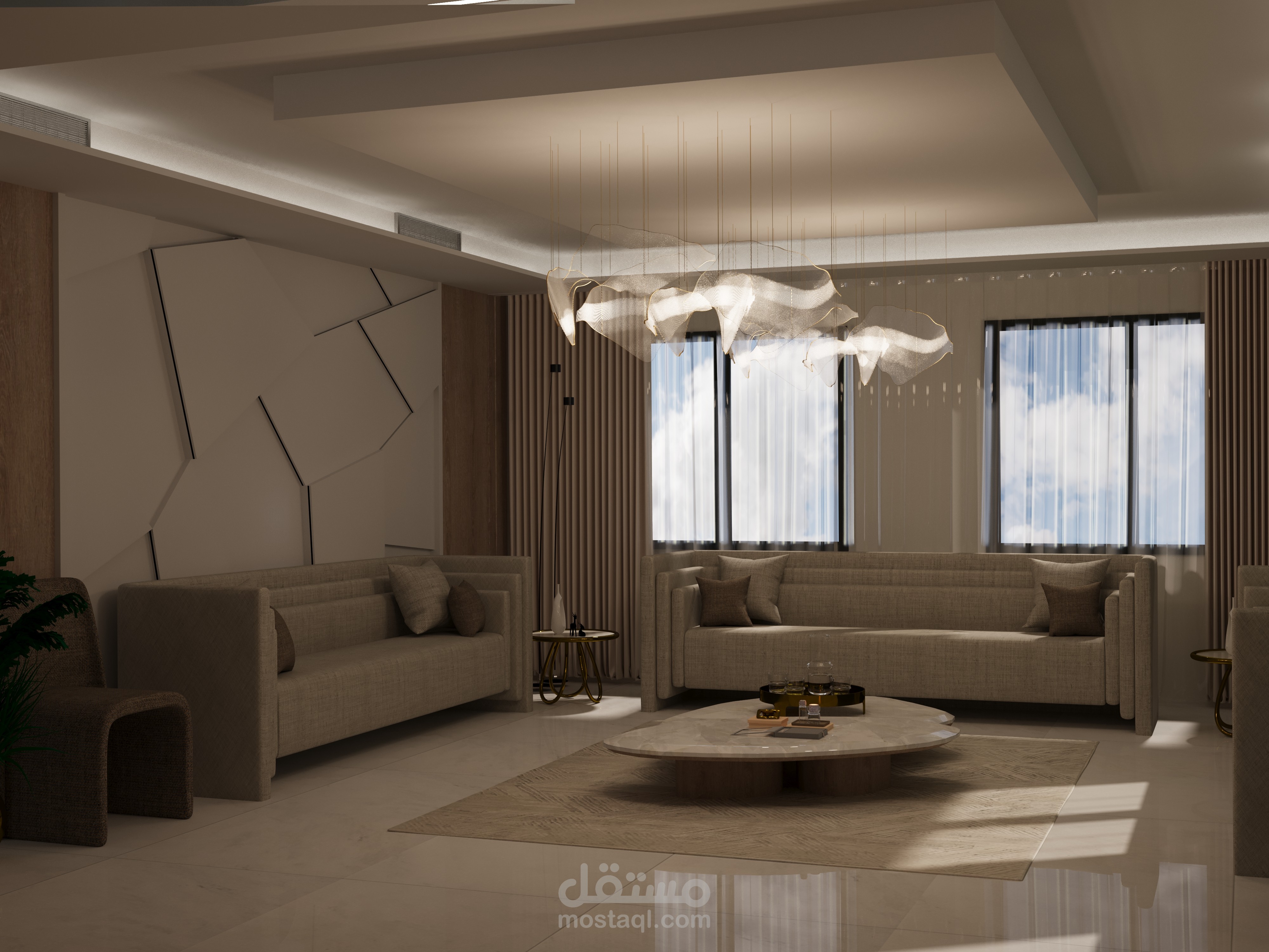 مجلس عصري بطابع هادئ وفاخر، يعتمد على لوحة ألوان ناعمة تجمع بين درجات البيج والرملي.