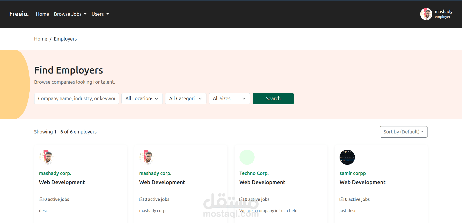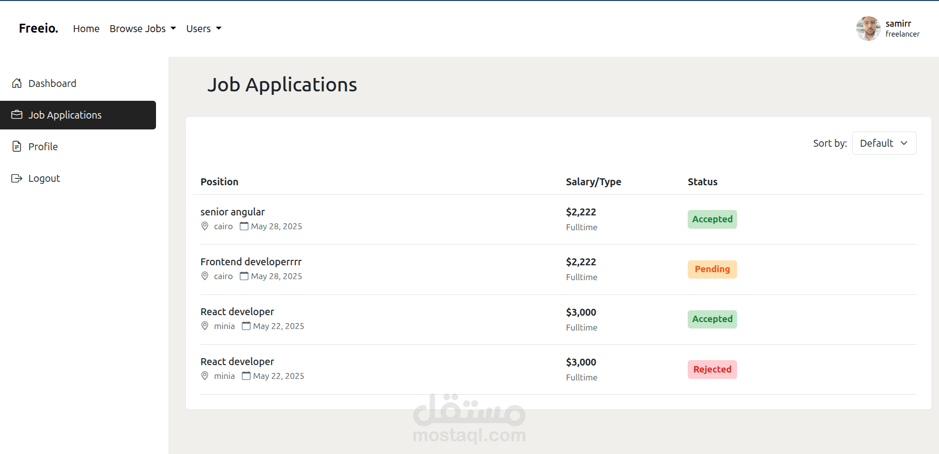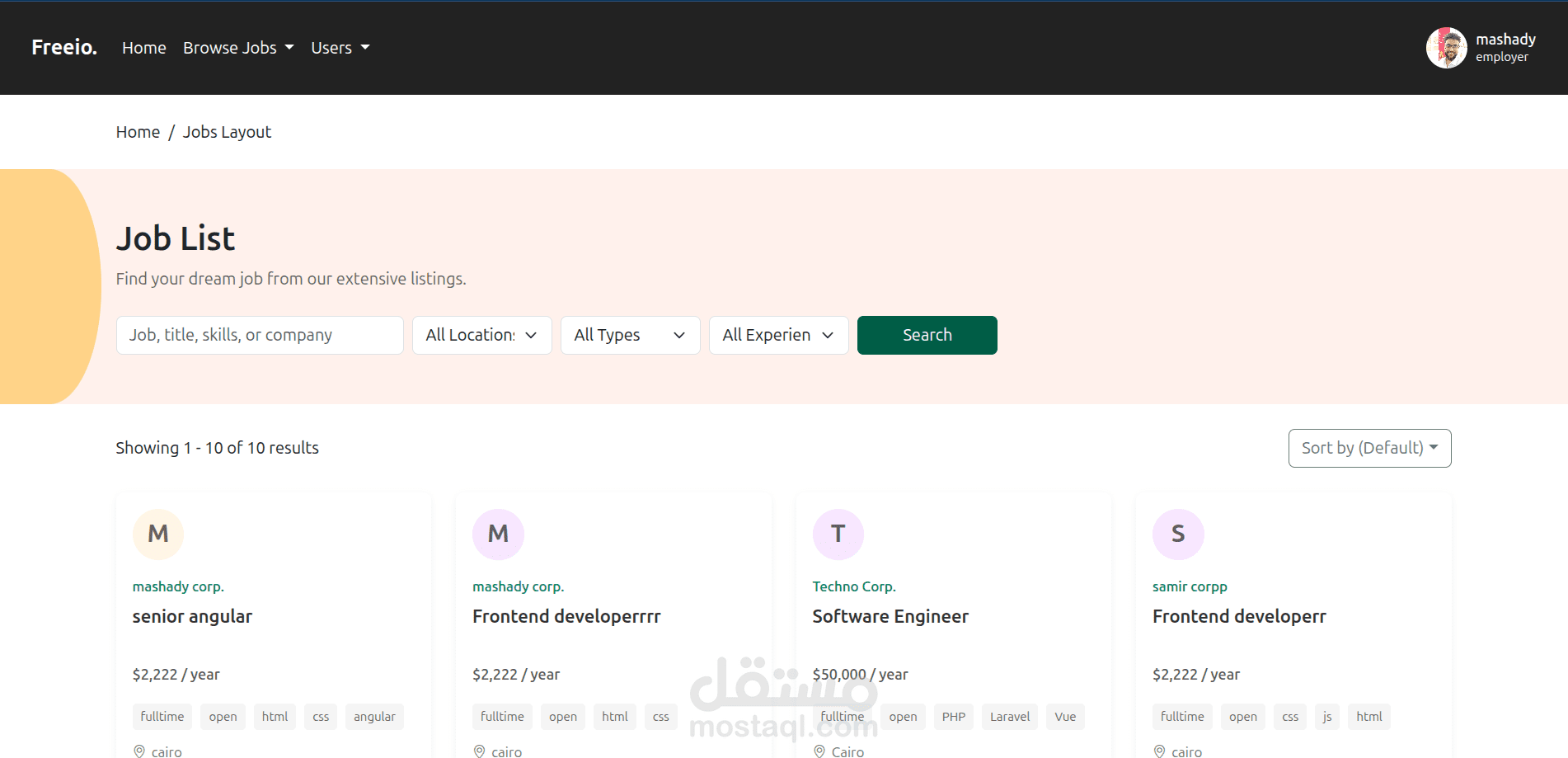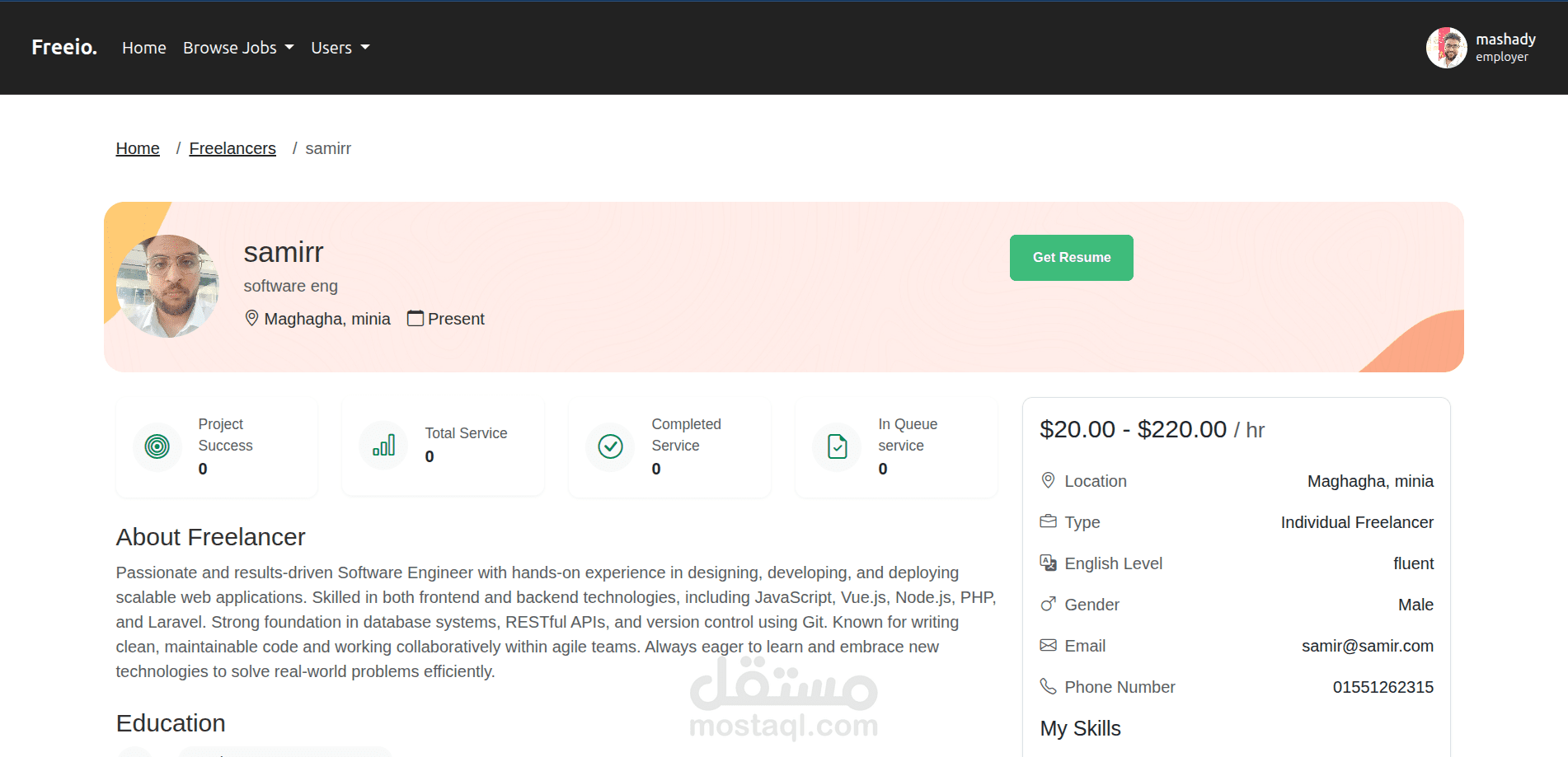 منصة متكاملة تربط بين المستقلين والعملاء. يمكن للمستخدمين التسجيل كمستقلين أو كأصحاب عمل، ونشر وظائف أو مشاريع، والتقديم عليها. تتضمن المنصة لوحات تحكم مخصصة لكل نوع من المستخدمين بحسب دوره.