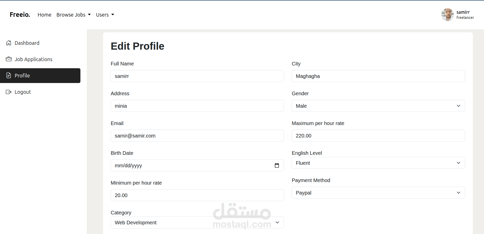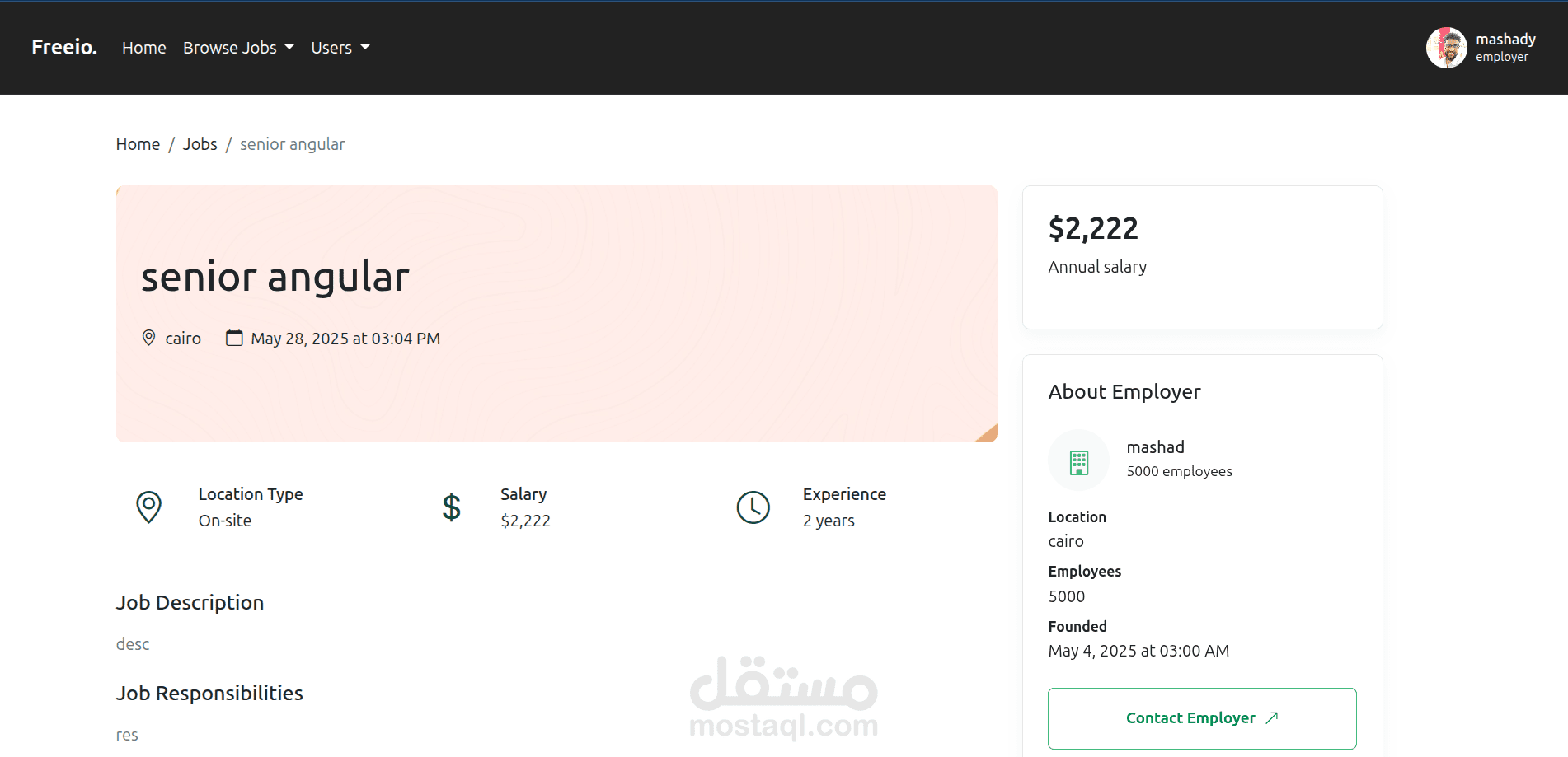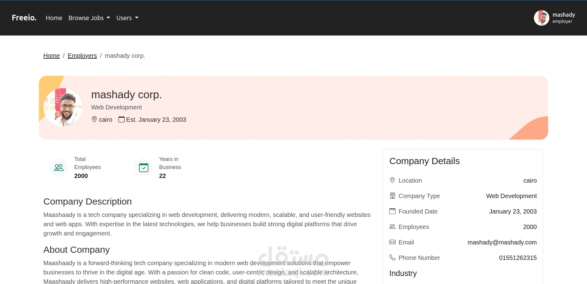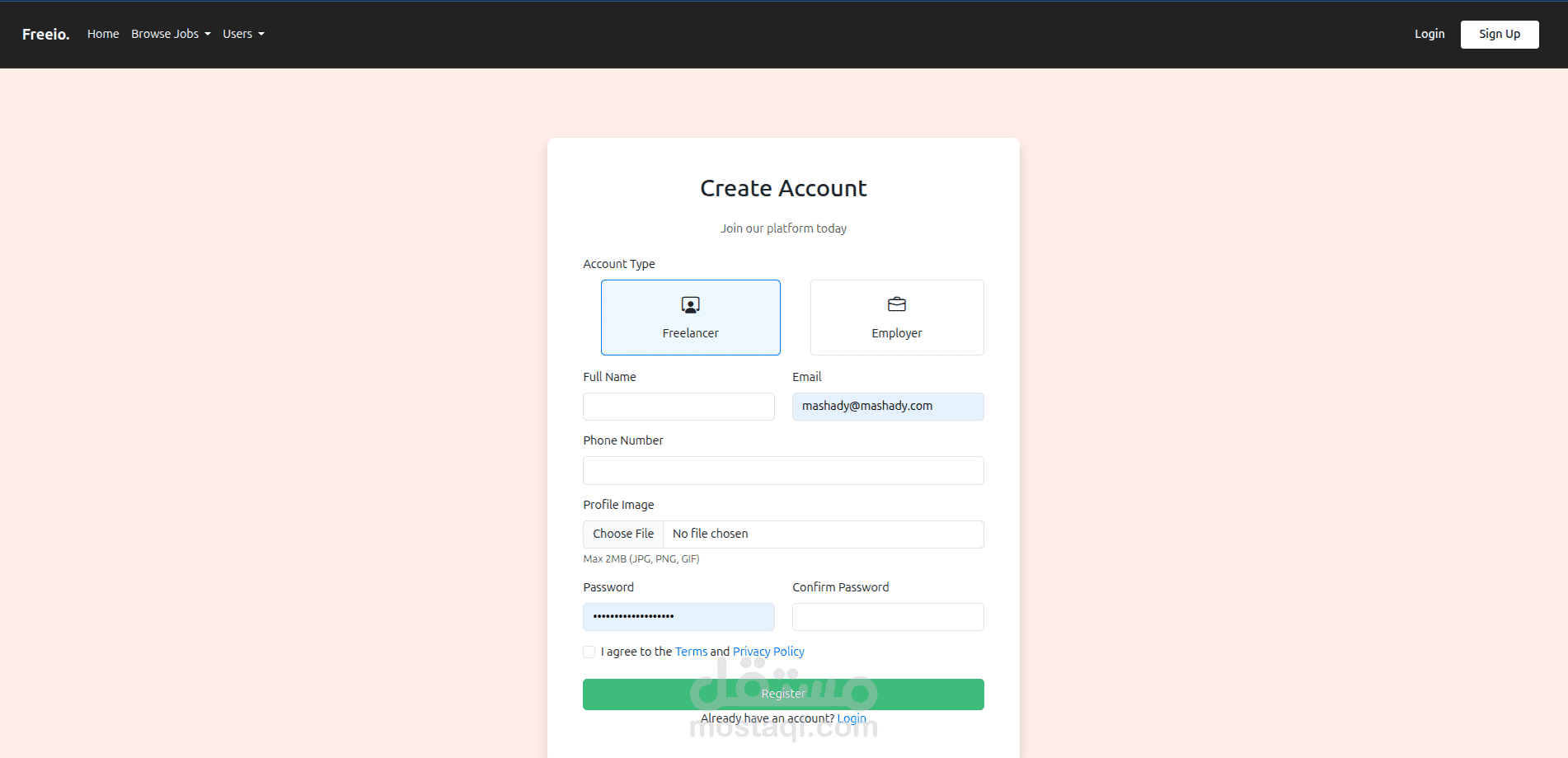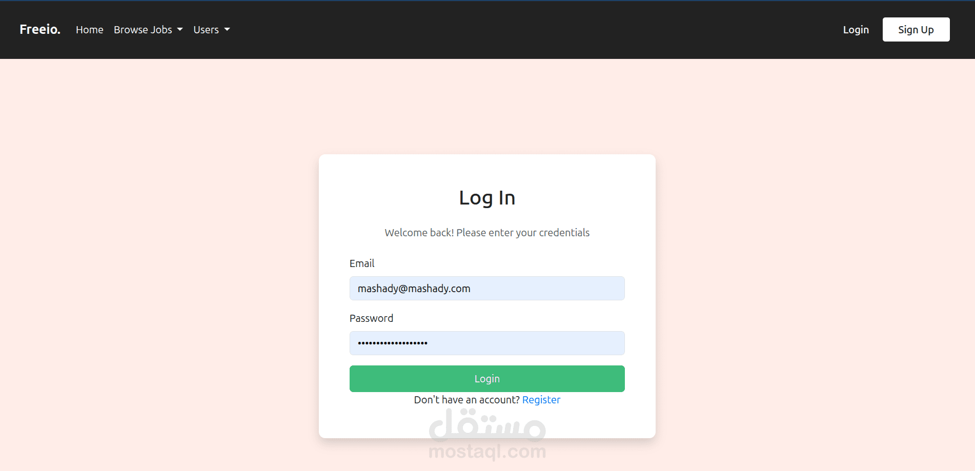 منصة متكاملة تربط بين المستقلين والعملاء. يمكن للمستخدمين التسجيل كمستقلين أو كأصحاب عمل، ونشر وظائف أو مشاريع، والتقديم عليها. تتضمن المنصة لوحات تحكم مخصصة لكل نوع من المستخدمين بحسب دوره.