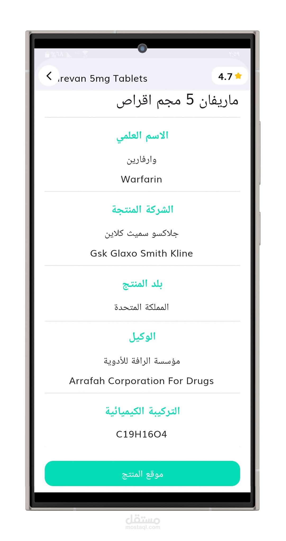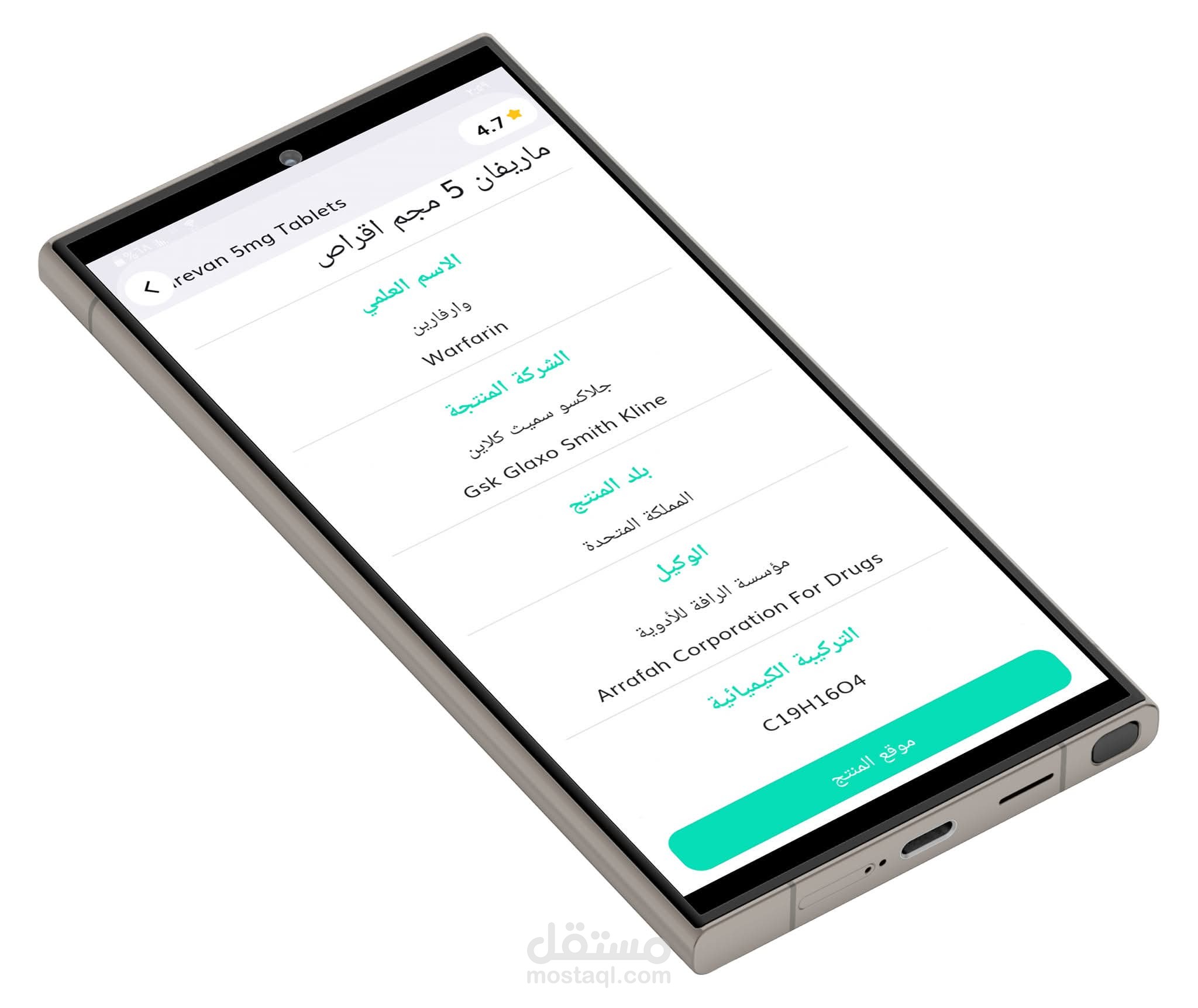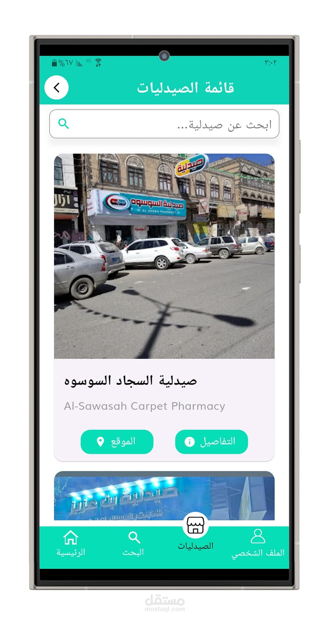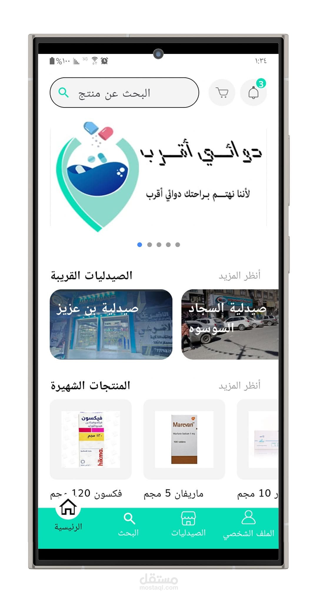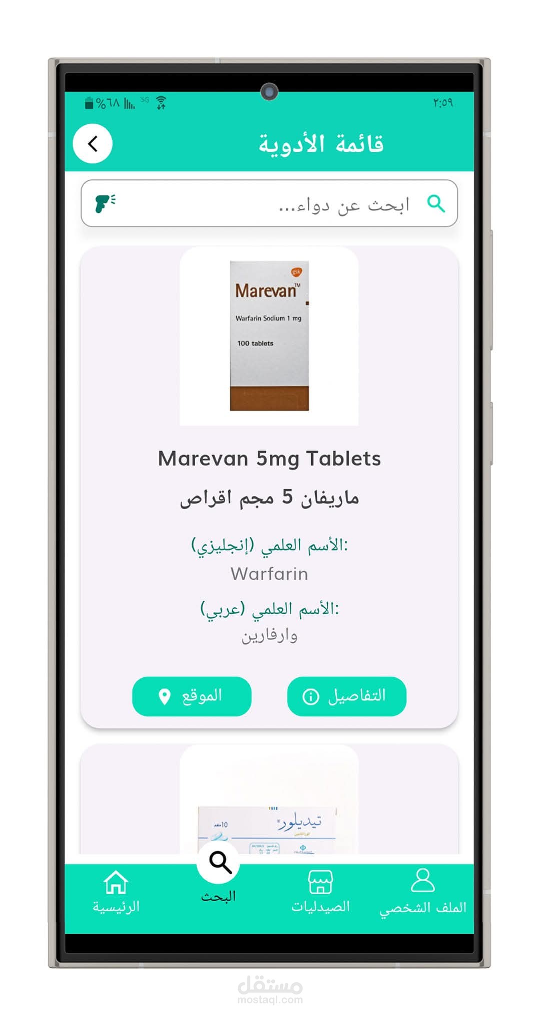 تطبيق أندرويد يتيح للمستخدم البحث عن الأدوية ومعرفة أقرب الصيدليات التي يتوفر لديها الدواء، مع عرض تفاصيل الصيدلية وإرسال إشعارات عند توفر الأدوية.