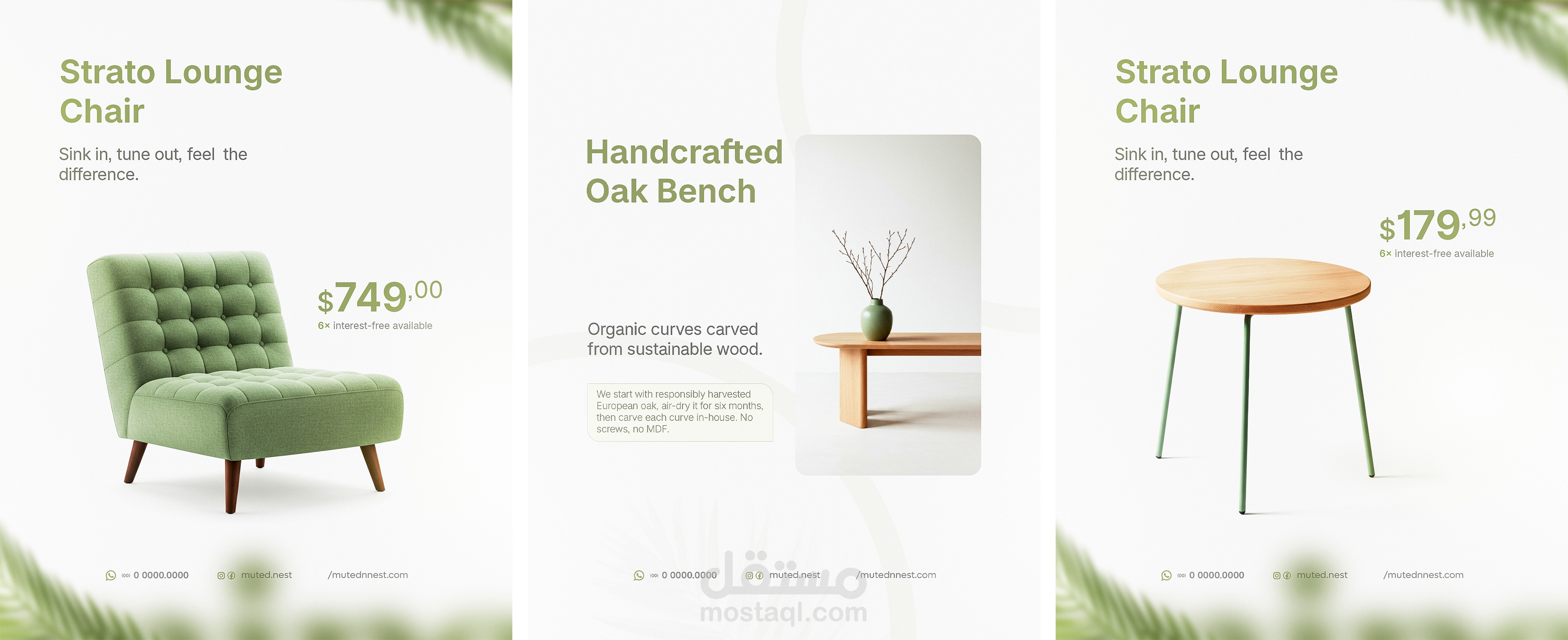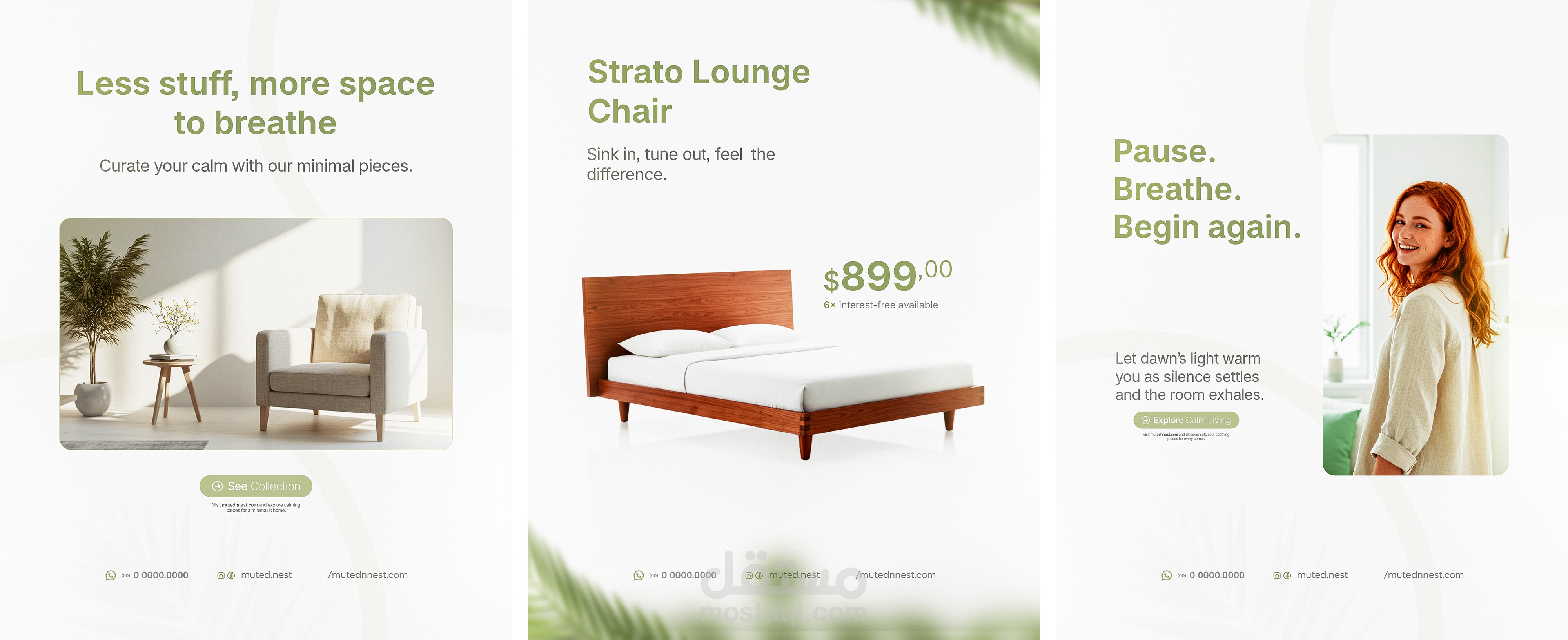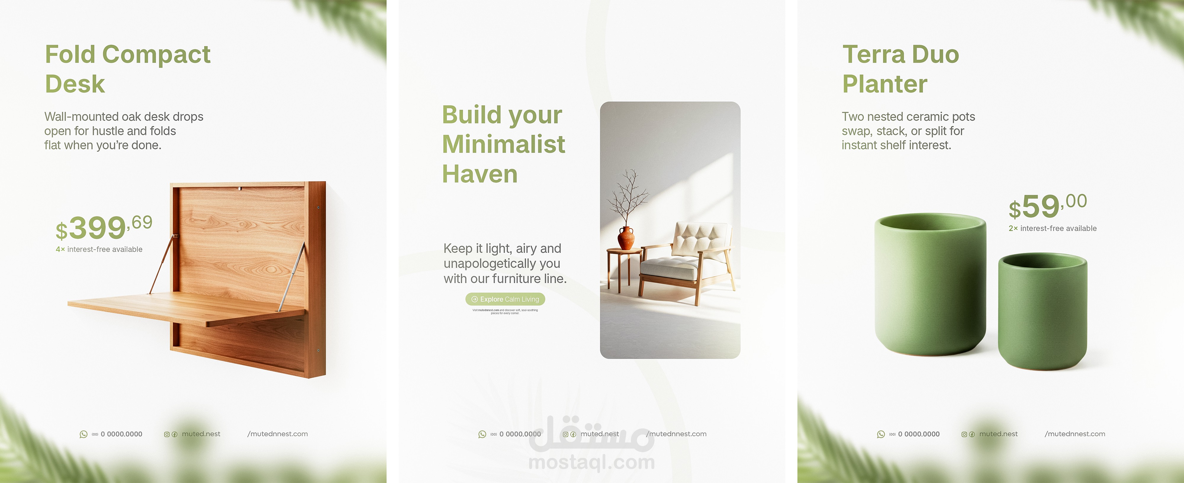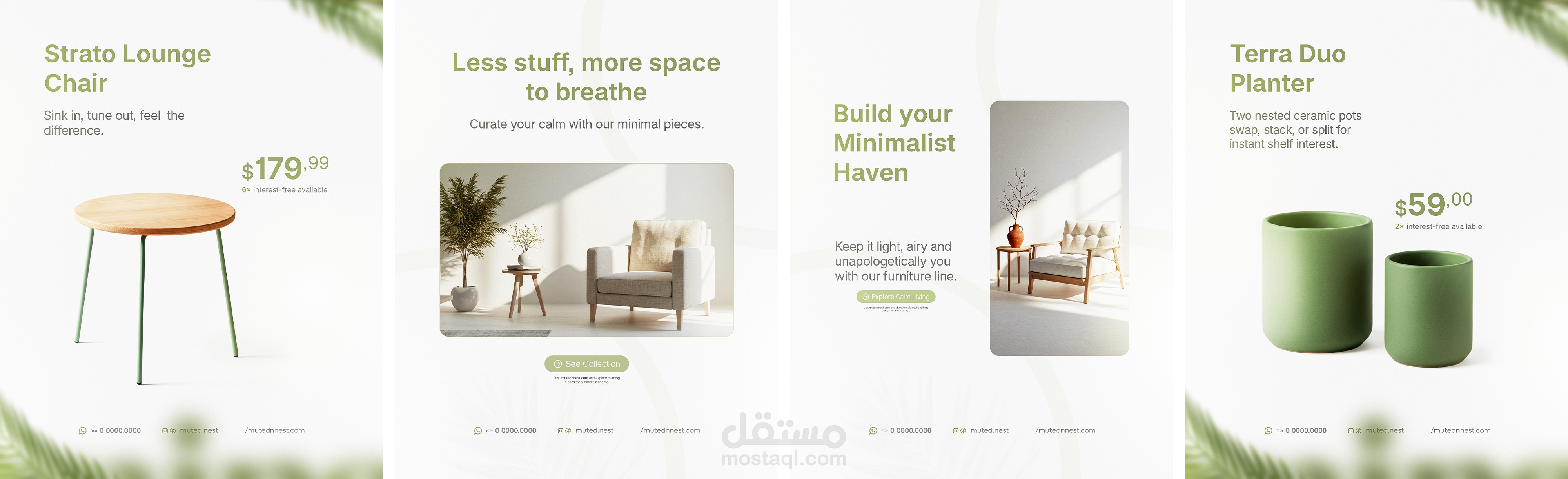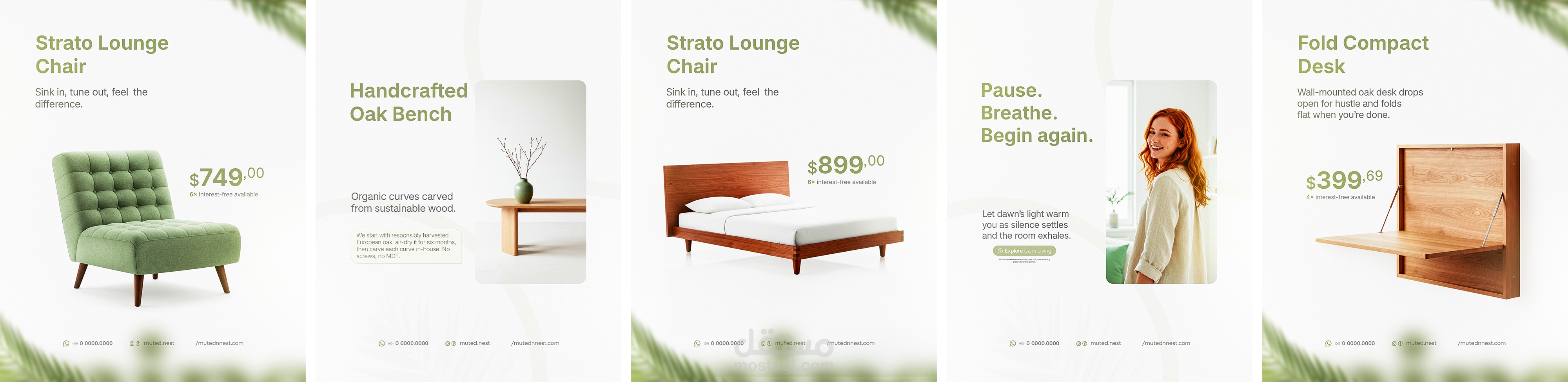 مجموعة مُصمَّمة لعرض قطع أثاث منزلية بسيطة عبر ألوان هادئة، ومساحات بيضاء واسعة، وأسعار واضحة. يركّز كل تصميم على منتج واحد مكتب قابل للطي، كرسي استرخاء، أوعية زرع، أو سرير لإبراز هوية حديثة وهادئة تعكس أسلوب حياة مستدام.