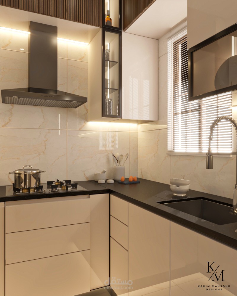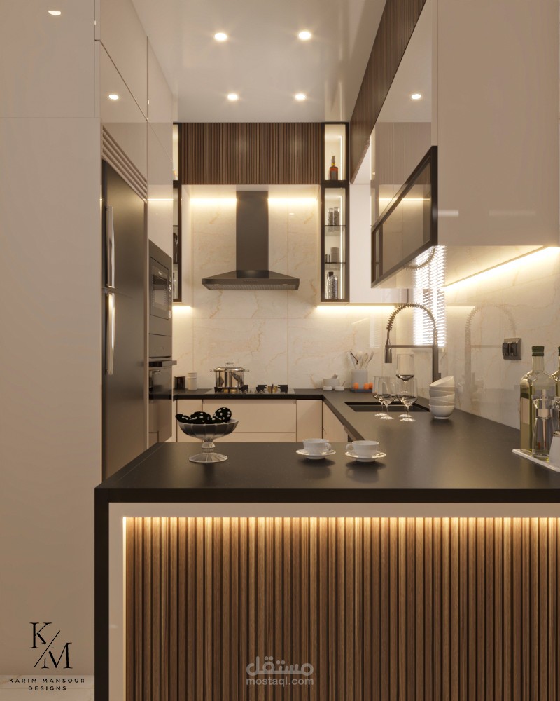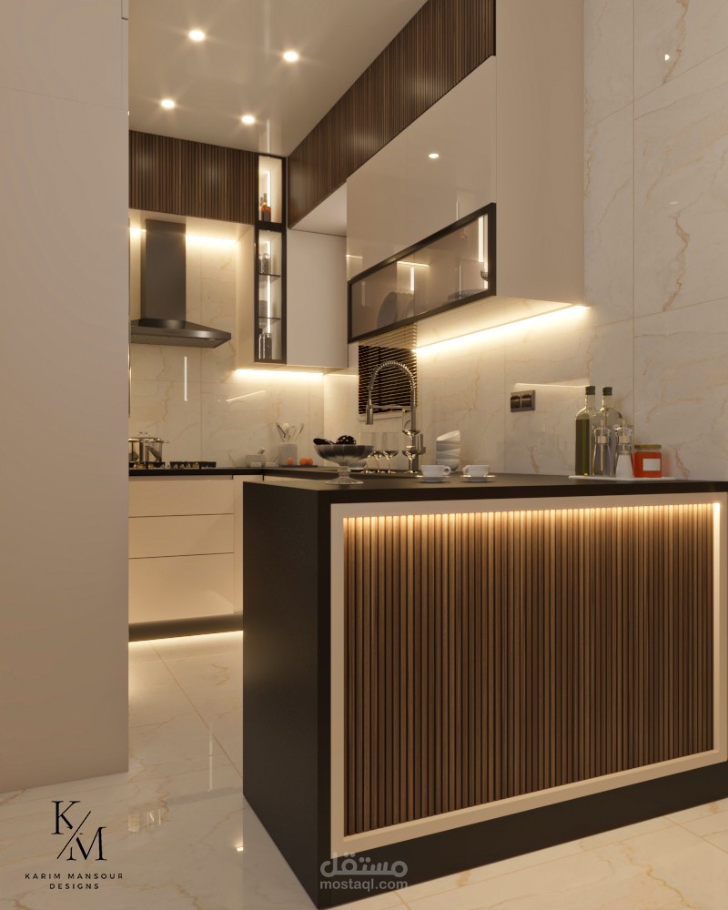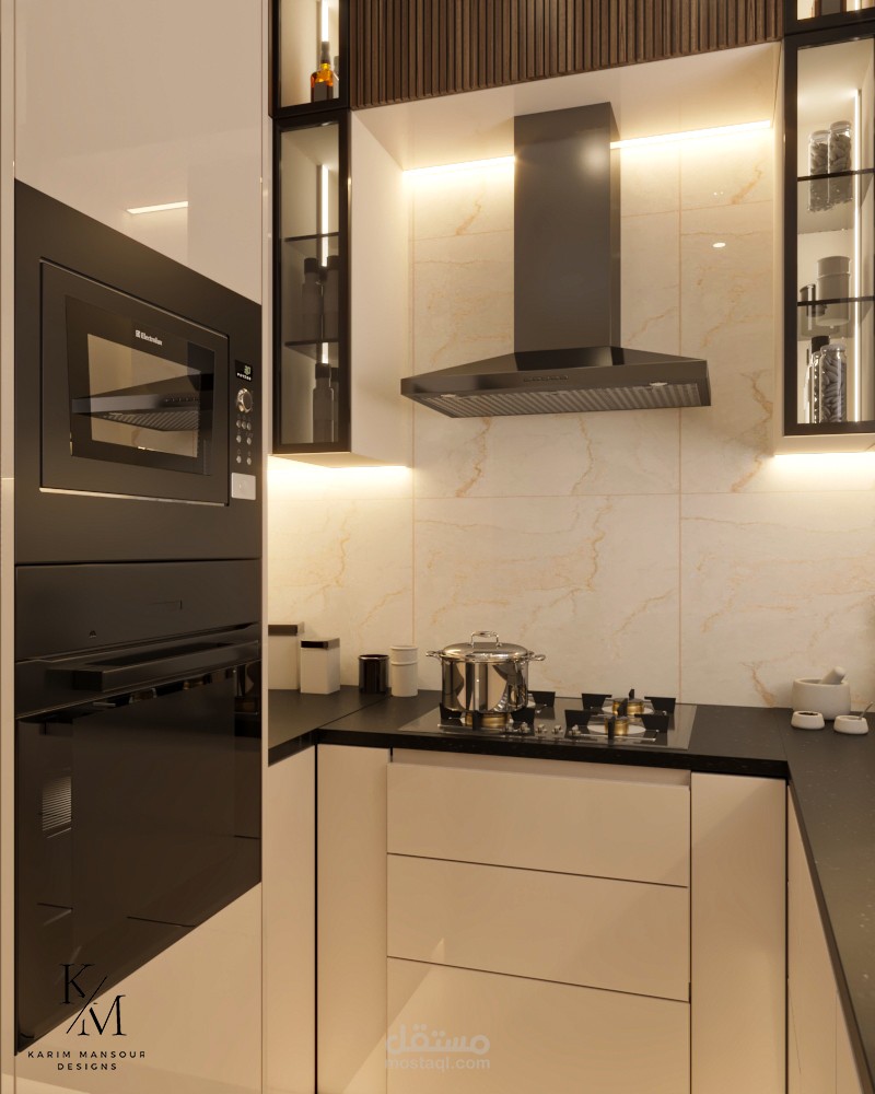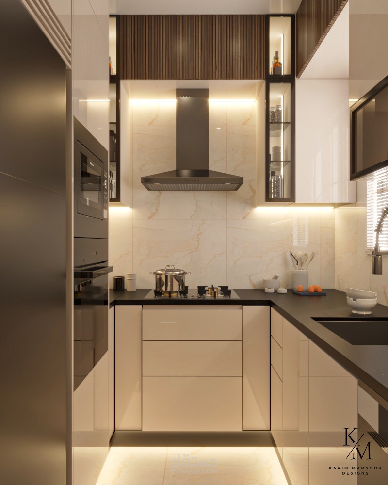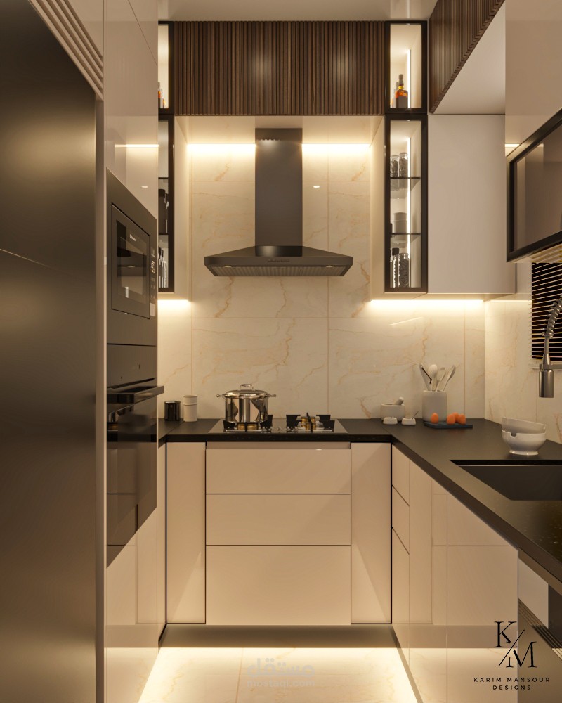 كما تم تزويد المطبخ بـ إضاءة أسفل الوحدات العلوية لتوفير إنارة مباشرة على أسطح العمل، مما يعزز من الراحة البصرية والدقة أثناء التحضير.