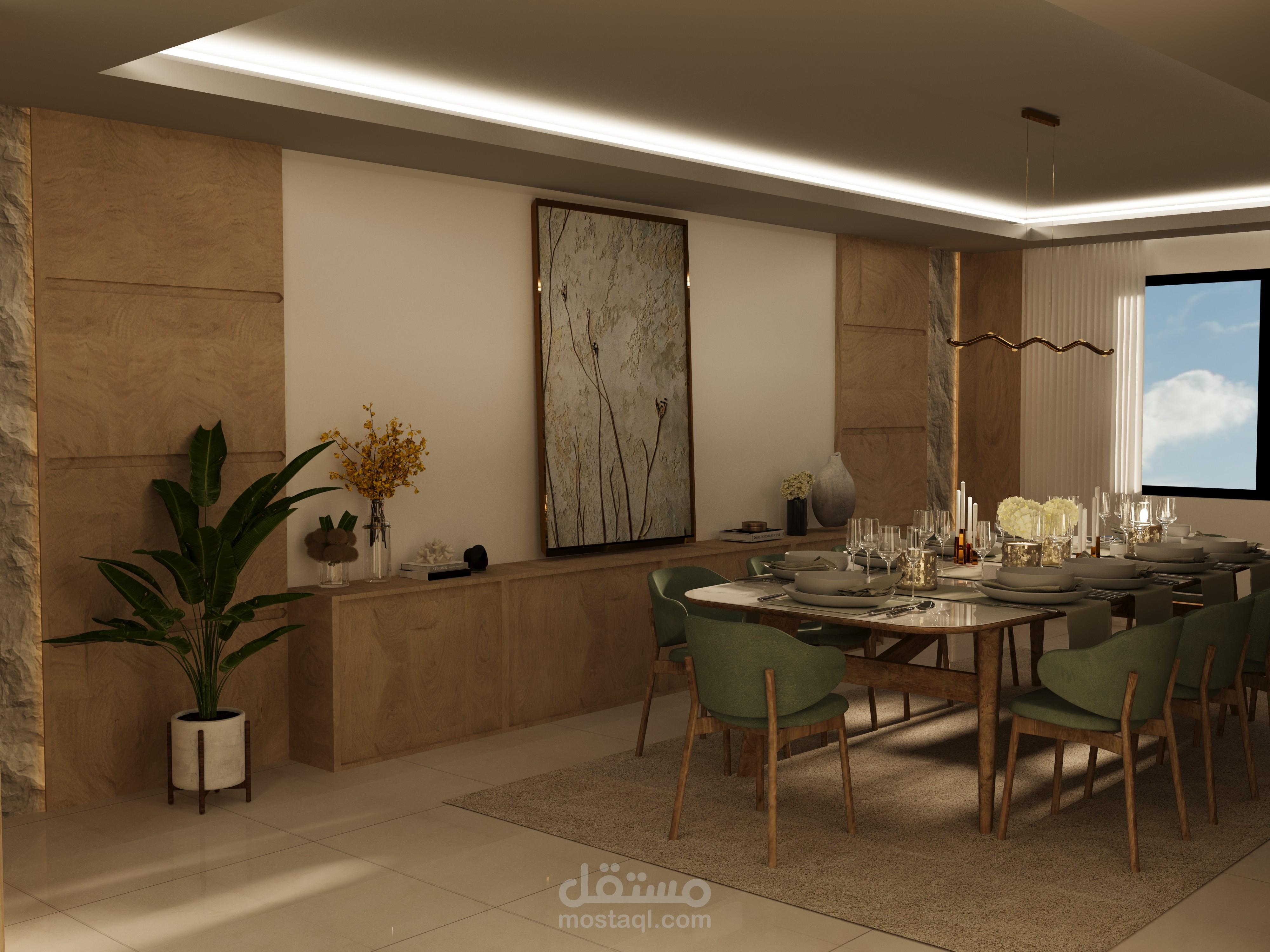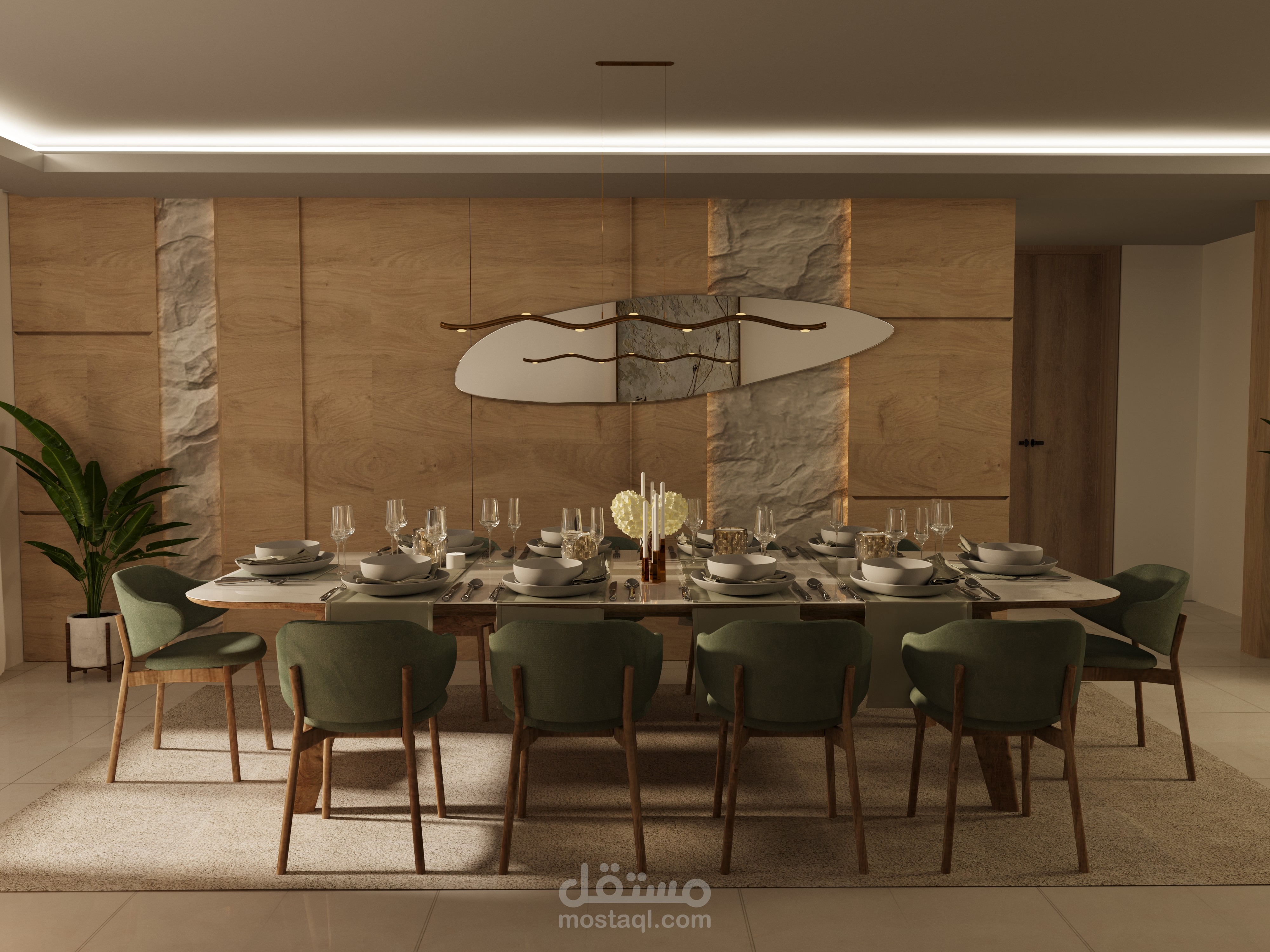 هذا التصميم يعكس أجواء فاخرة ودافئة لغرفة طعام عصرية، تمتزج فيها الخامات الطبيعية بالأناقة الهادئة.