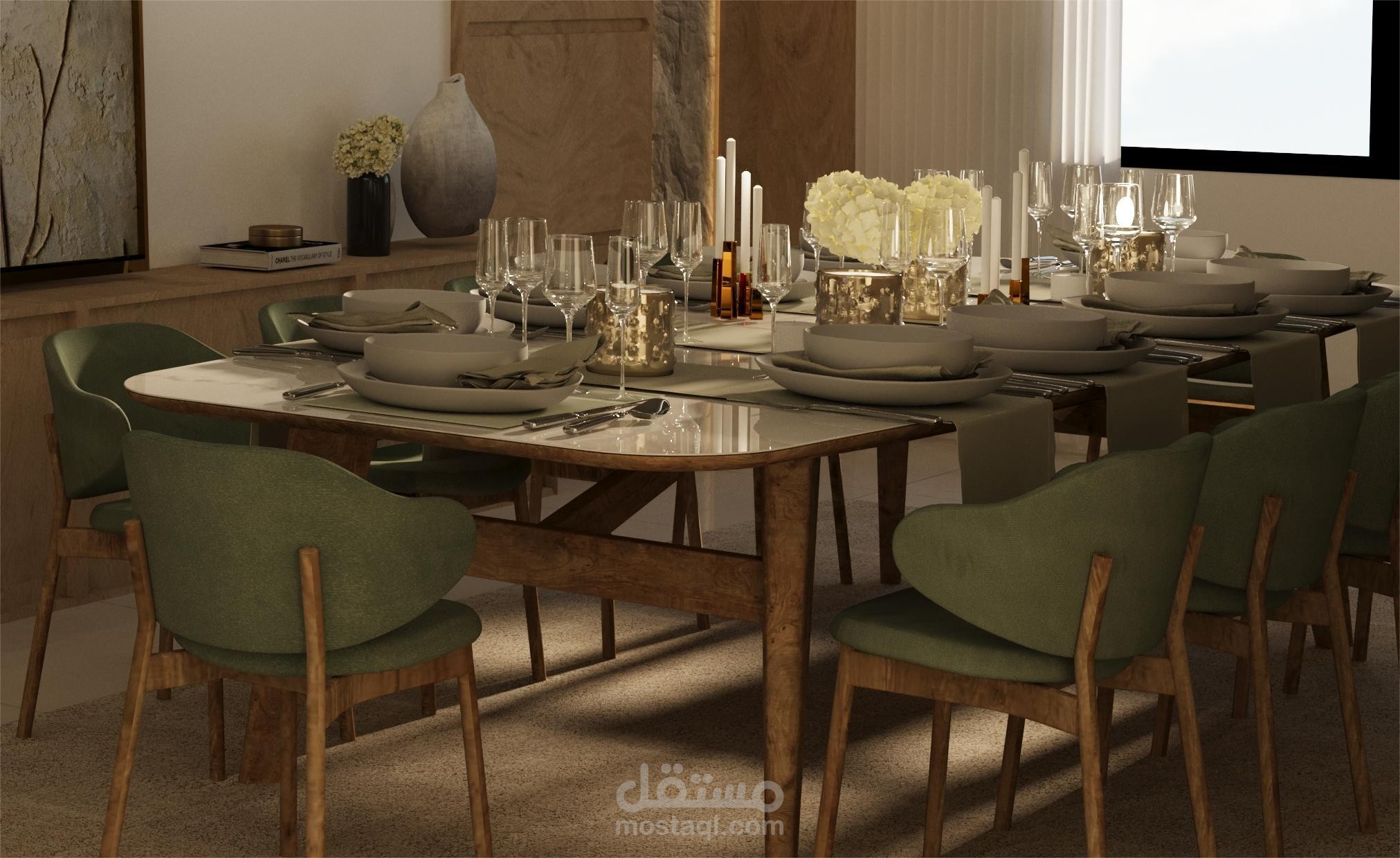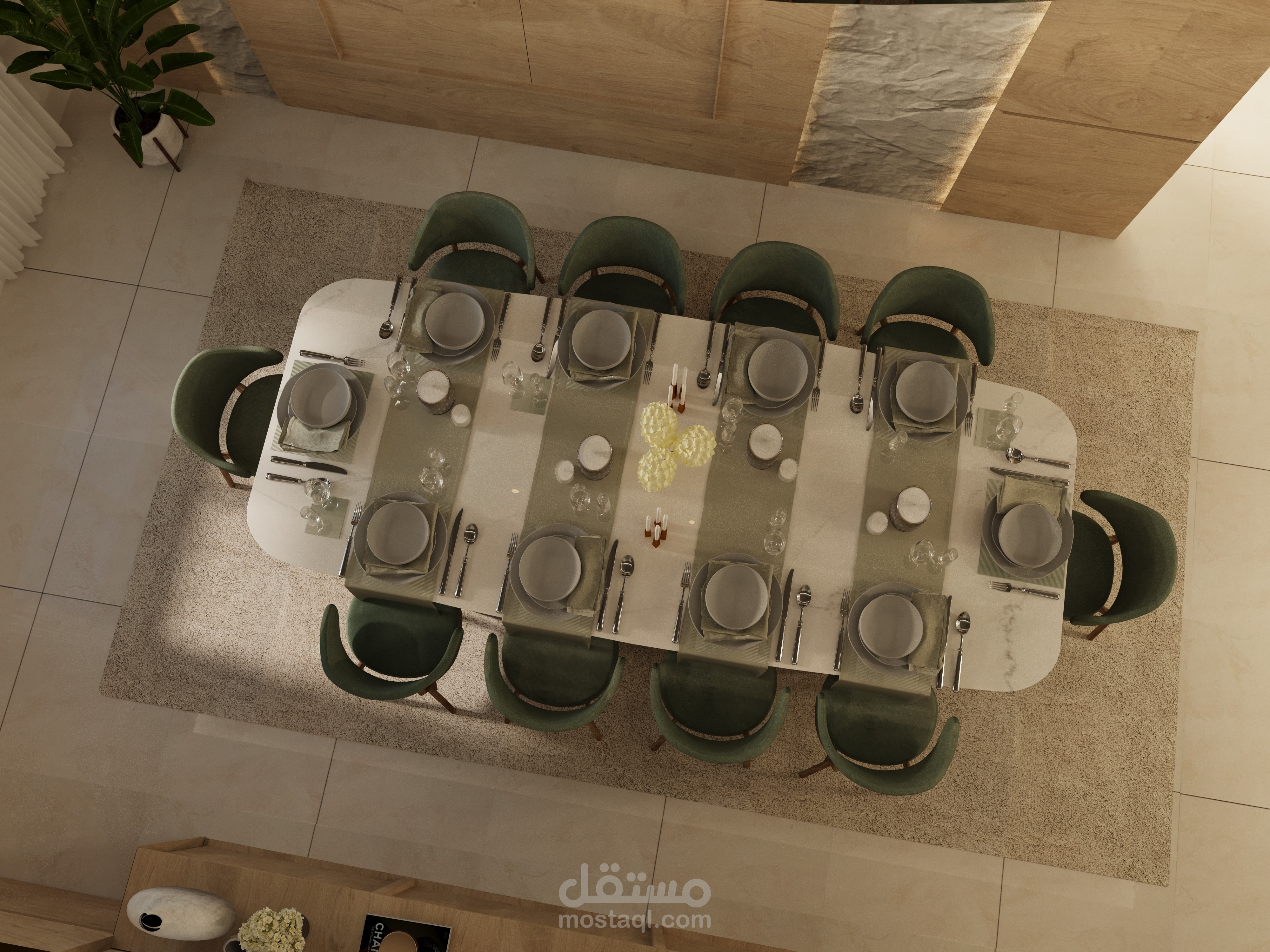 طاولة الطعام كبيرة وفخمة، بسطح رخامي ناعم، تحيط بها كراسي بلمسة مخملية باللون الأخضر الزيتوني مع قواعد خشبية أنيقة.